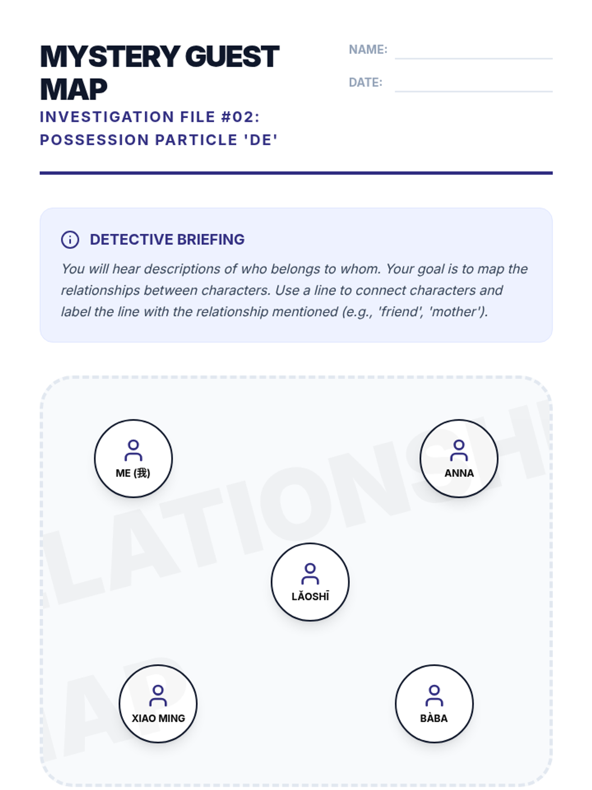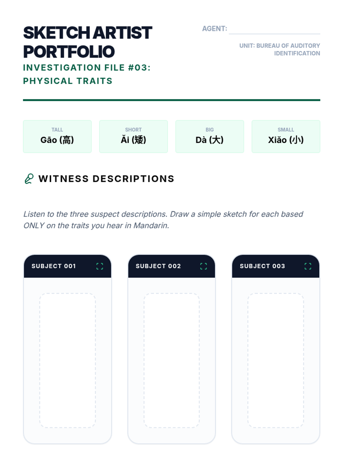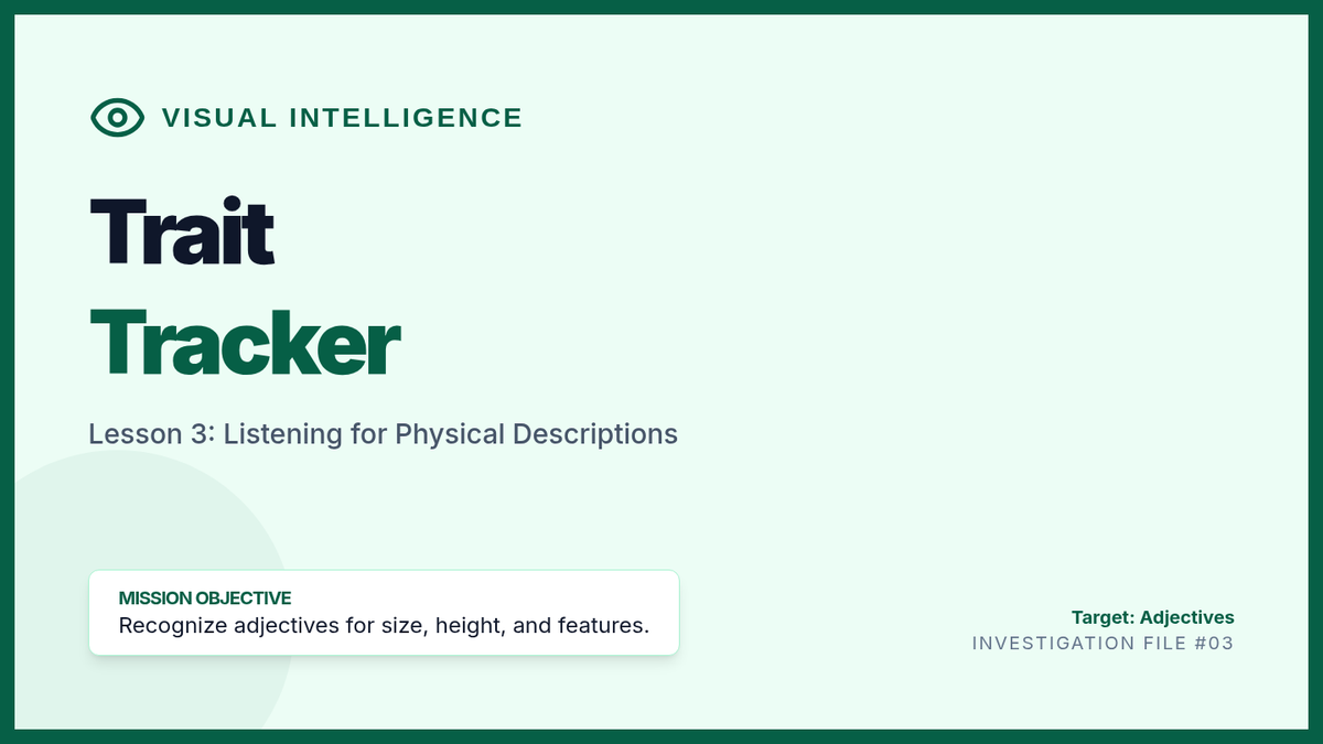 A game-based French listening sequence for 7th graders where students act as detectives to decode physical descriptions, preferences, family ties, and food orders to solve a final mystery.