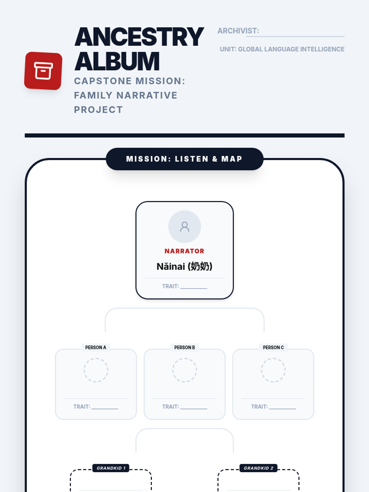 This unit introduces 5th-grade students to Spanish family vocabulary and descriptive adjectives. Students learn to use the verb 'ser' and possessive adjectives to describe kinship and physical traits through case studies and creative projects.