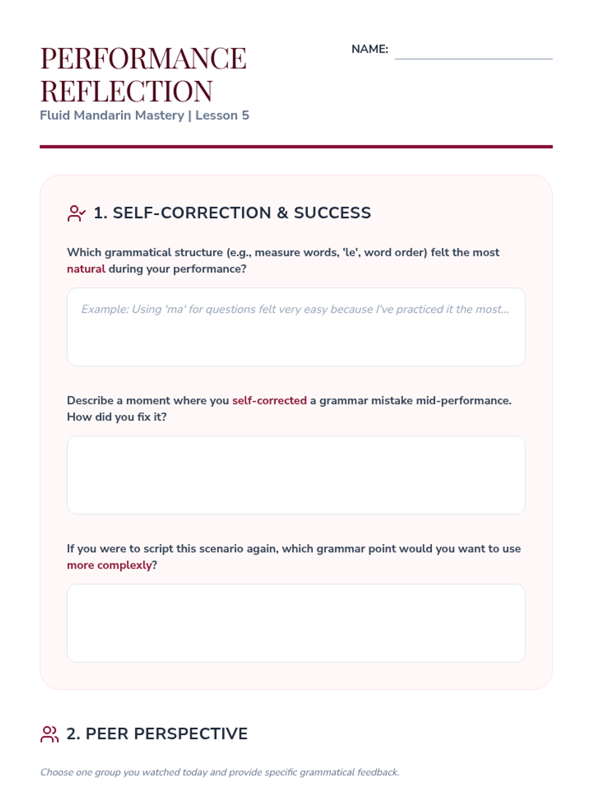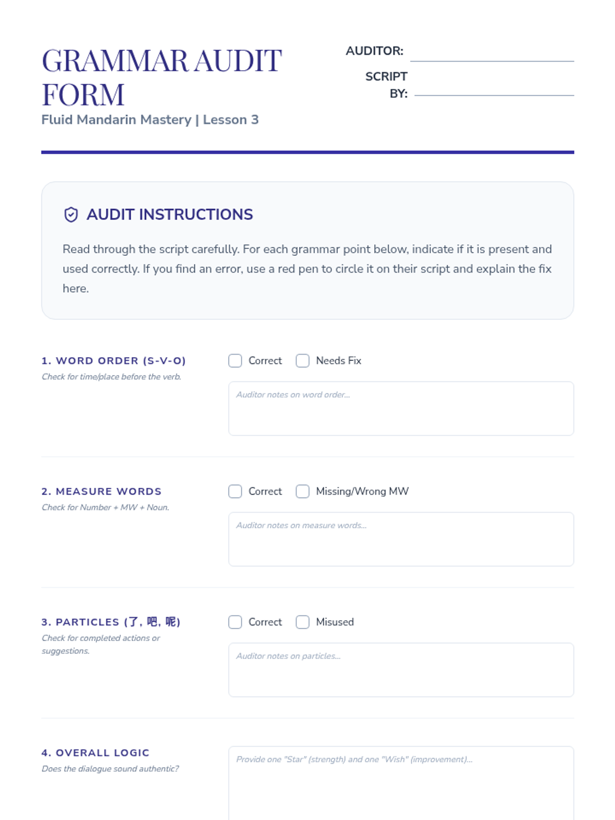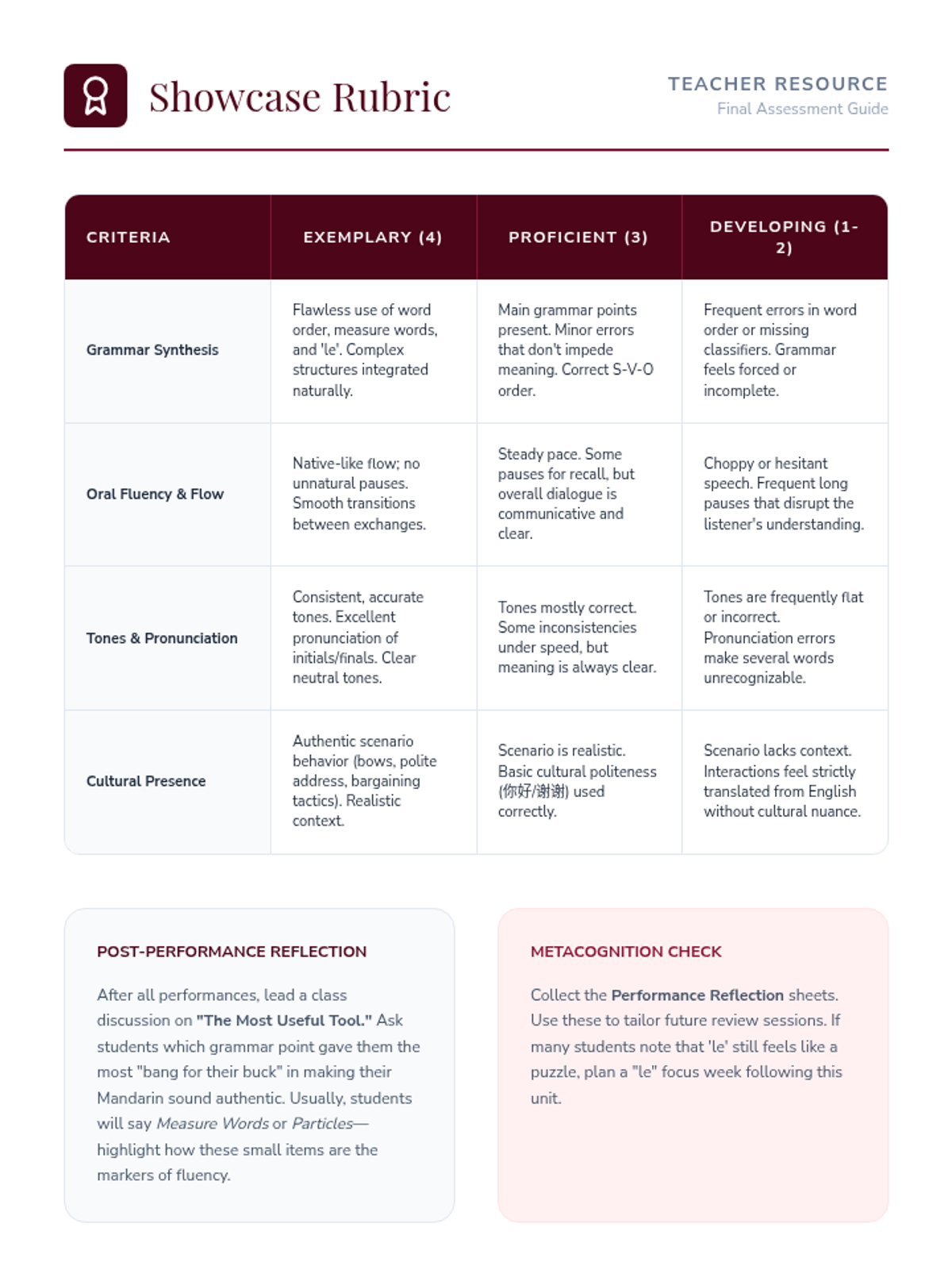 This 12th-grade Mandarin Chinese sequence focuses on synthesizing basic grammar points (word order, measure words, particles, and questions) into authentic communication. Students engage in a project-based learning journey, scripting and performing realistic scenarios while utilizing peer review to refine their grammatical precision.