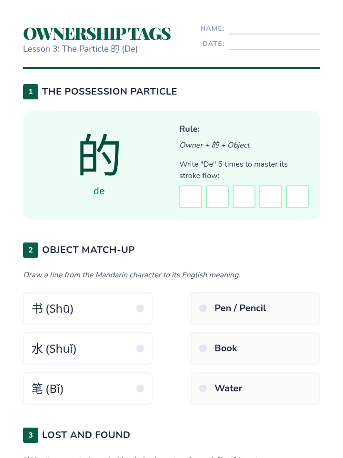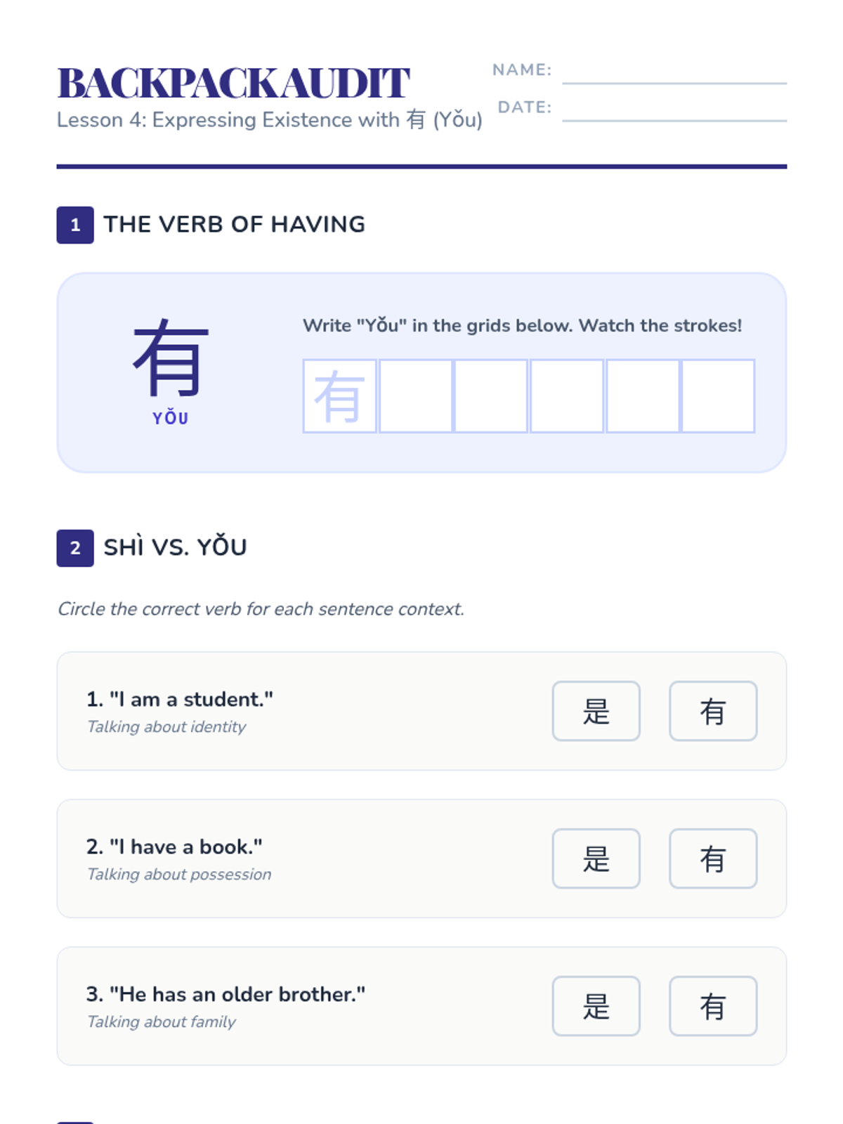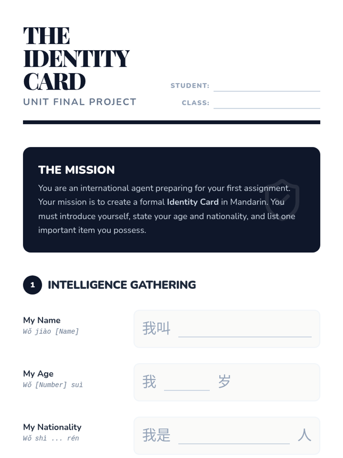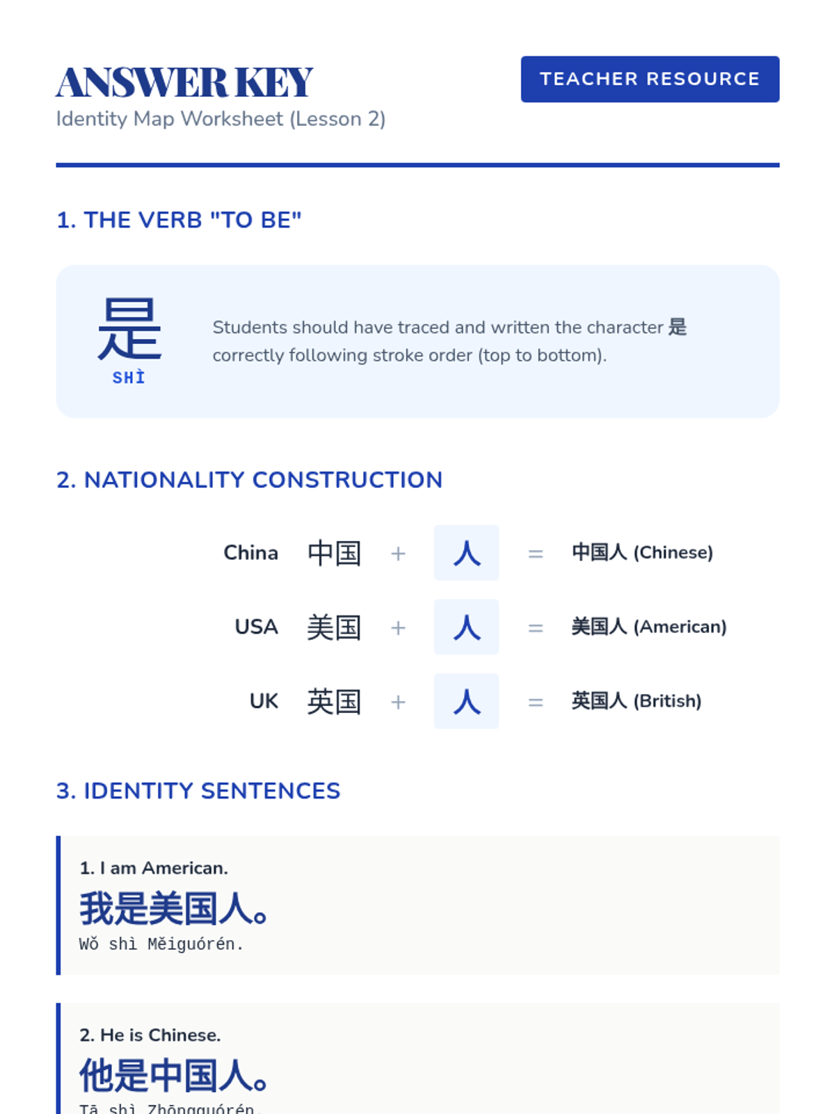 A 5-lesson sequence for 6th Grade Mandarin Chinese focusing on pronouns, basic sentence structures (SVO), and personal introductions using high-frequency characters. Students progress from individual characters to full sentence construction and identity expression.