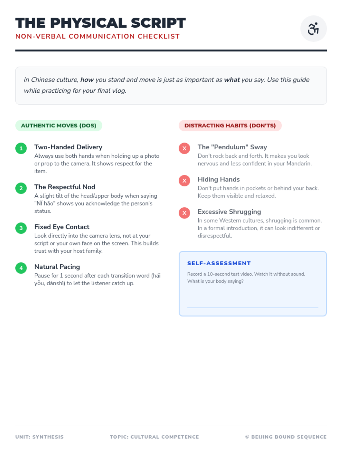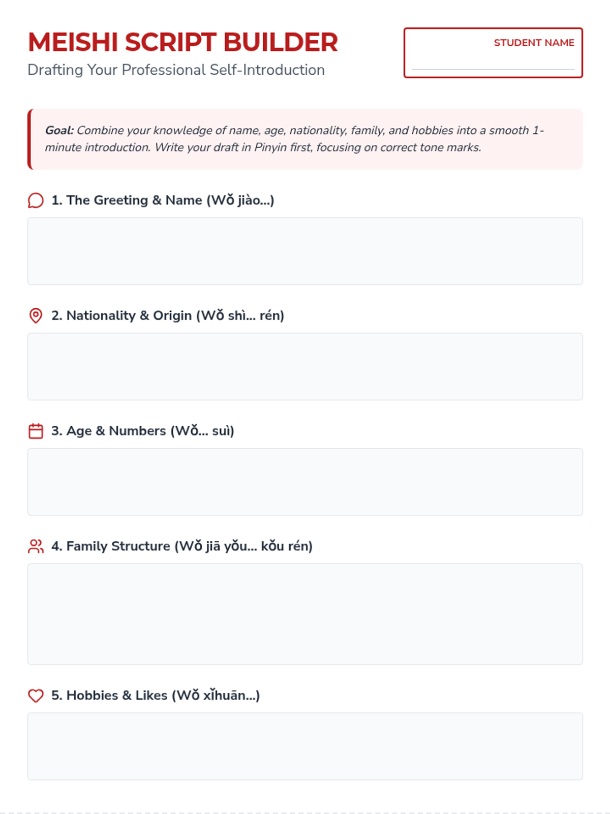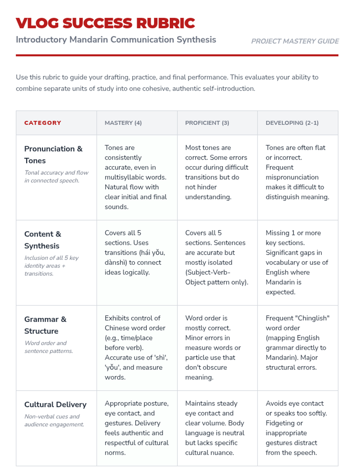 This final sequence for 9th-grade Mandarin students synthesizes foundational phonetics, greetings, numbers, and family vocabulary. Students transition from isolated sentences to a coherent personal narrative through project-based learning, culminating in a professional video introduction (vlog) for a hypothetical host family.