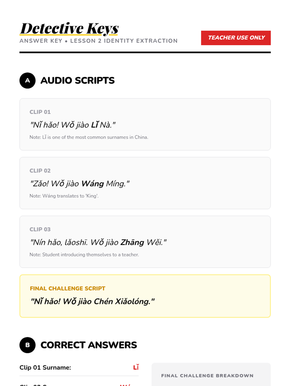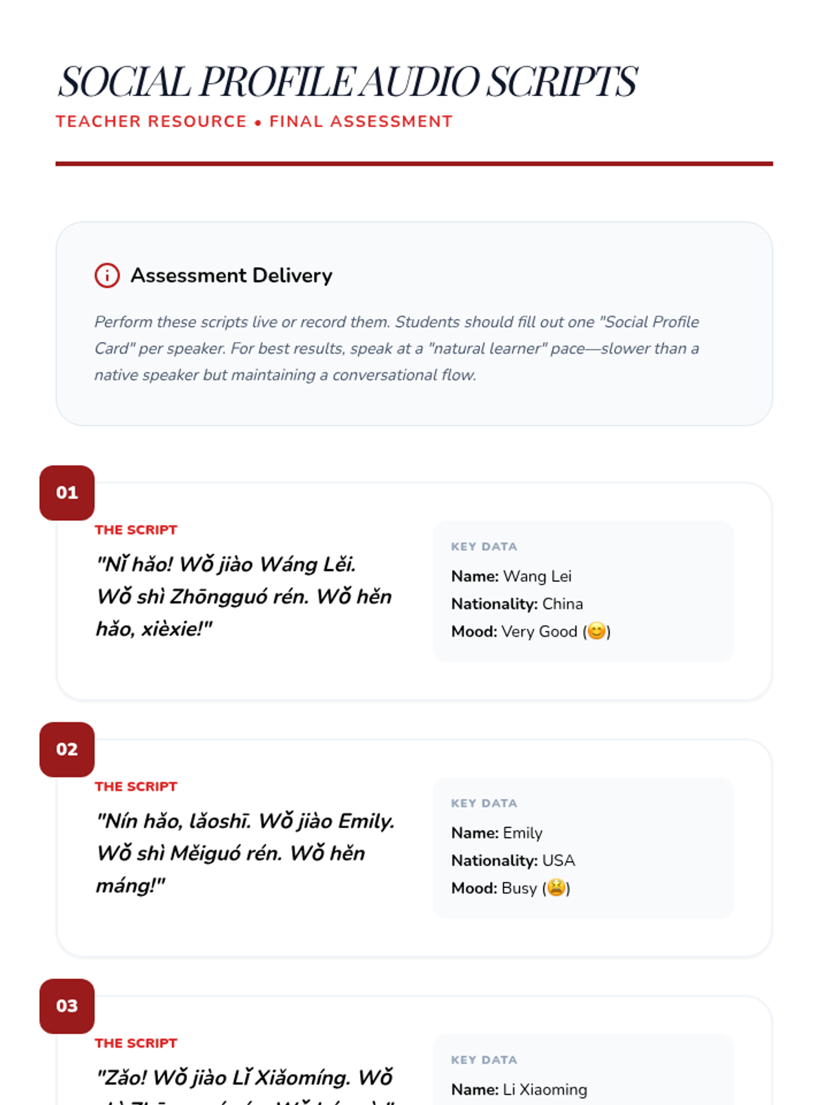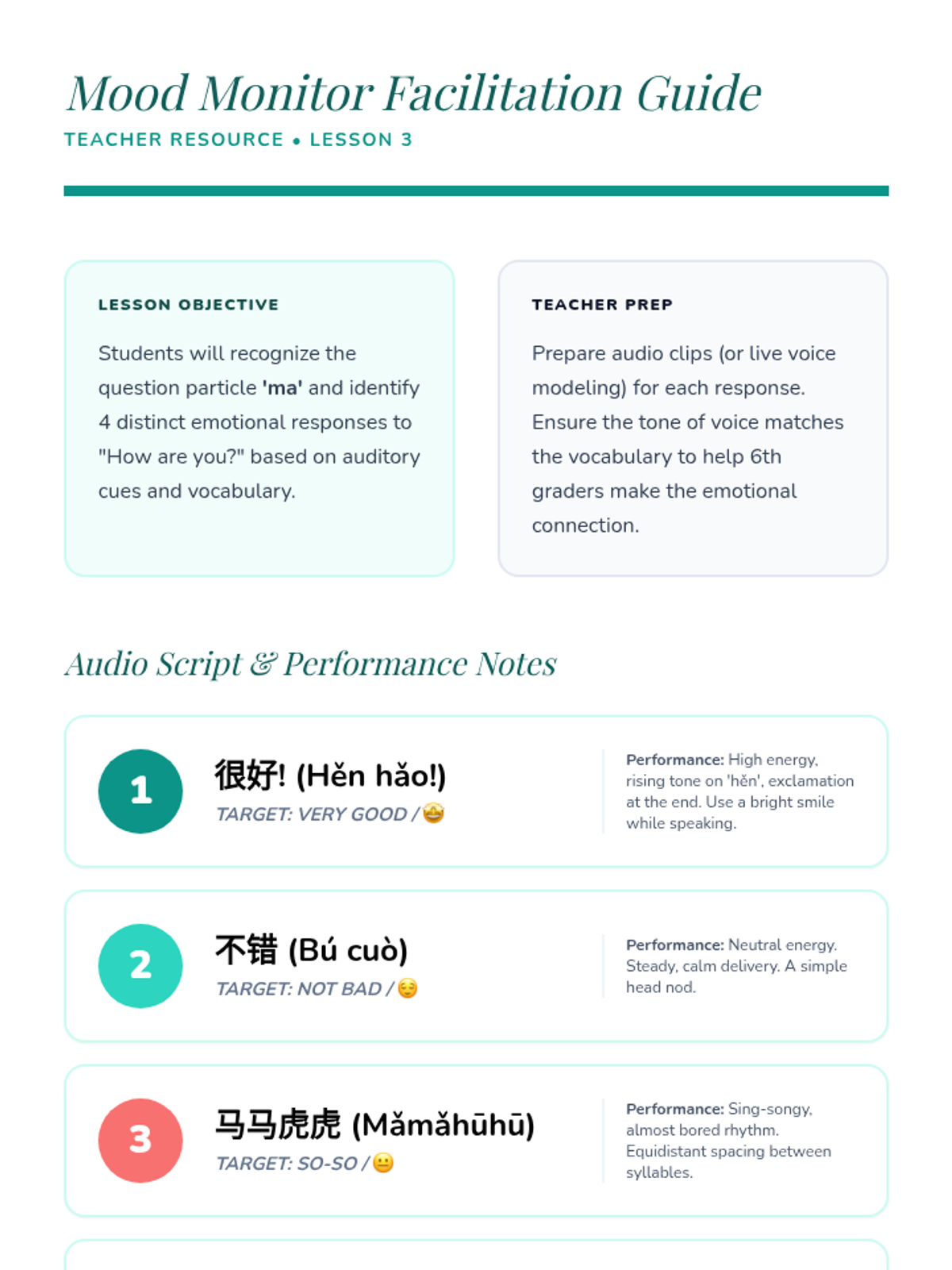 A 5-lesson sequence for 6th-grade students focusing on beginner Mandarin listening skills for greetings and introductions. Students progress from basic hellos to complex introduction dialogues, emphasizing formality, tone, and information extraction.