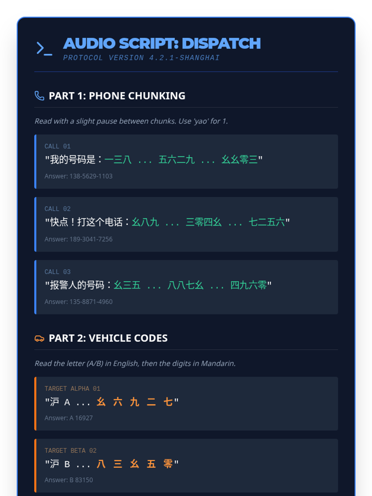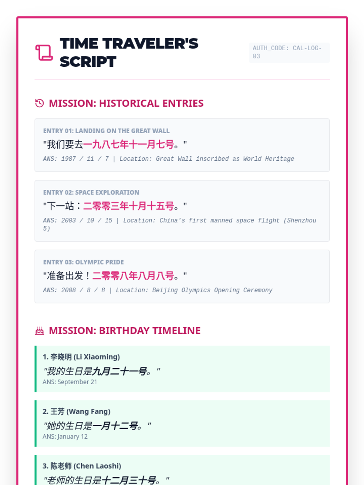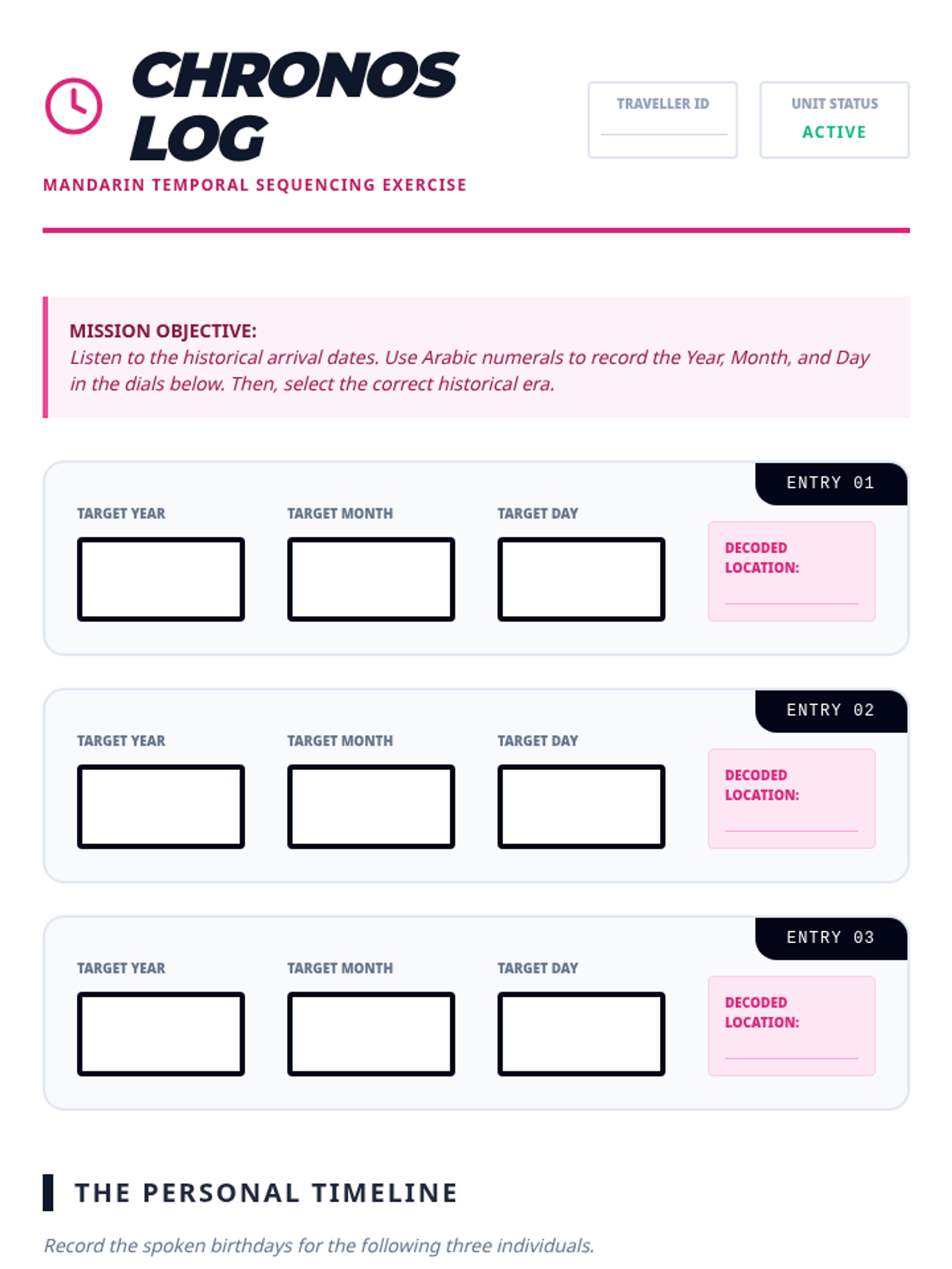 This sequence focuses on the cognitive processing of numerical data in Mandarin Chinese, moving from basic digits to complex phone numbers, calendar dates, clock times, and marketplace currency. Students will develop rapid auditory recognition through gamified scenarios like emergency dispatch, time travel, and transit scheduling.