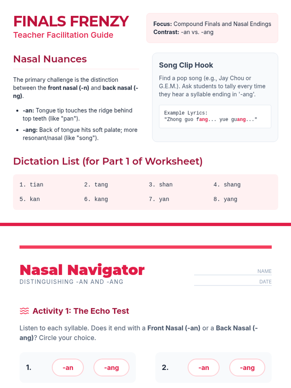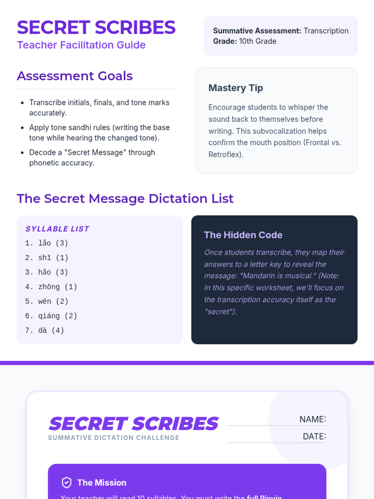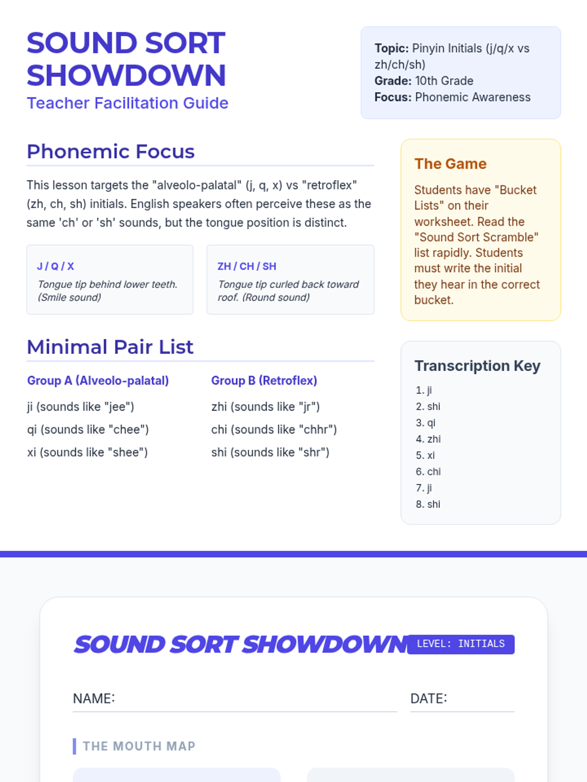This sequence introduces 10th-grade students to the fundamentals of Mandarin Chinese phonetics, focusing on tone discrimination, initial/final differentiation, and transcription. Students progress from isolated tones to complex pairs and full Pinyin transcription.