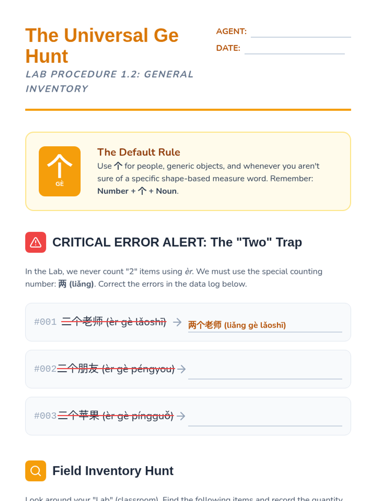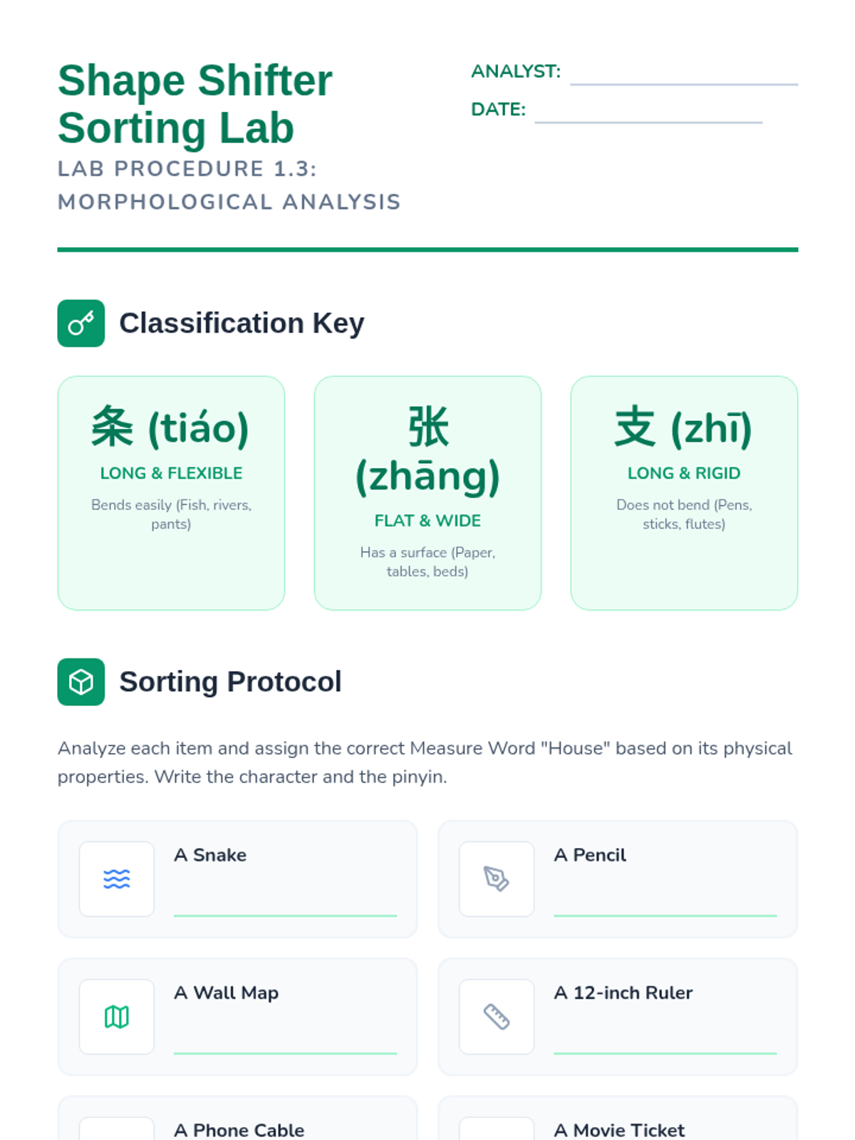A comprehensive introduction to Mandarin Chinese measure words for 6th graders, using a 'scientific classification' theme to help students categorize nouns by shape and type.