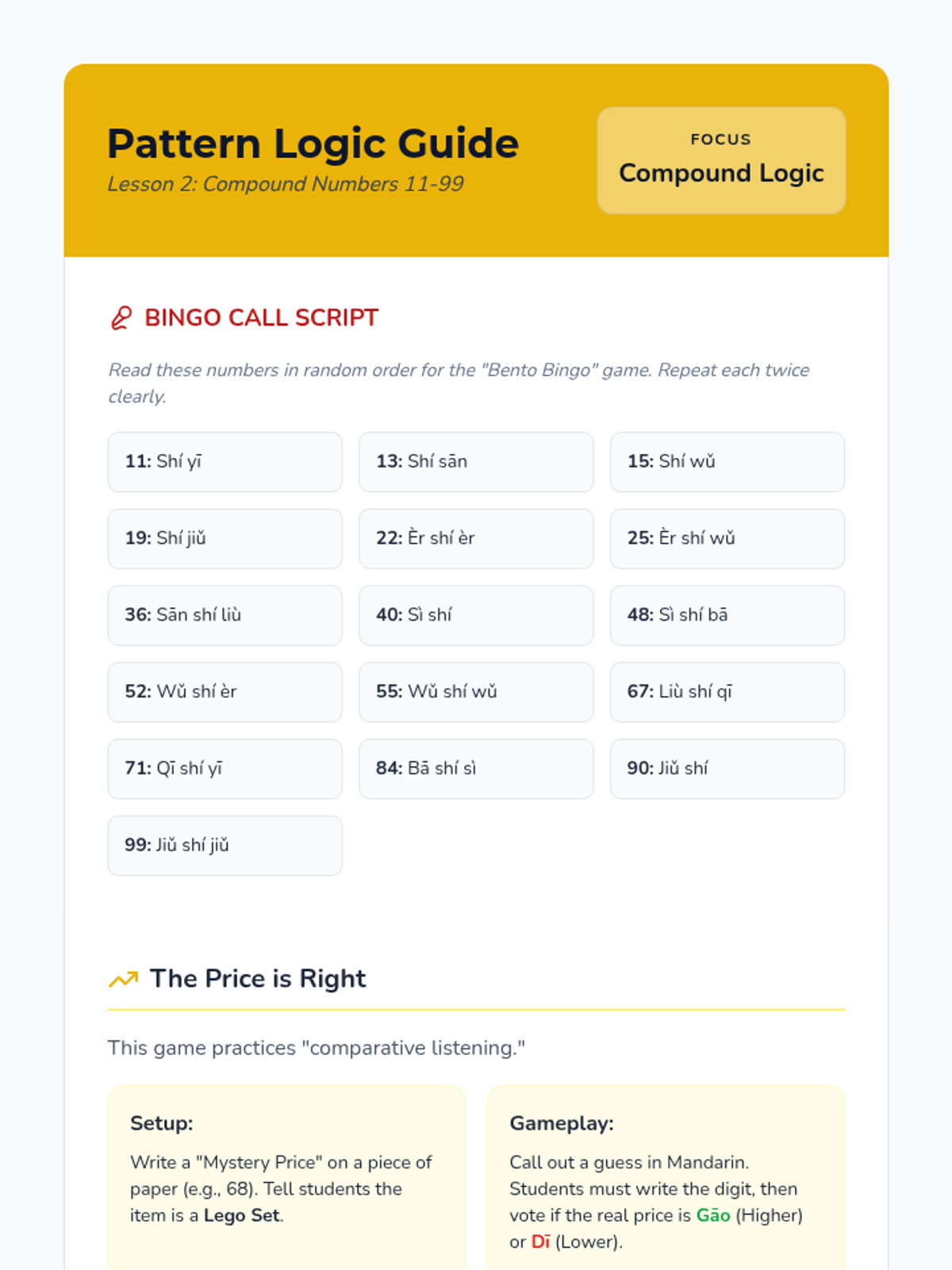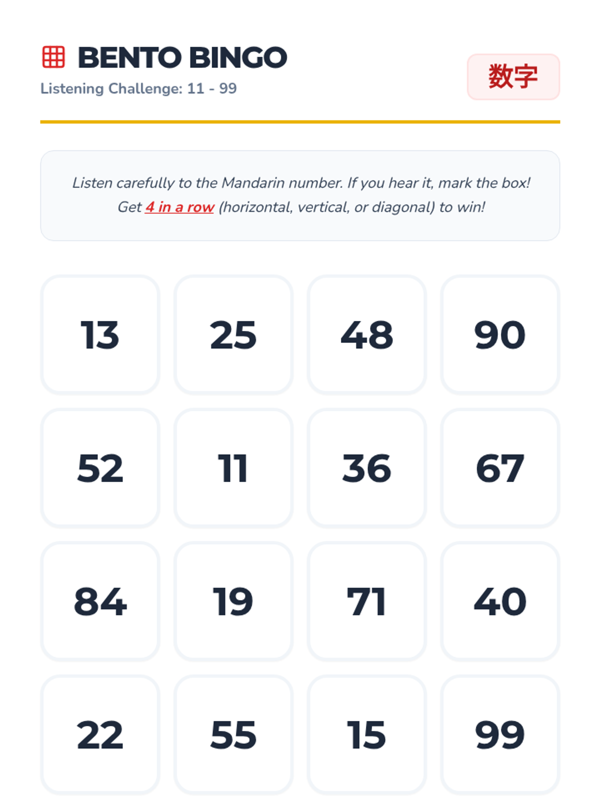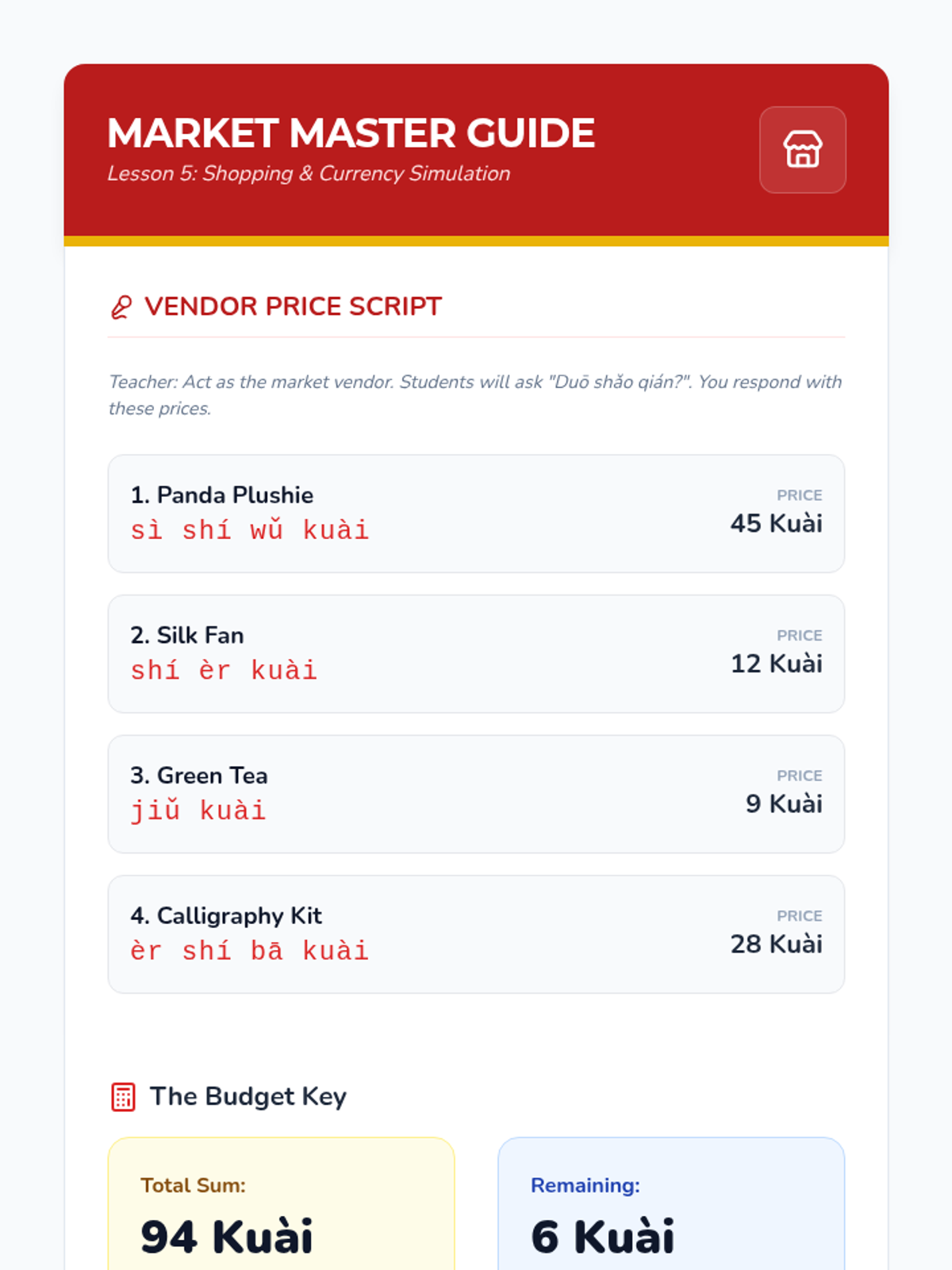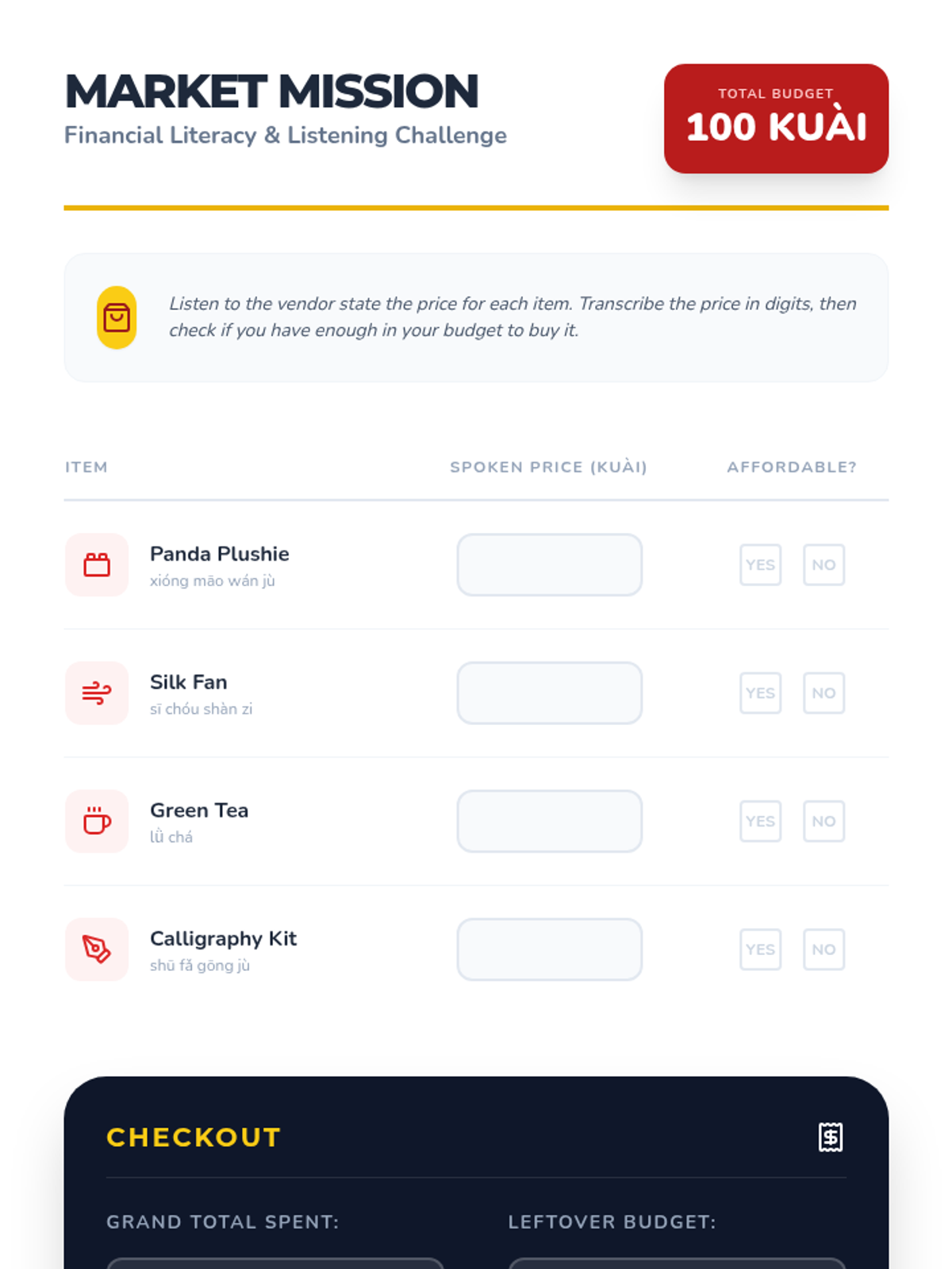 A game-based introduction to Mandarin Chinese numbers, dates, and currency for 5th graders. Students build auditory recognition skills from single digits to complex transactions.