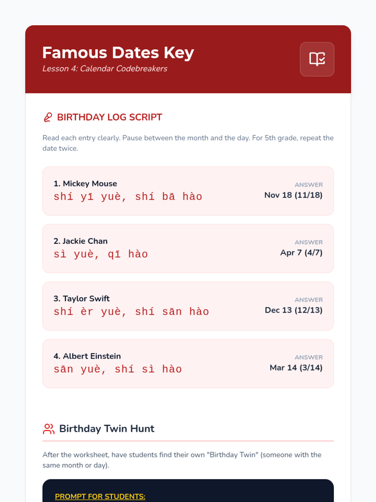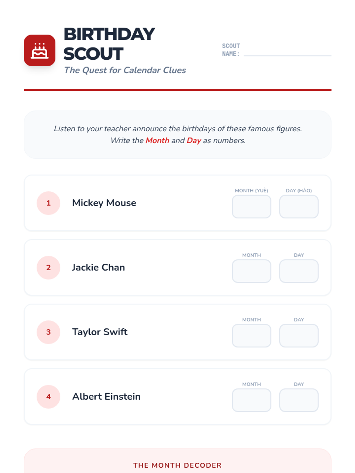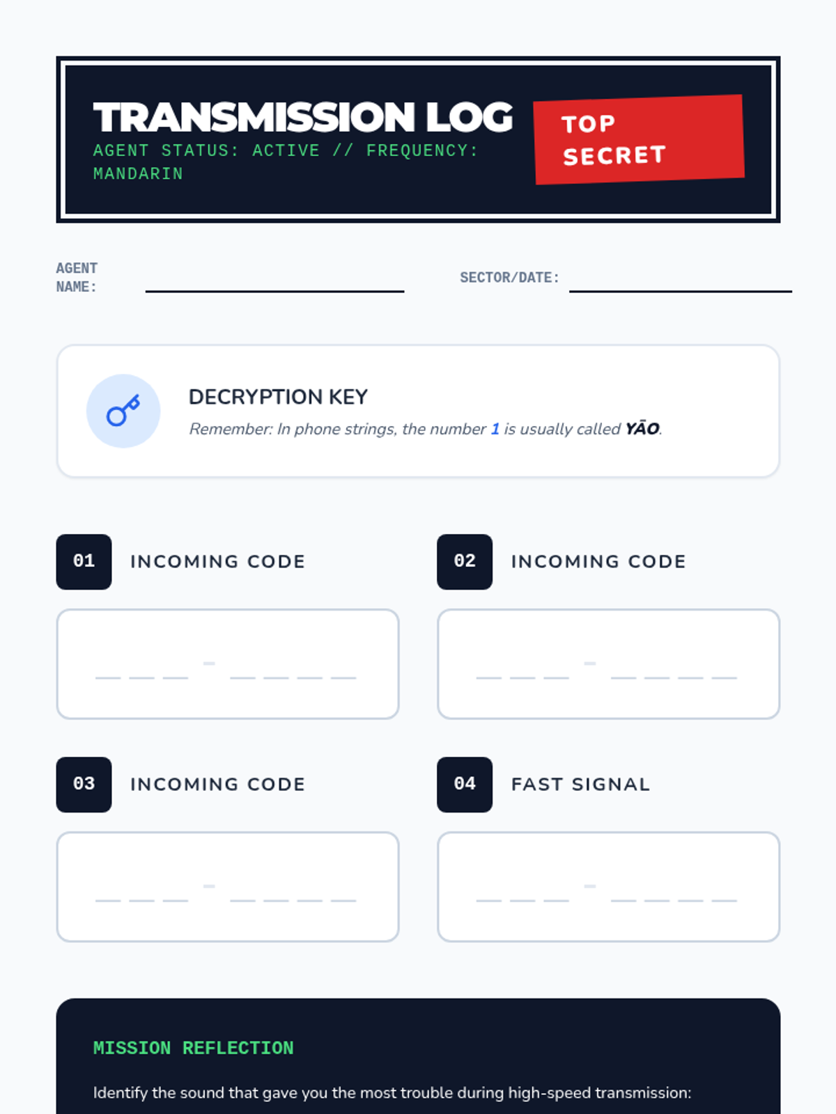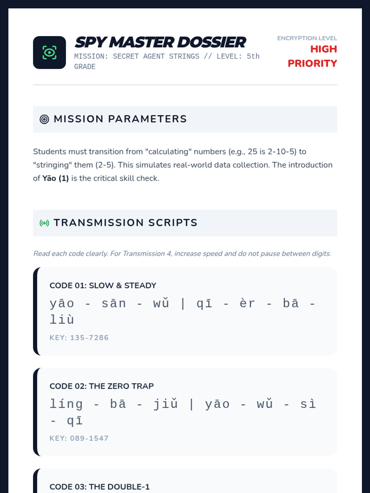 A game-based introduction to Mandarin Chinese numbers, dates, and currency for 5th graders. Students build auditory recognition skills from single digits to complex transactions.