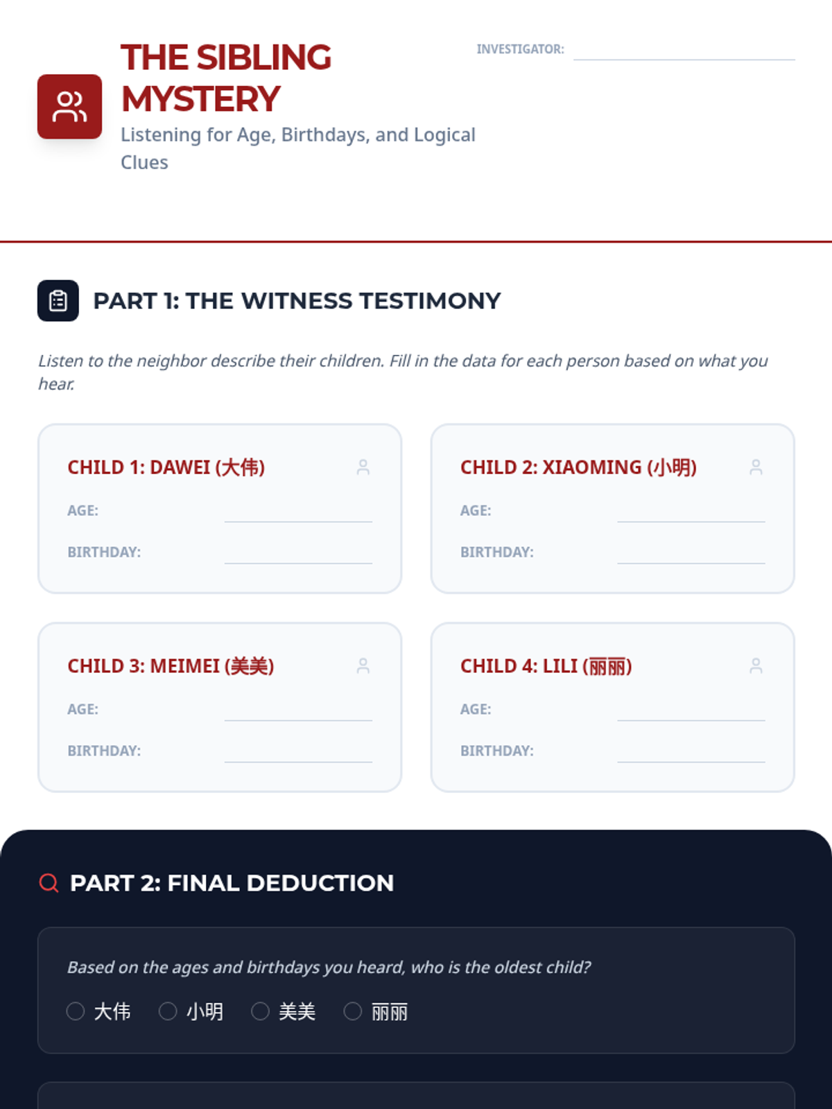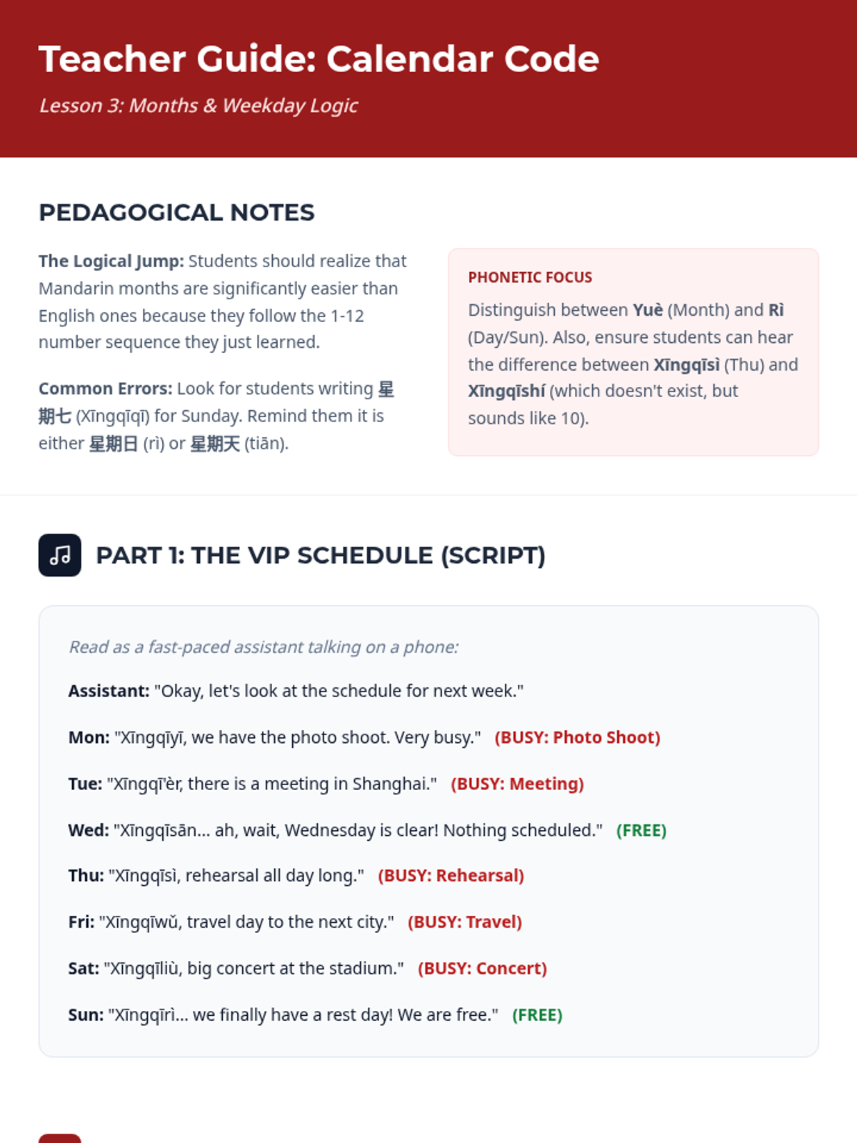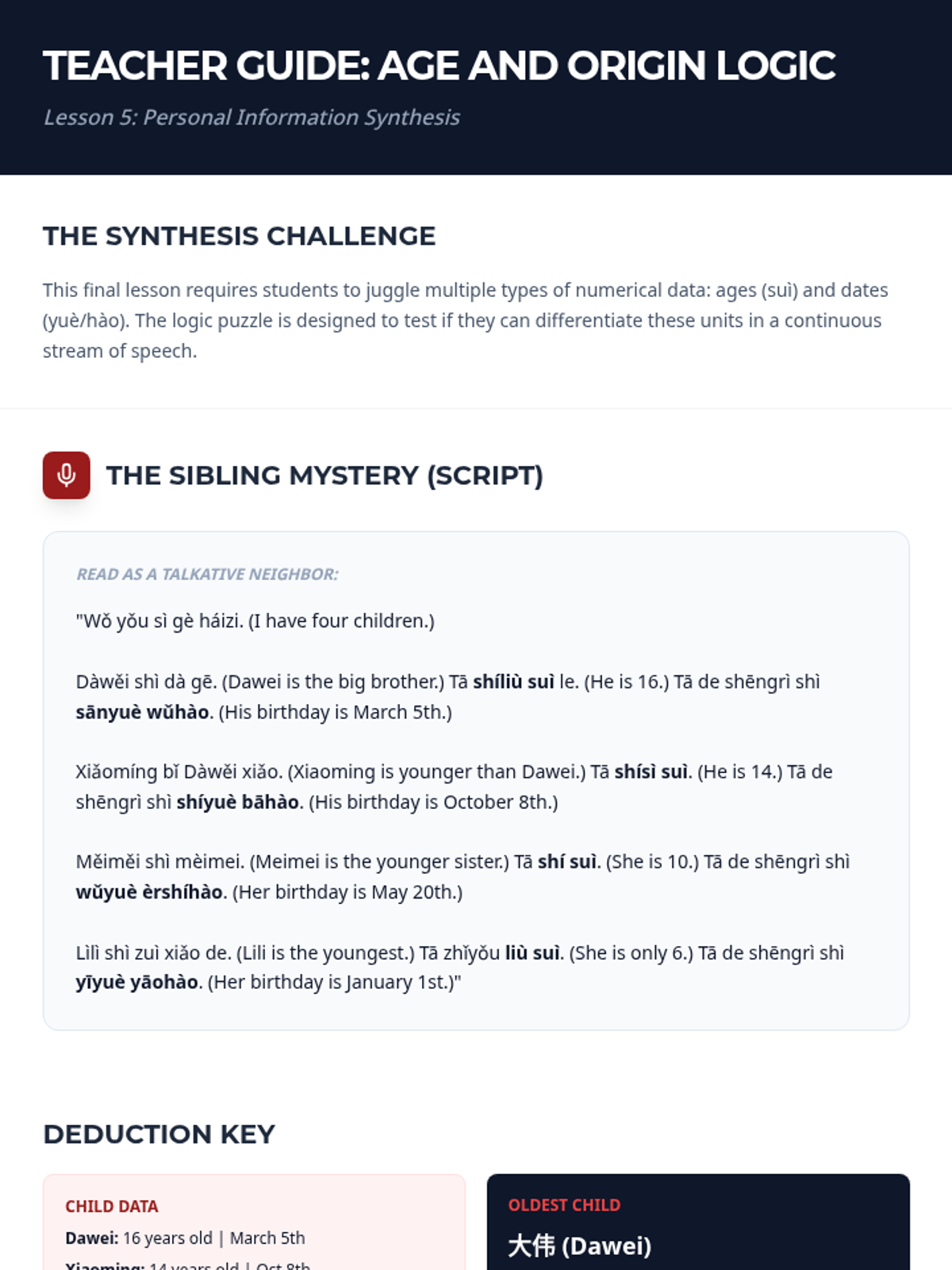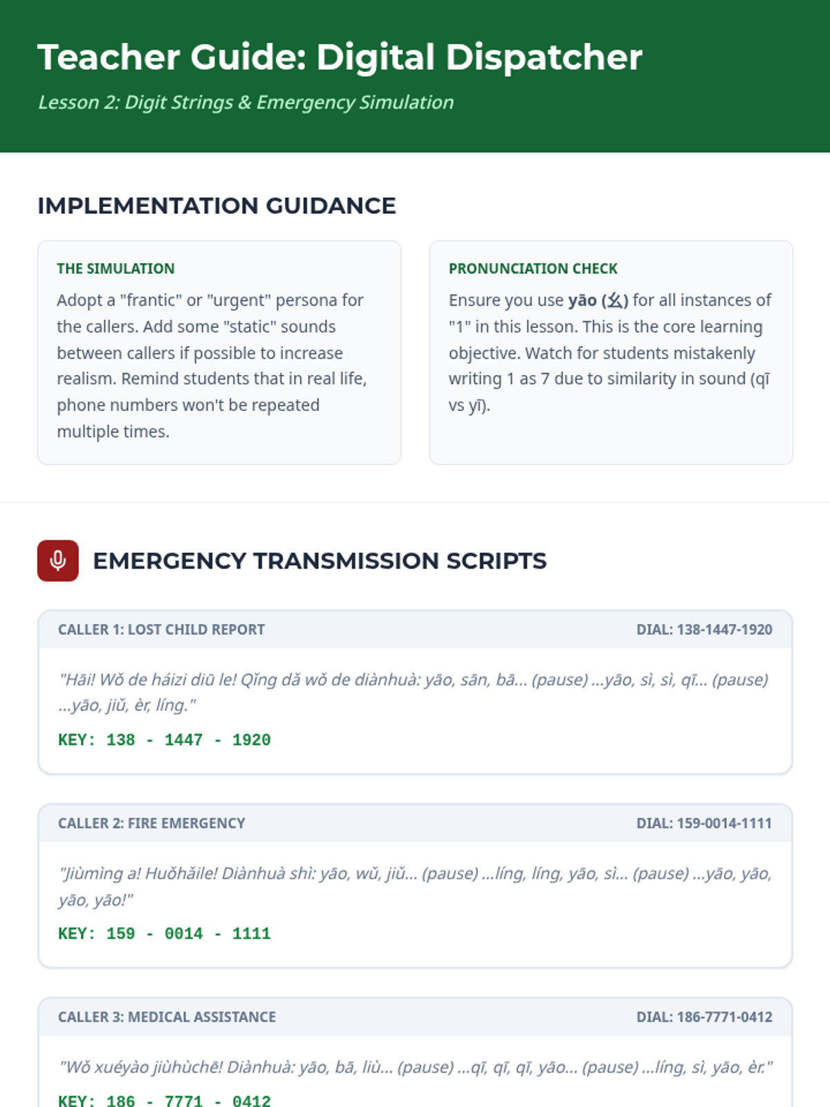 This sequence focuses on the auditory recognition of numerical patterns in Mandarin Chinese, essential for understanding prices, phone numbers, dates, and time. Students leverage the logical structure of Mandarin counting to progress from basic digits to complex date and time formatting.