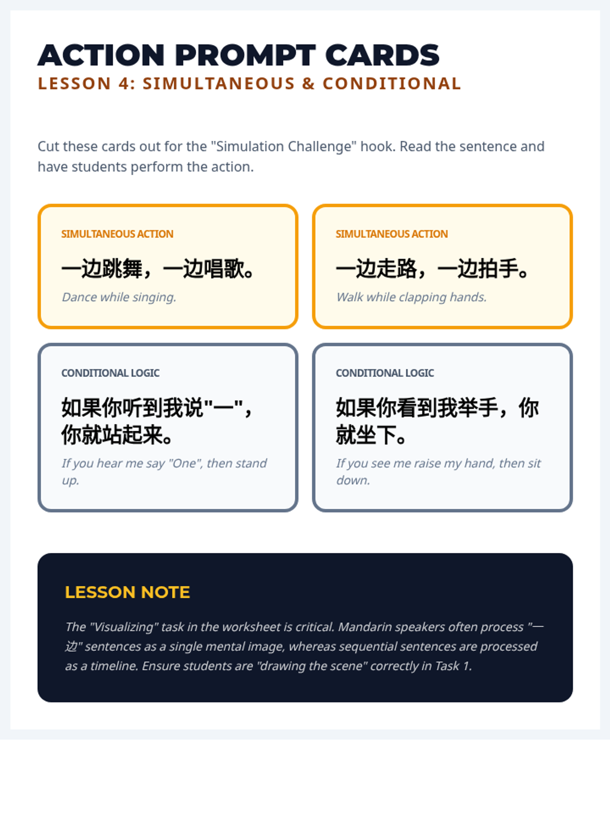 A high-energy Mandarin Chinese sequence for Pre-K students using the Total Physical Response (TPR) method. Students learn to respond to physical commands and action verbs through games and movement, building direct meaning without translation.