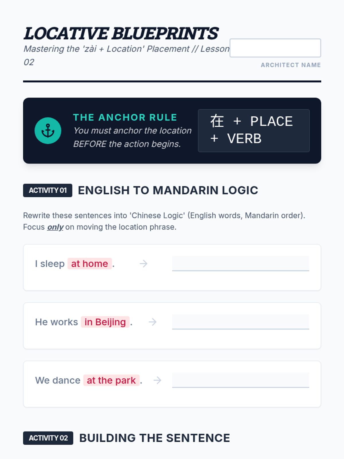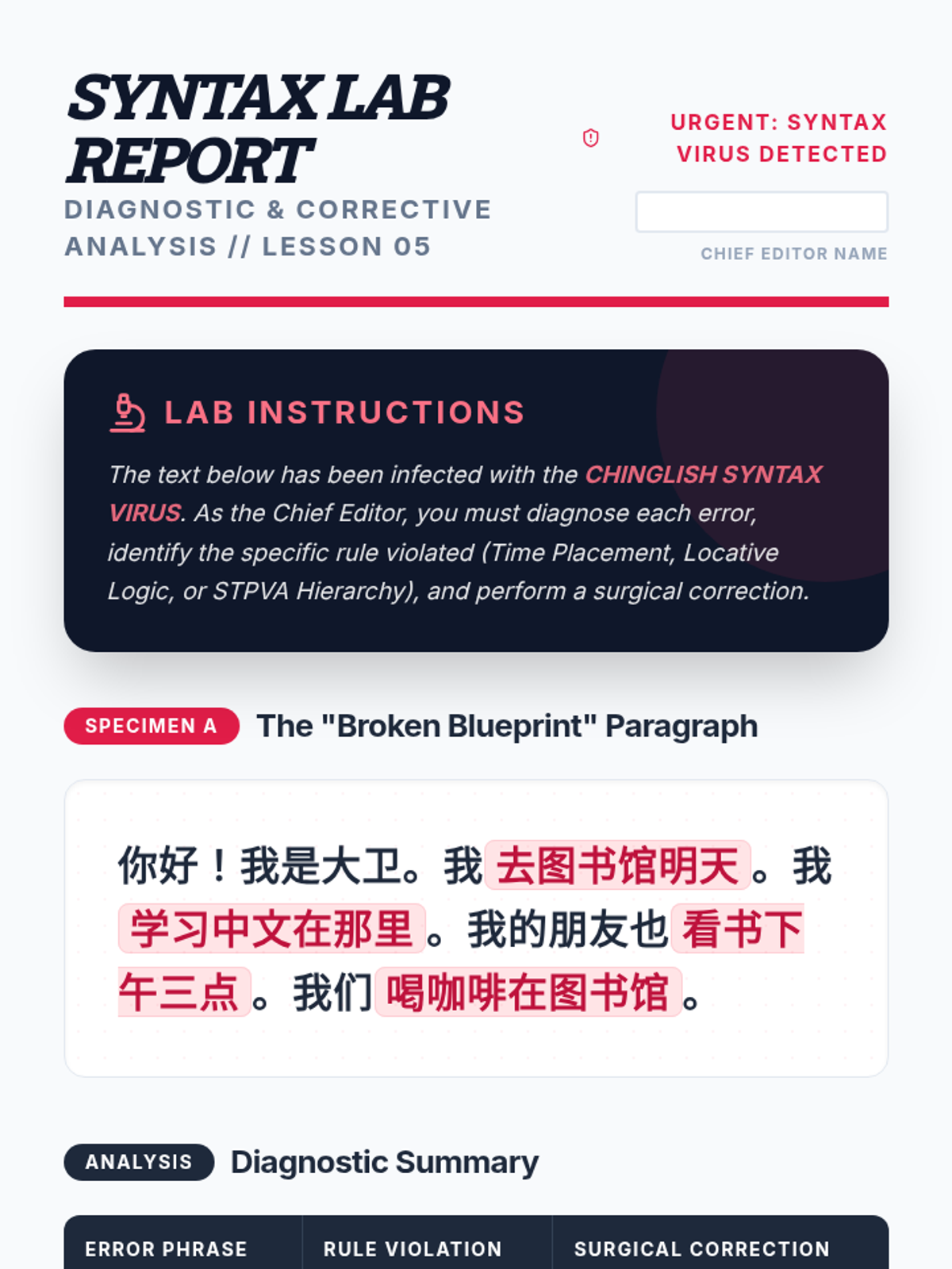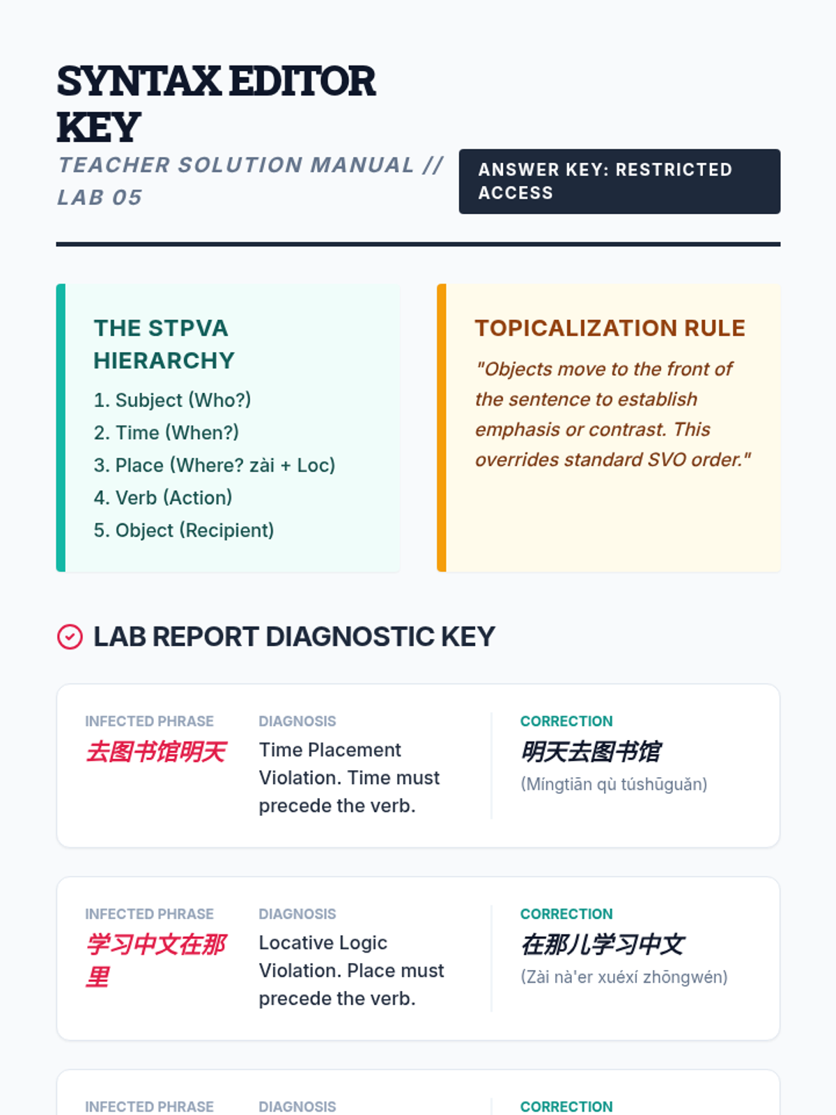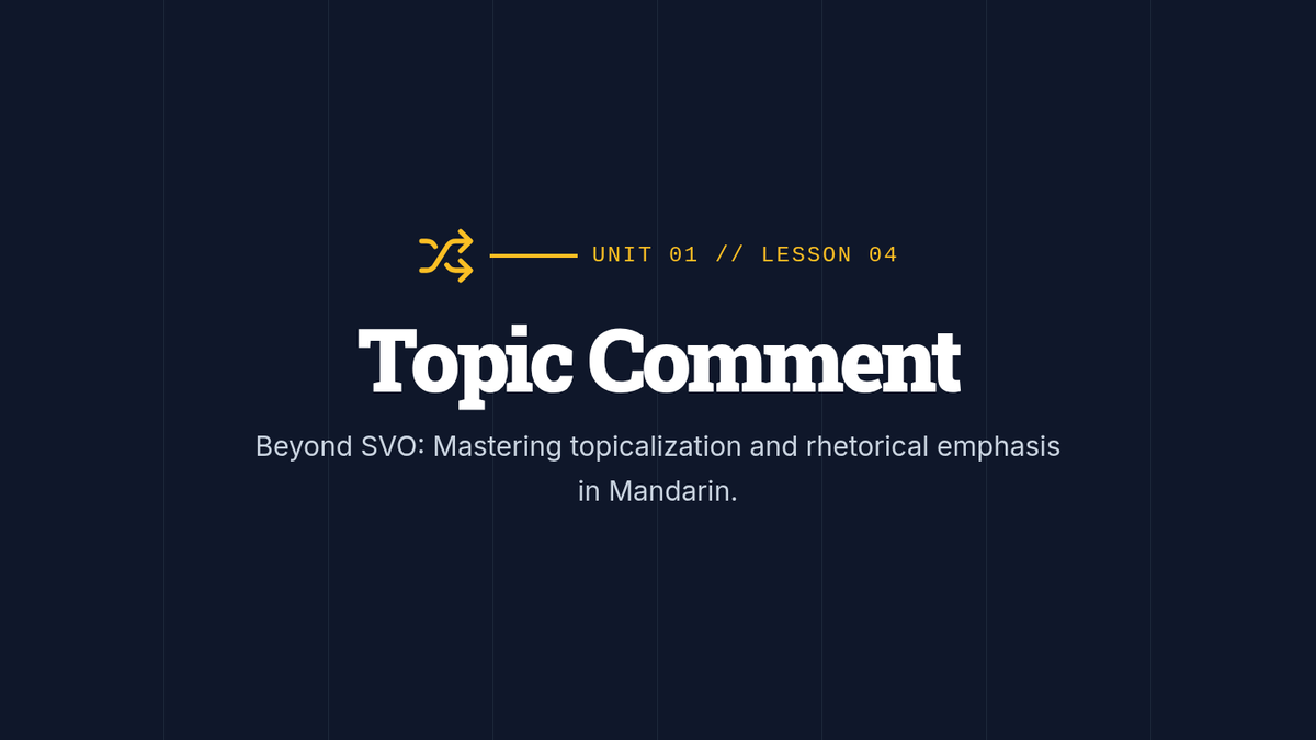 A rigorous analysis of Mandarin sentence structure, moving students from SVO assumptions to the Time-Location-Action hierarchy (STPVA). Students master word order rules, learn the Topic-Comment structure, and develop editing skills to eliminate 'Chinglish' syntactic errors.