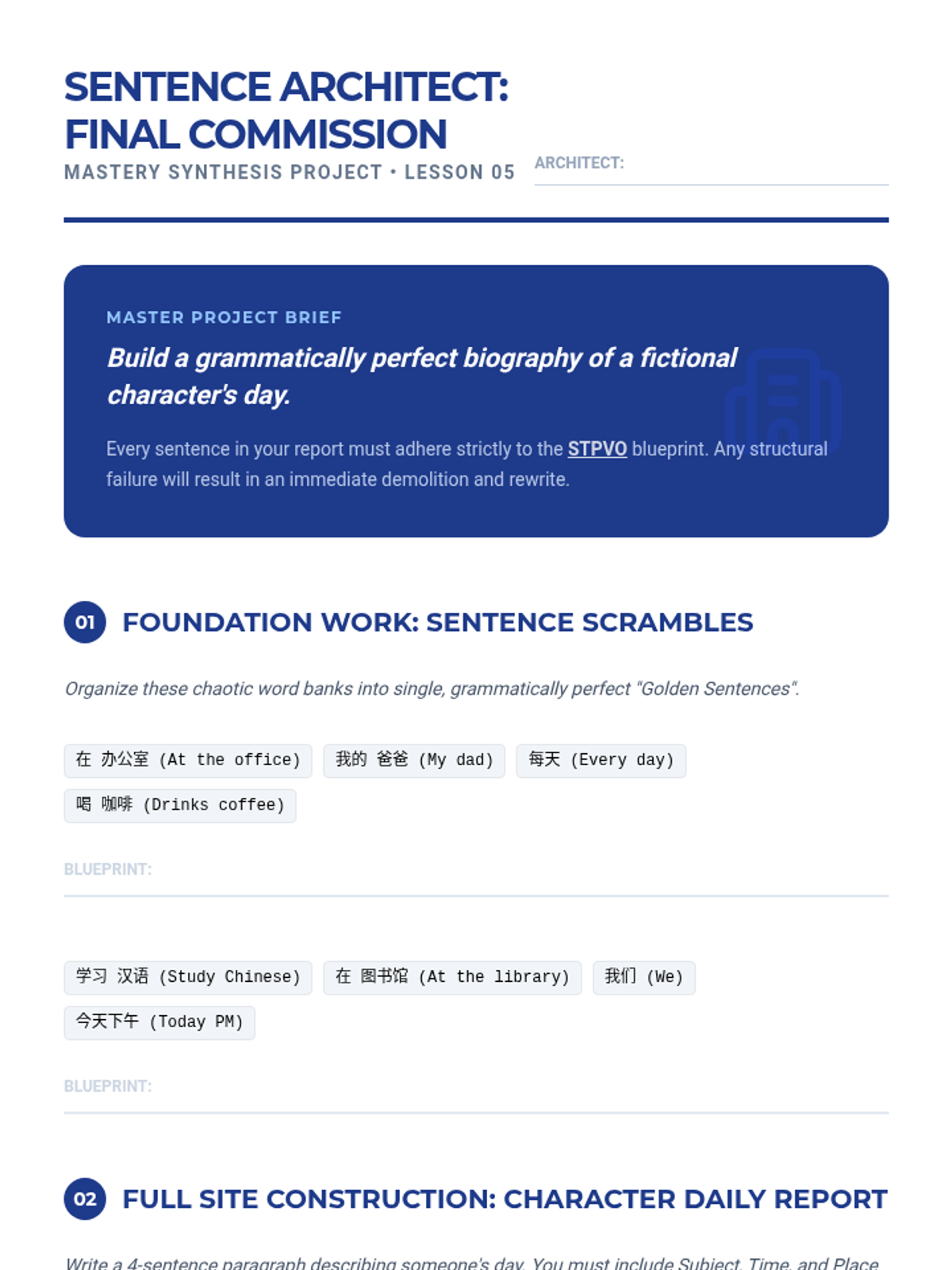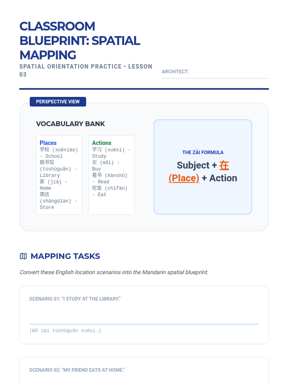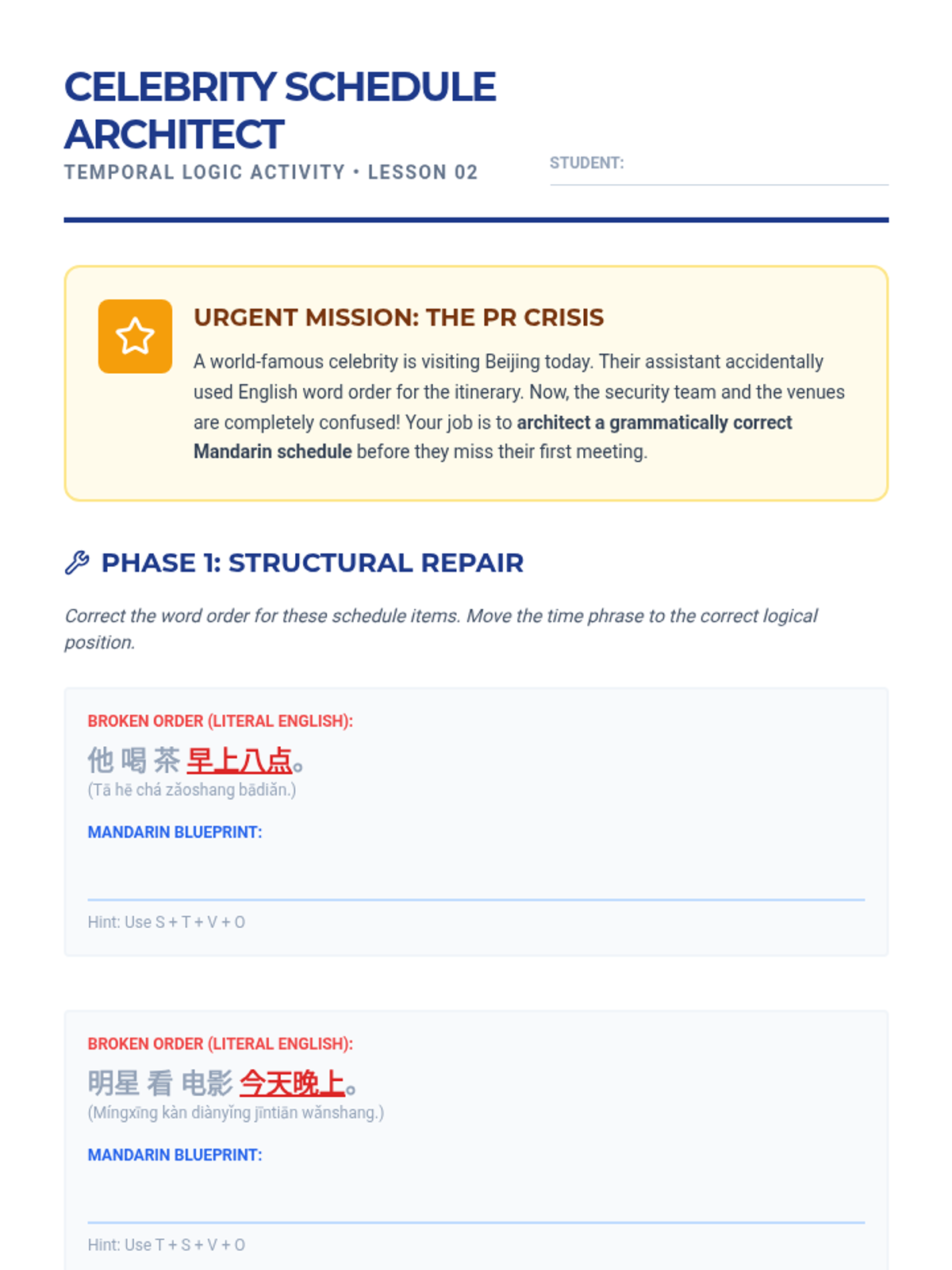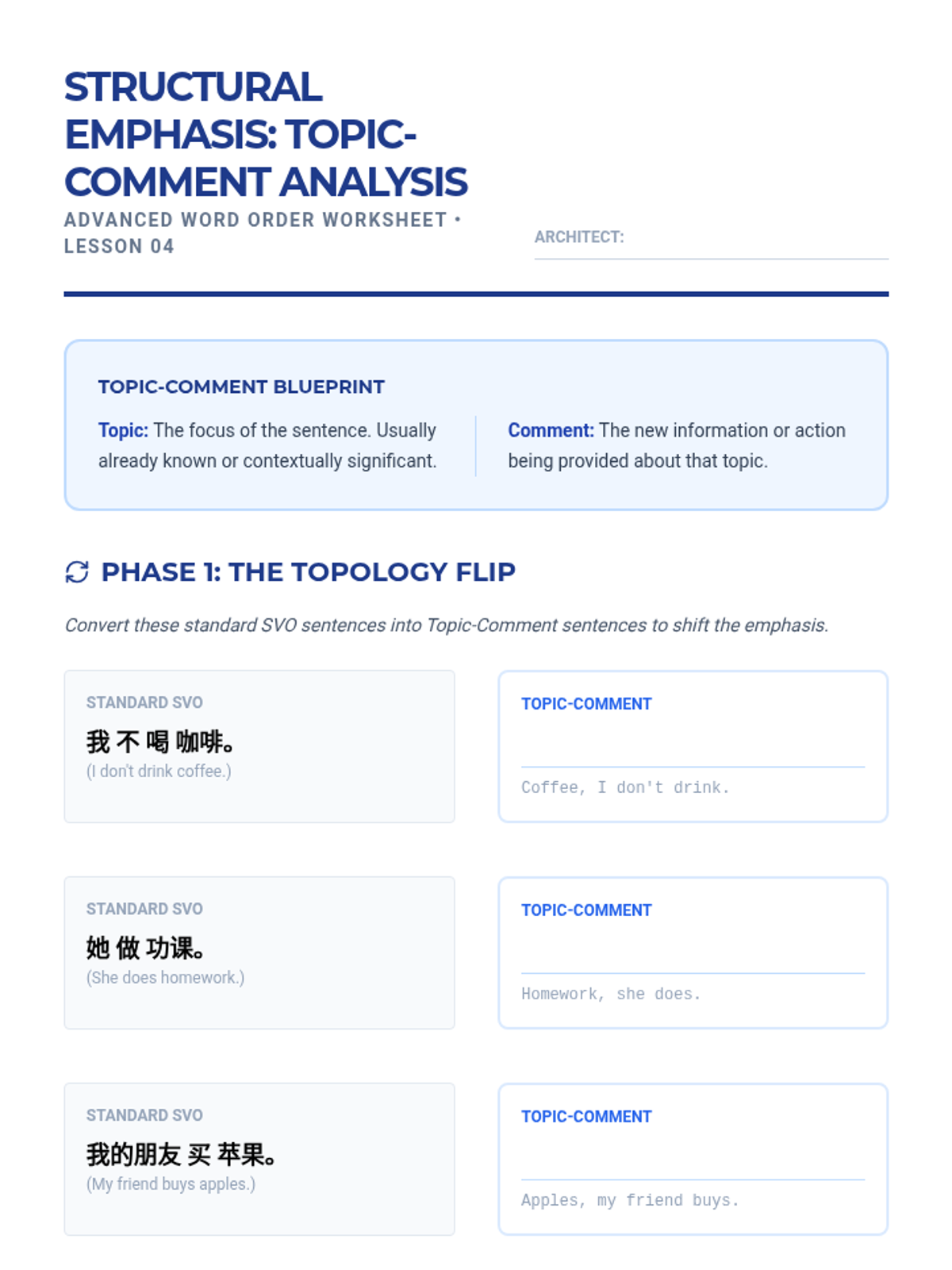 This sequence introduces the foundational logic of Mandarin Chinese sentence structure, moving beyond simple translation to an understanding of syntactic topology. Students master the 'Golden Rule' of Mandarin word order (Time and Place before Action) and construct complex sentences including topic-comment structures.