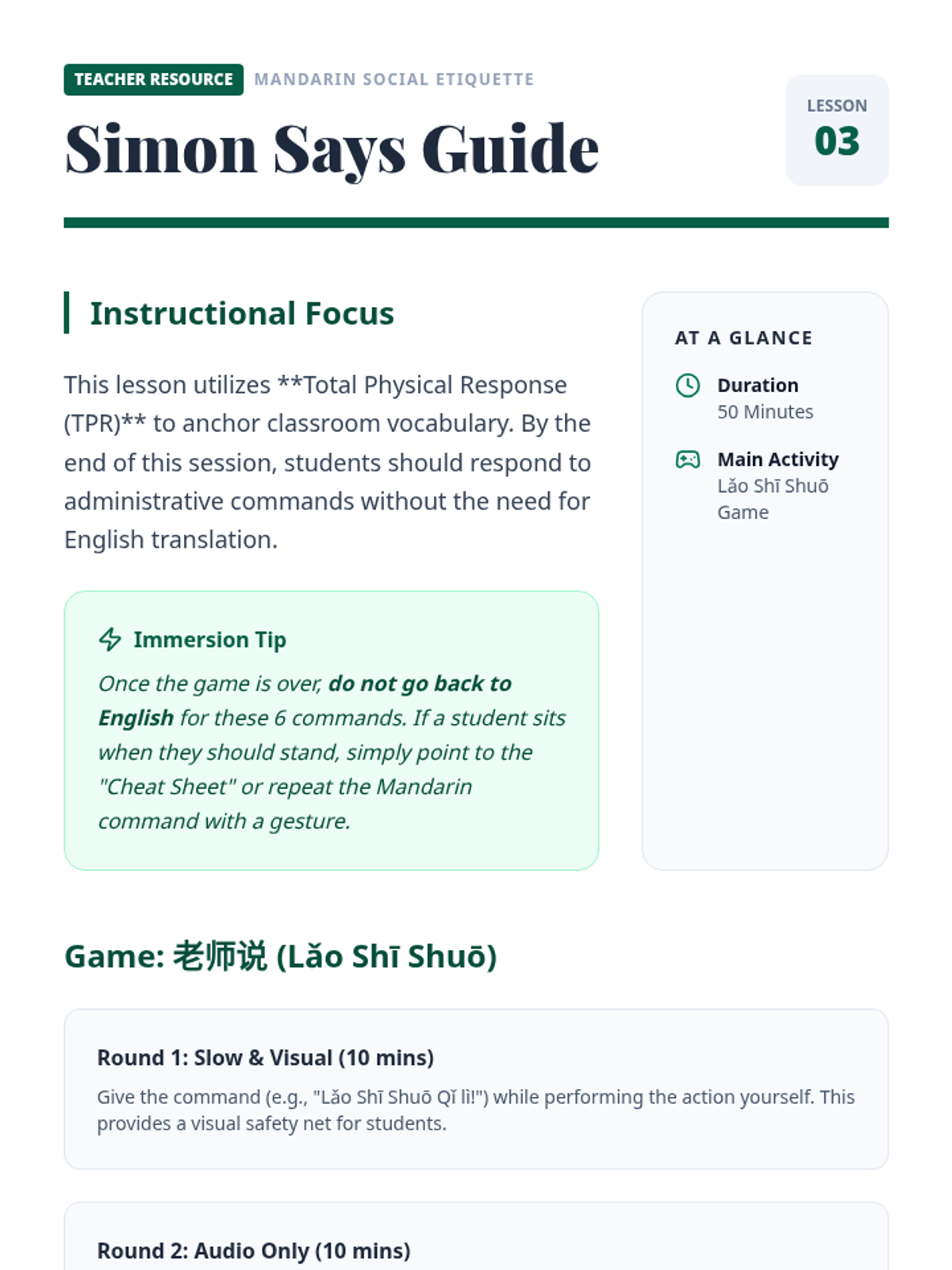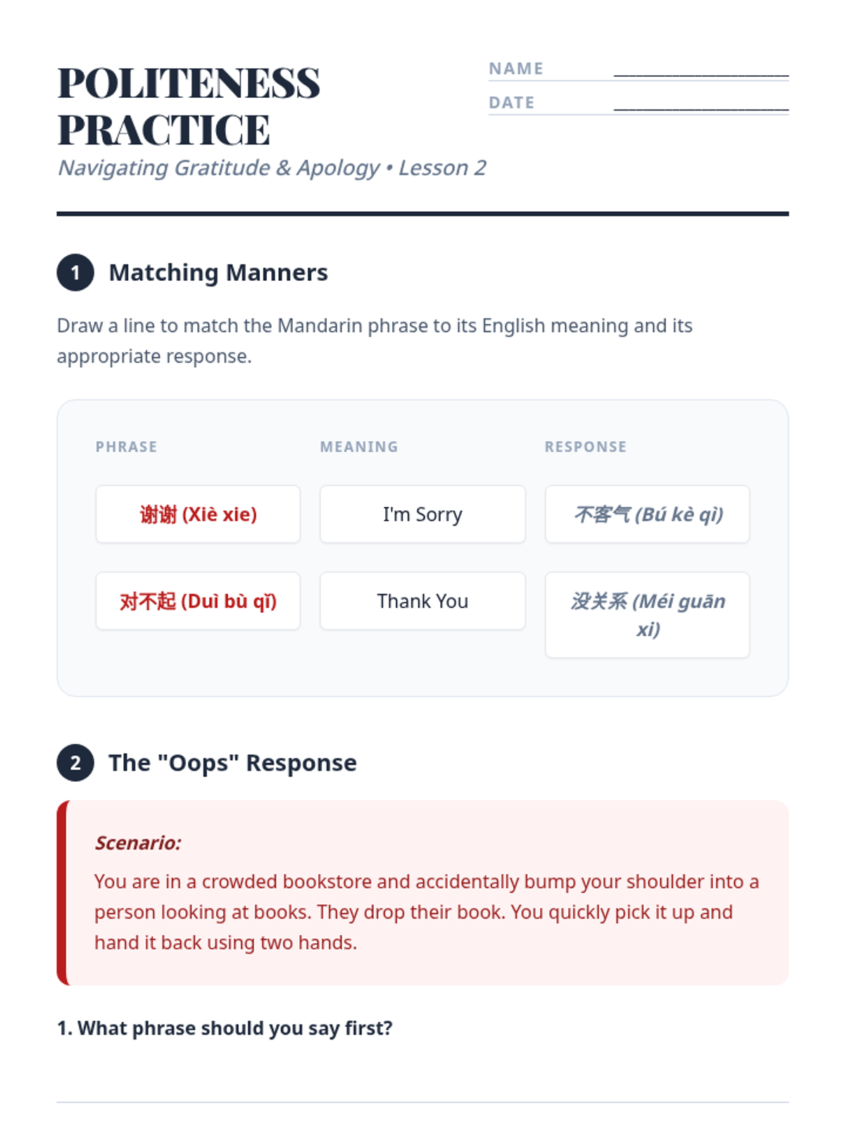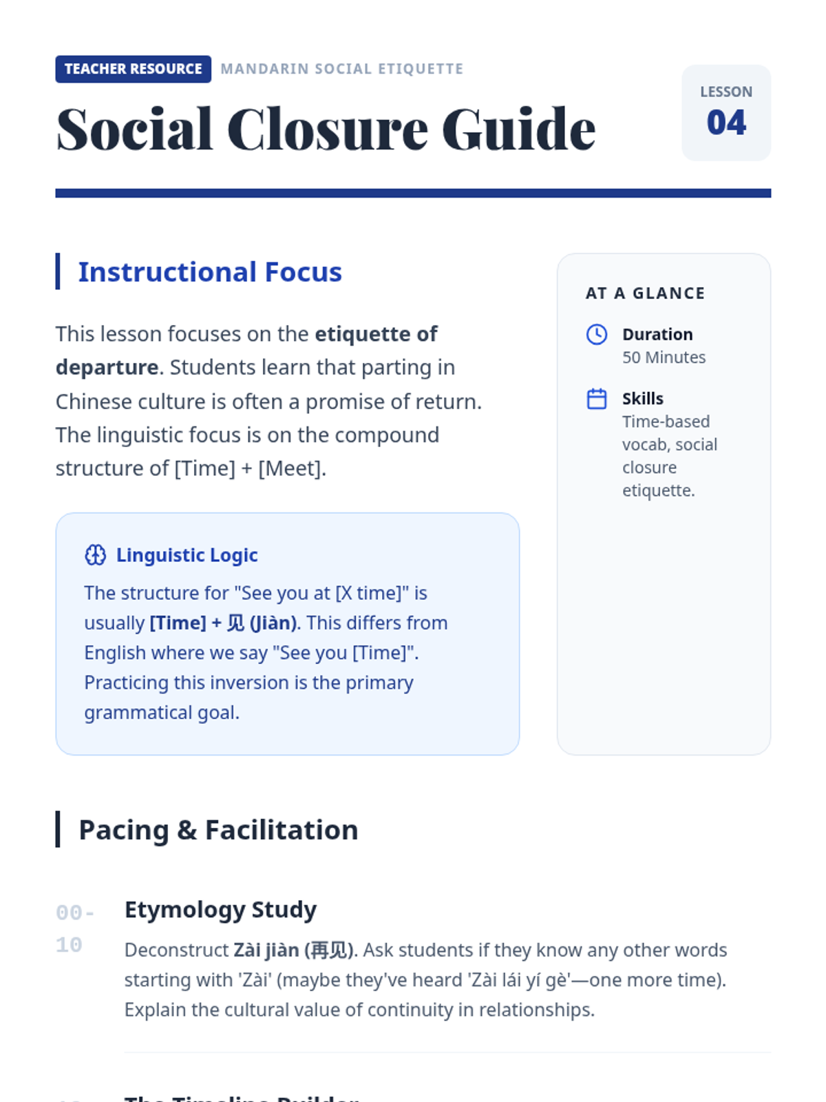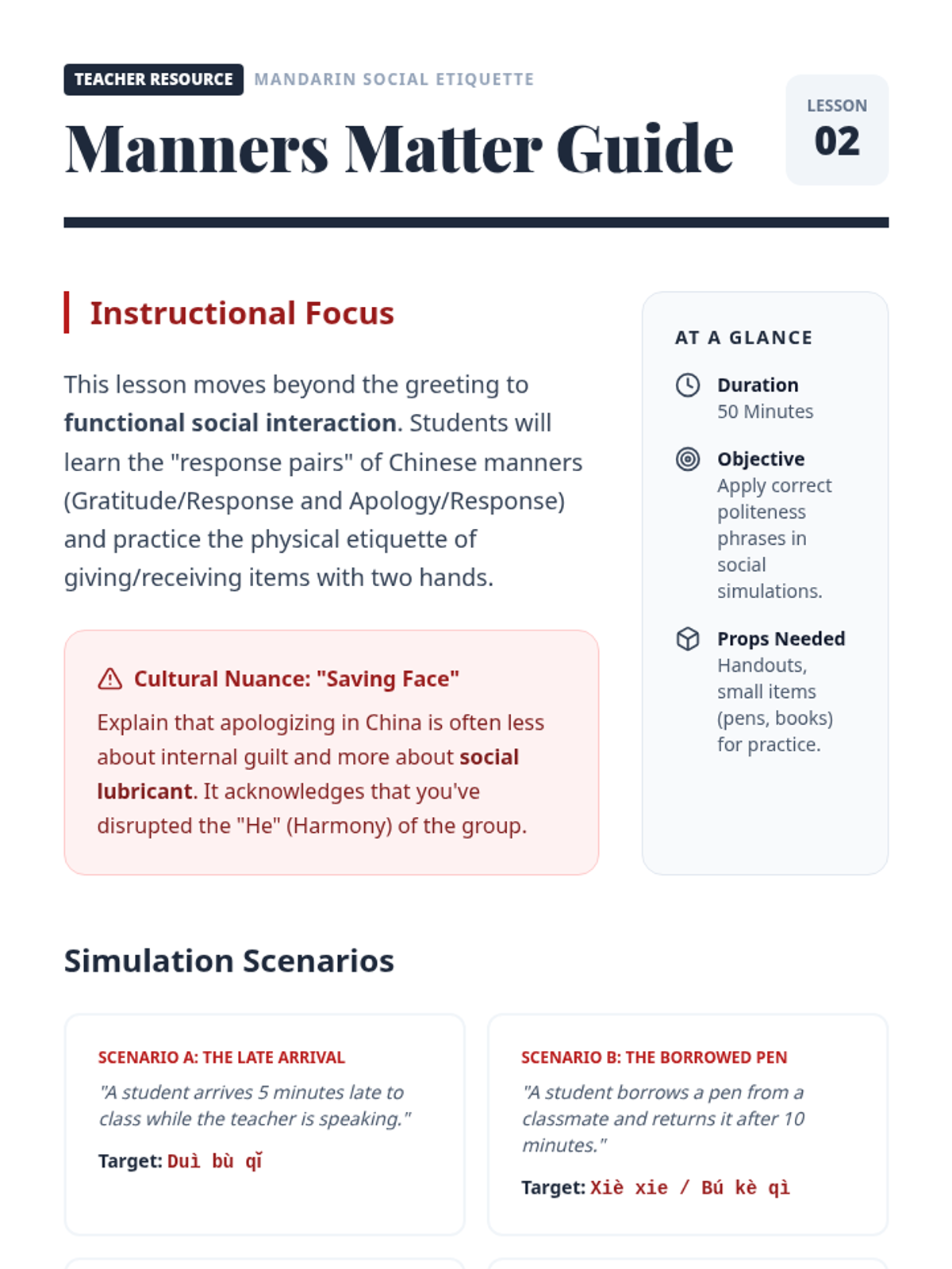 A 5-lesson sequence for 8th Grade students exploring the intersection of Mandarin Chinese language and social etiquette, focusing on greetings, gratitude, classroom commands, partings, and simulated social interactions.