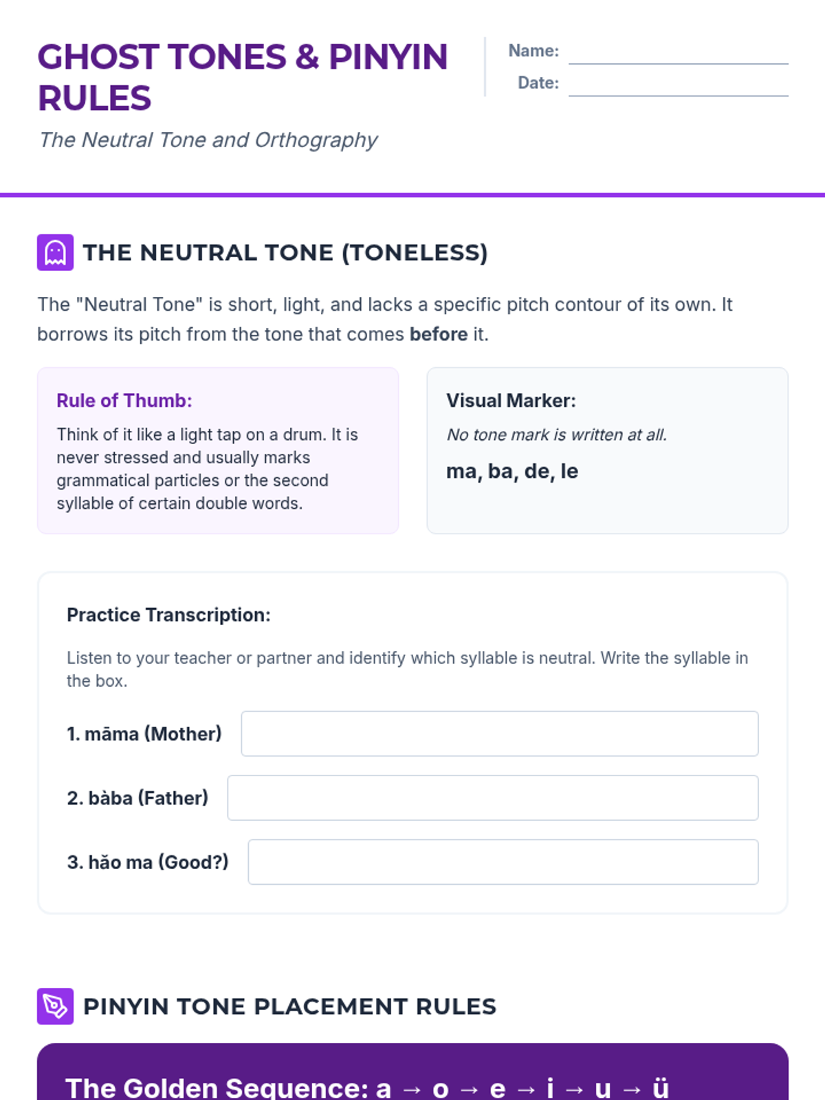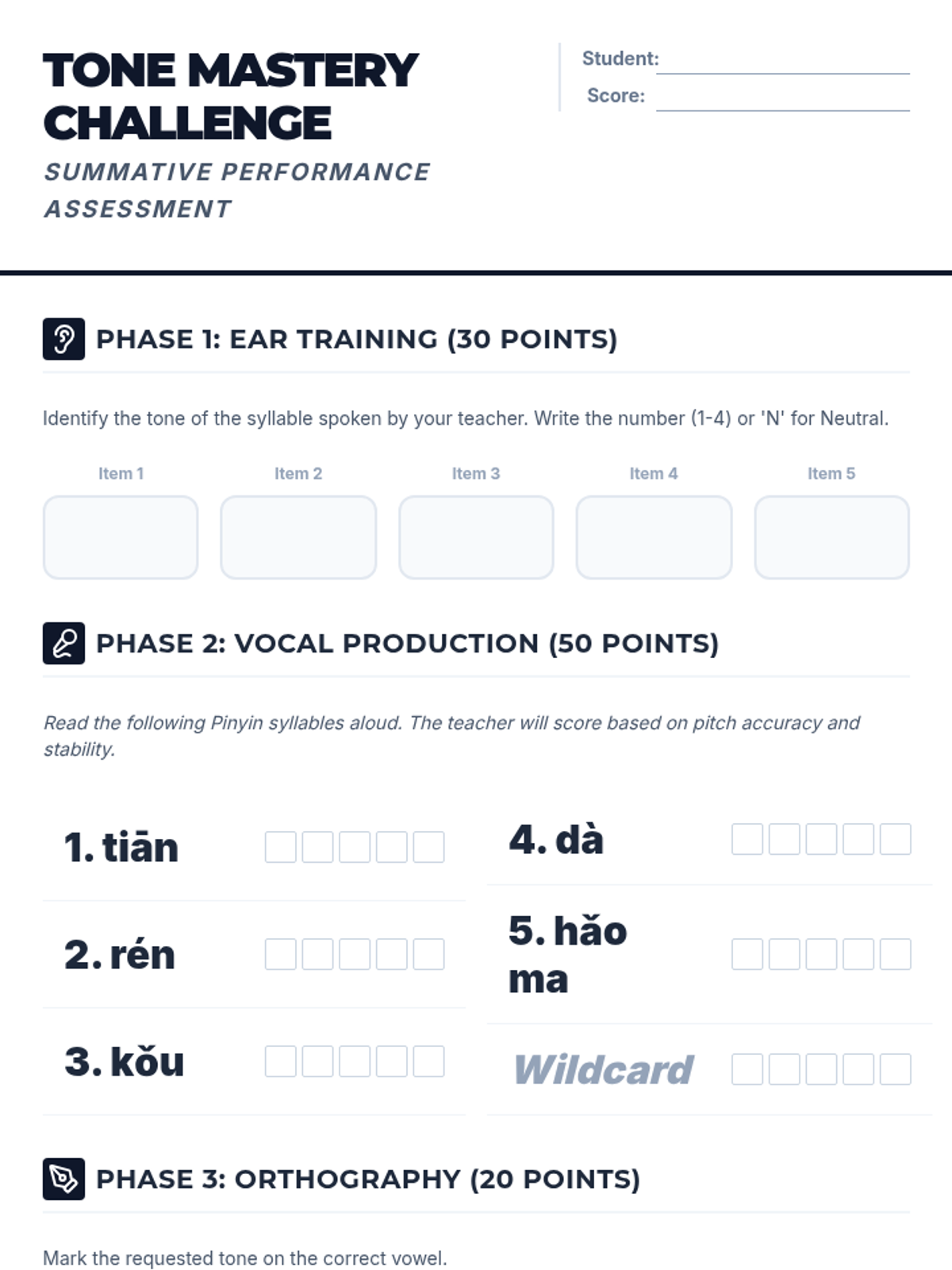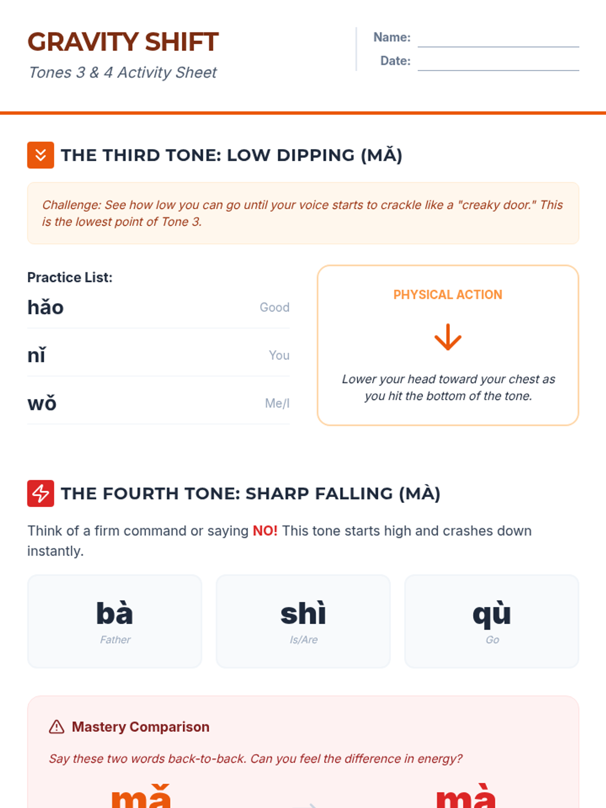 This sequence introduces 10th-grade students to the fundamental mechanics of Mandarin Chinese tones. It covers the four main tones and the neutral tone through vocal exercises, physical gestures, and pinyin orthography rules.