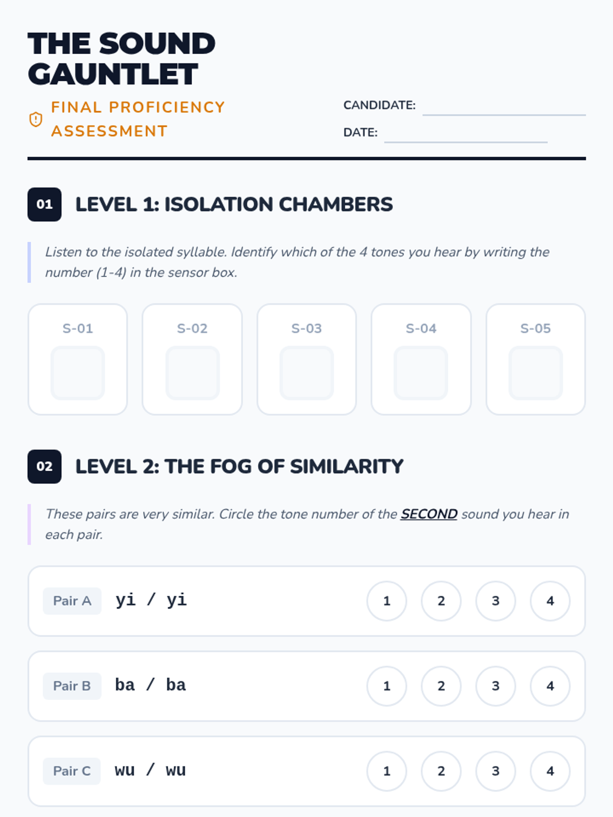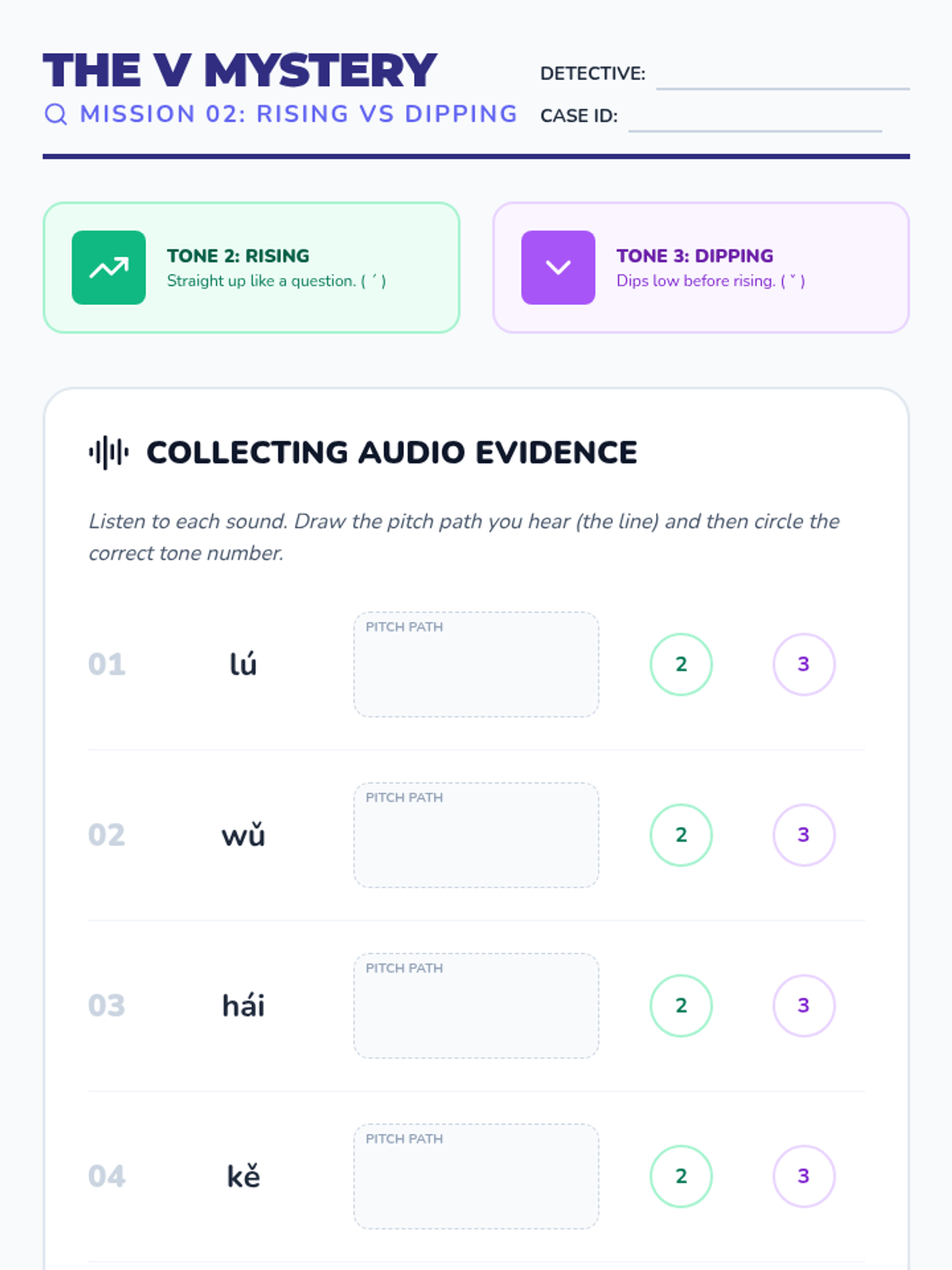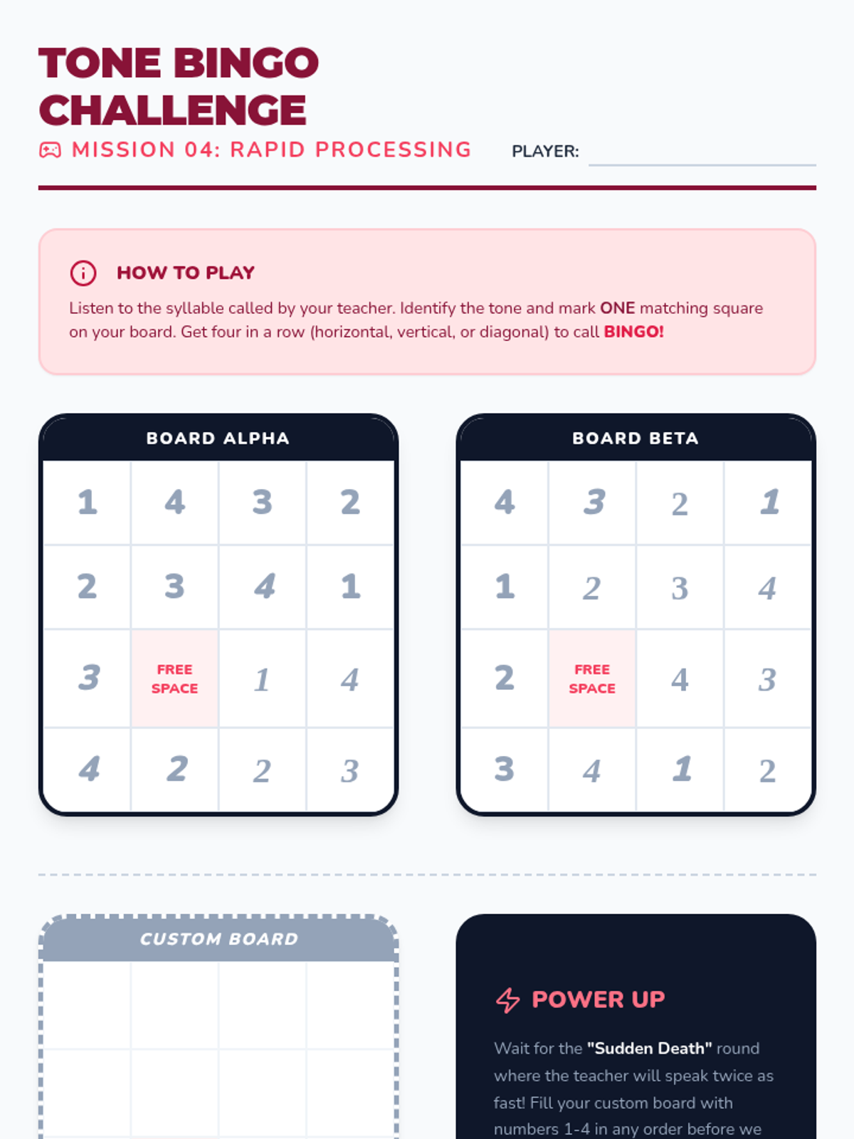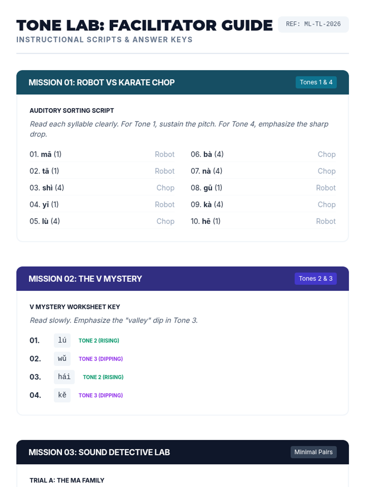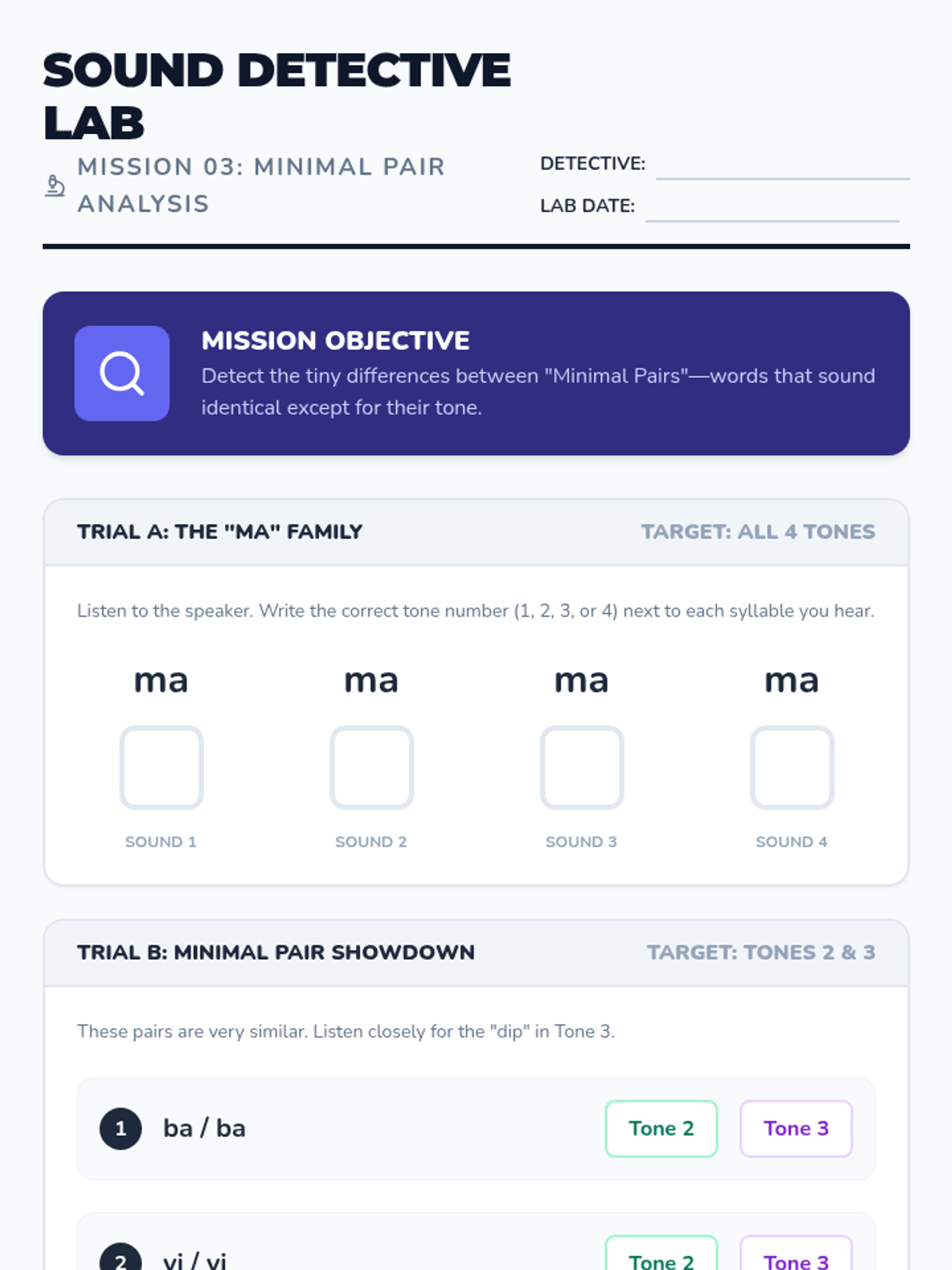 A 5th-grade Mandarin Chinese unit focused on developing auditory discrimination skills for the four main tones. Students progress from isolating distinct tones to navigating the subtle differences in minimal pairs through a 'Tone Lab' thematic approach.