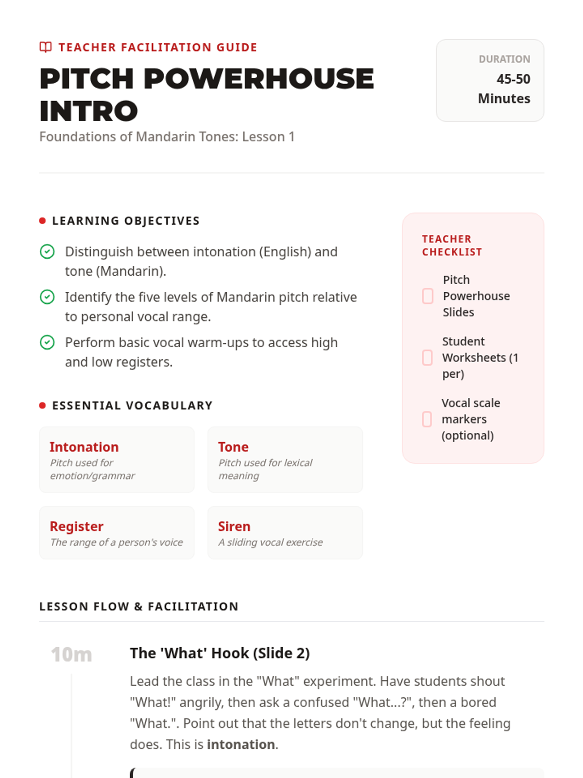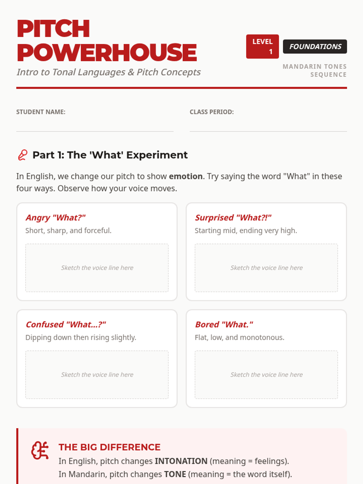 This sequence introduces 7th-grade students to the four main tones and the neutral tone in Mandarin Chinese. Through vocal workshops, physical gestures, and comparative phonology, students learn to produce and distinguish lexical pitch, moving from isolated tones to synthesis.