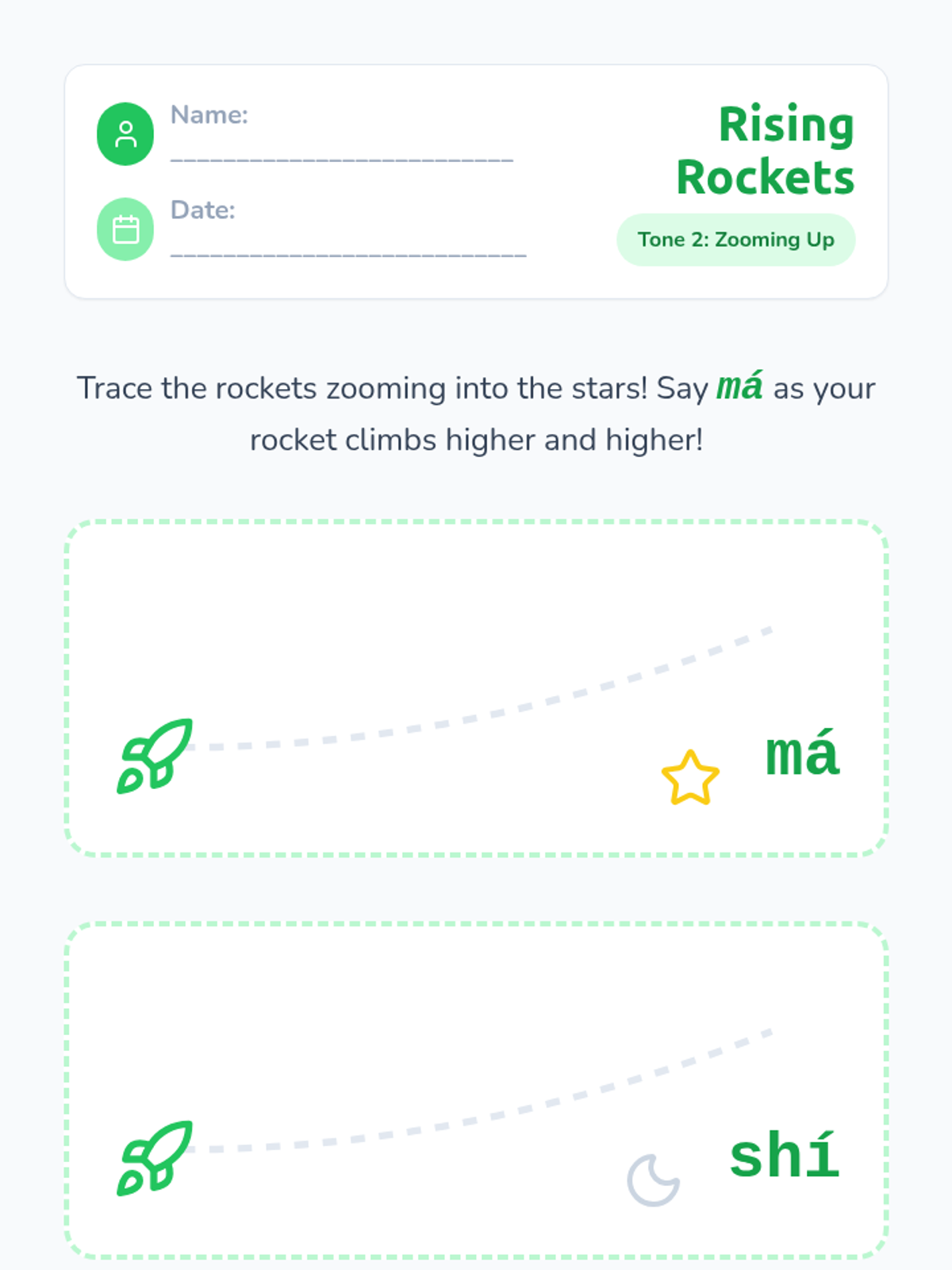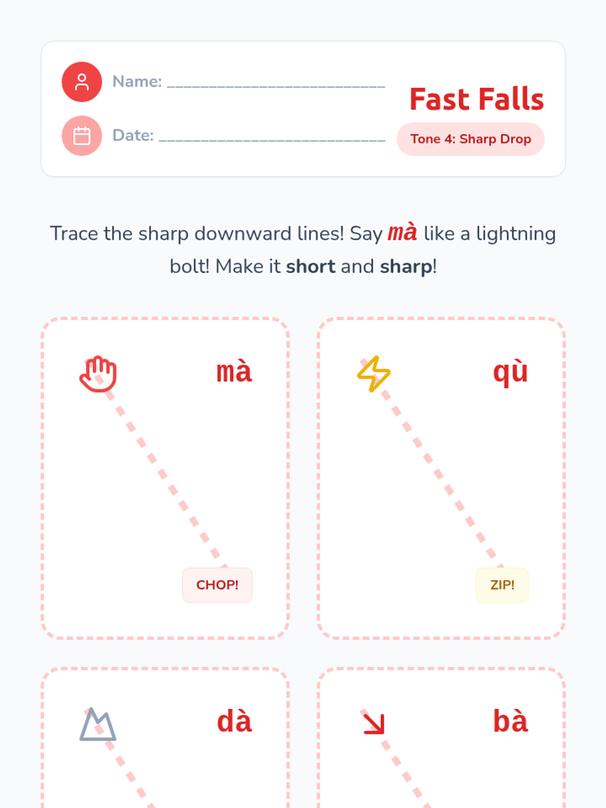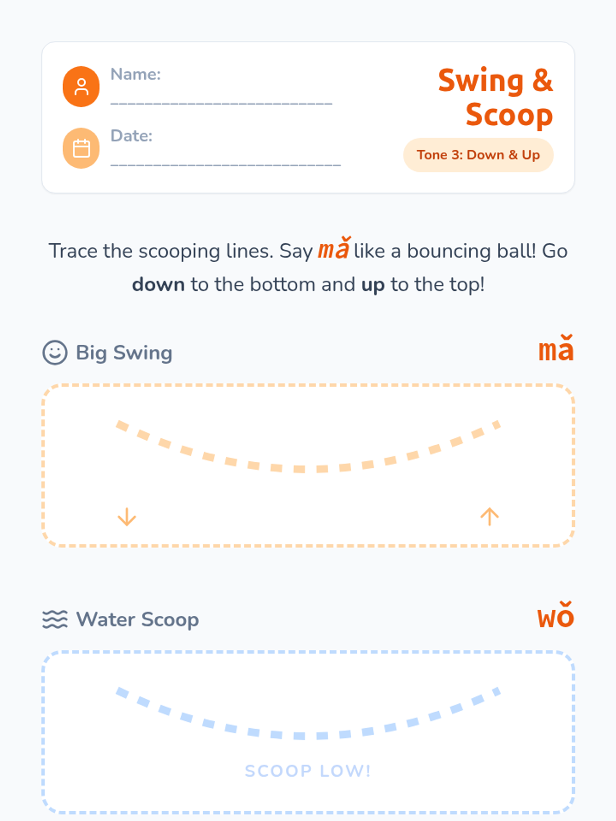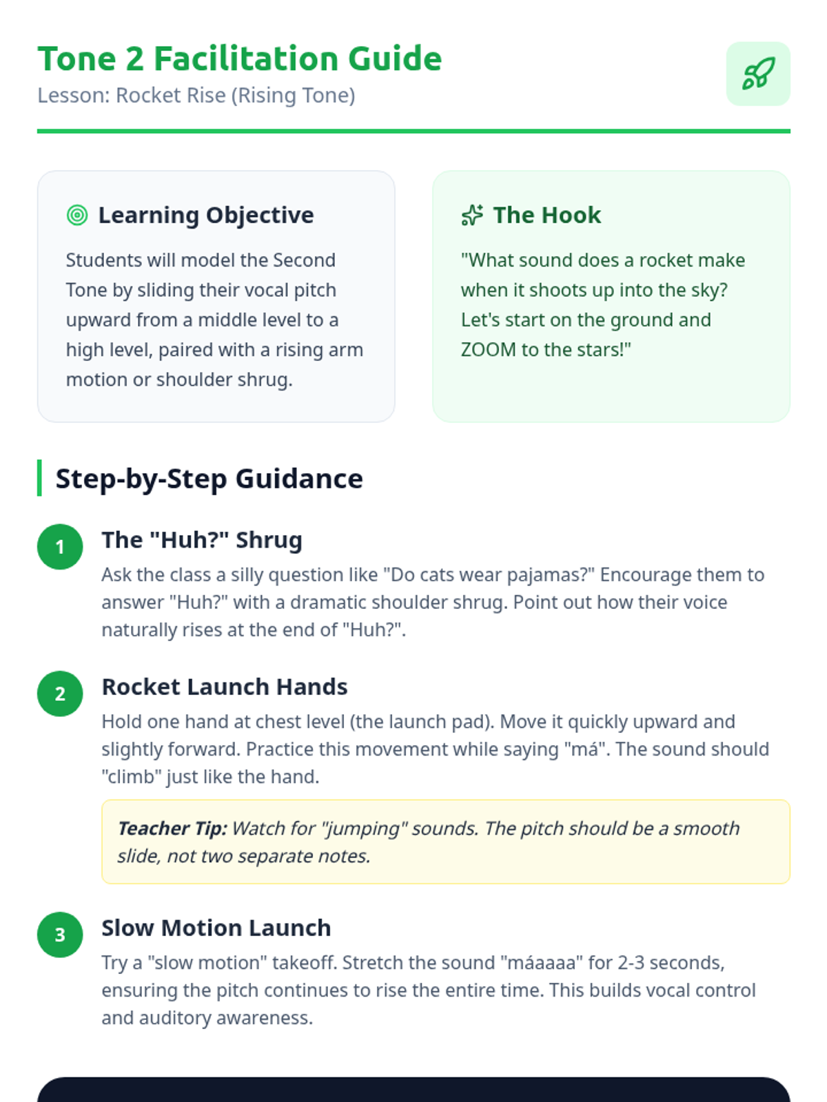 A foundational sequence for Pre-K learners to explore the four tones of Mandarin Chinese through auditory play, physical movement, and vocal exploration. Students learn to associate pitch changes with meaning using relatable sounds like questioning 'Huh?' or firm 'No!' gestures.