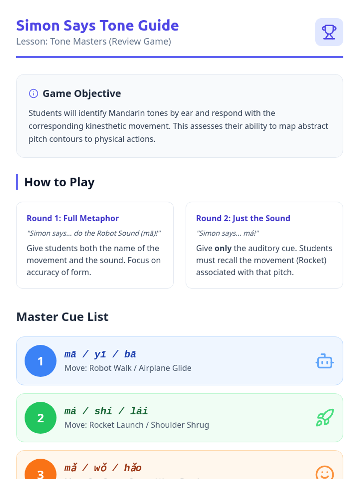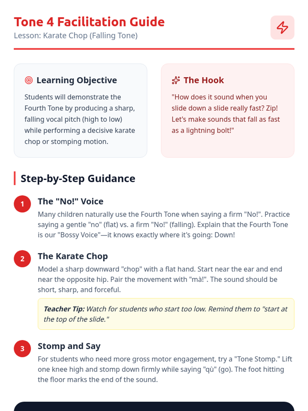 A kinesthetic introduction to the four Mandarin Chinese tones for Pre-K learners. This sequence uses gross motor movements, physical metaphors, and vocal play to help young students internalize pitch contours.