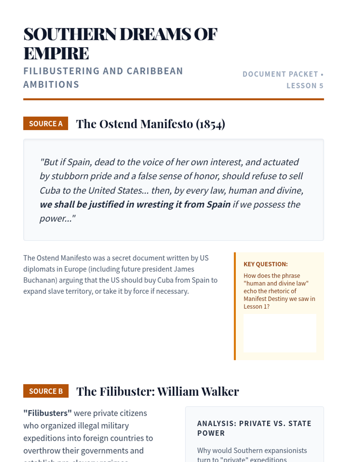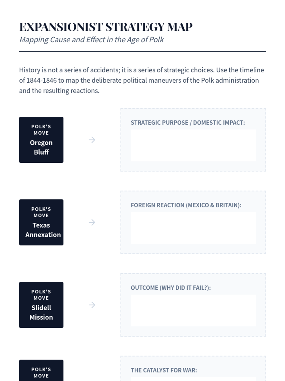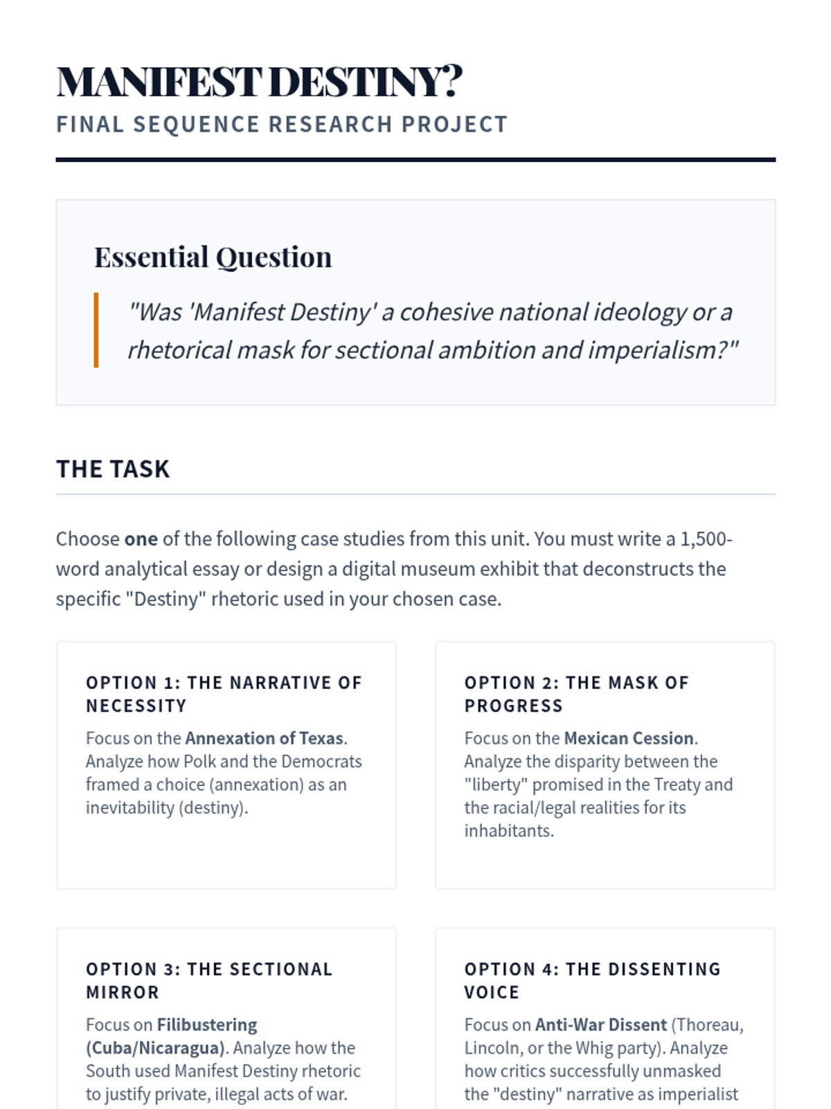 This sequence investigates the geopolitical and ideological drivers of American territorial growth from the annexation of Texas to the Gadsden Purchase. Students will deconstruct 'Manifest Destiny' as a political tool and assess its role in the sectional crisis over slavery.