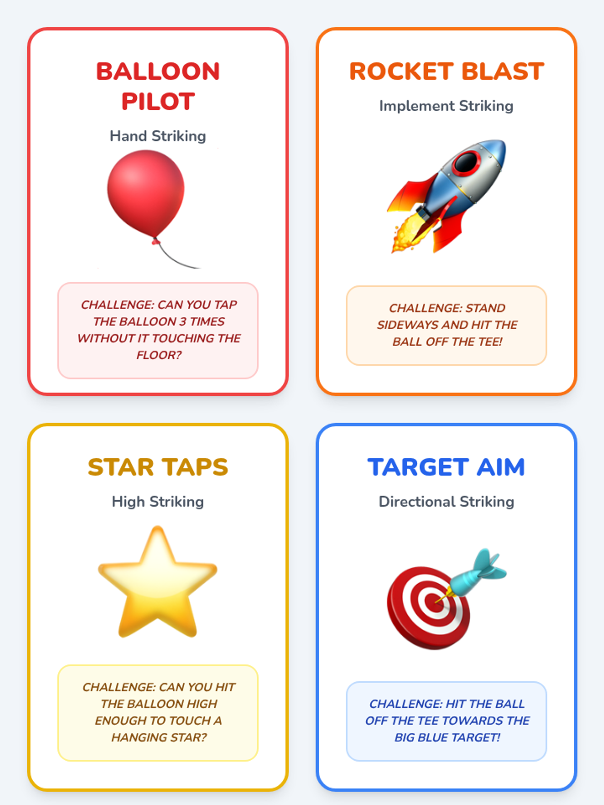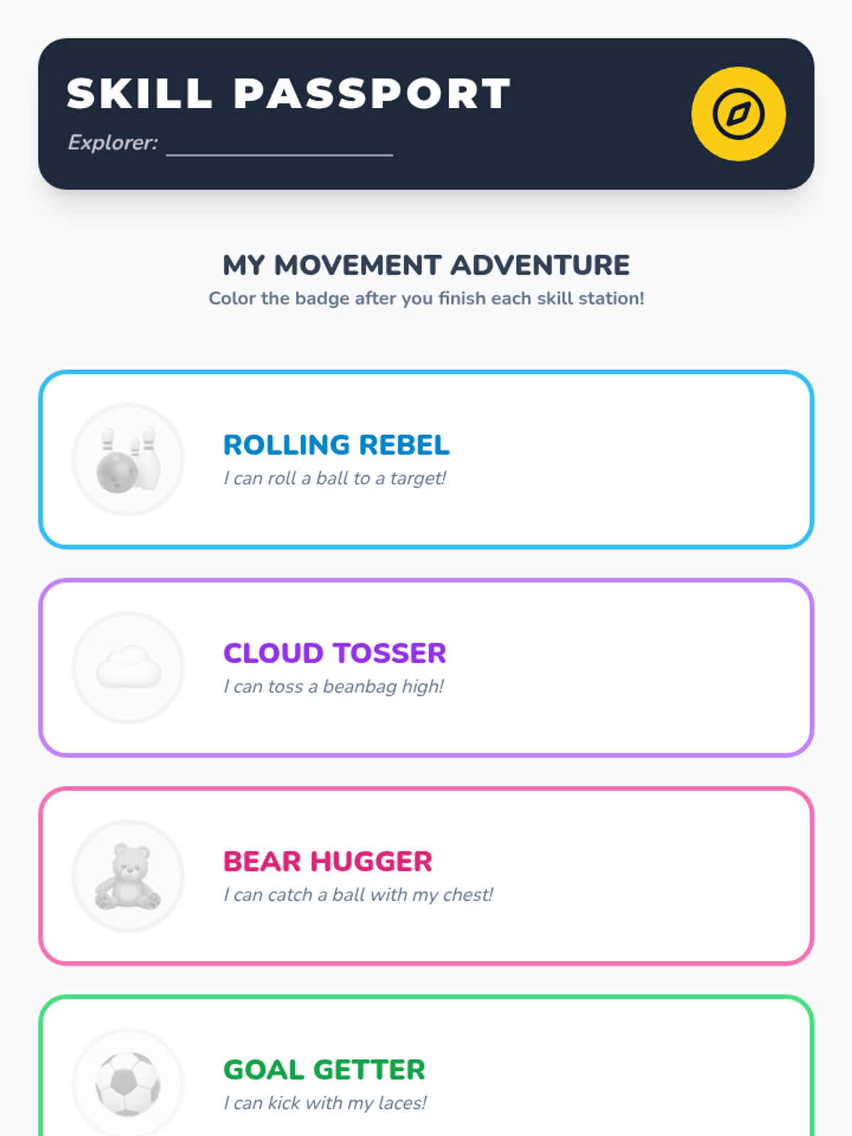 A comprehensive physical education sequence for Pre-K students focused on developing fundamental manipulative skills including rolling, tossing, catching, kicking, and striking through play-based exploration.