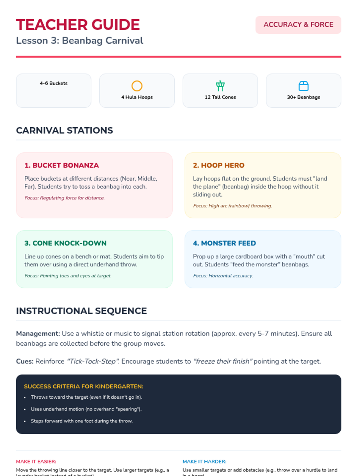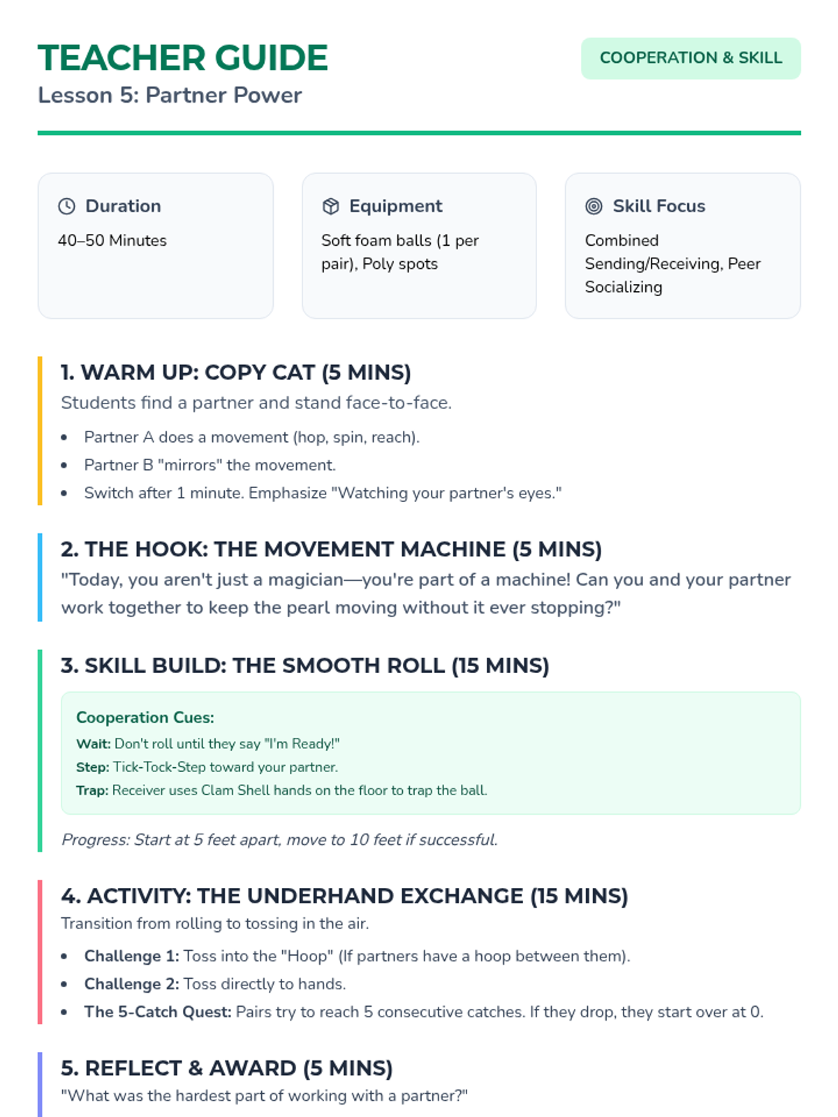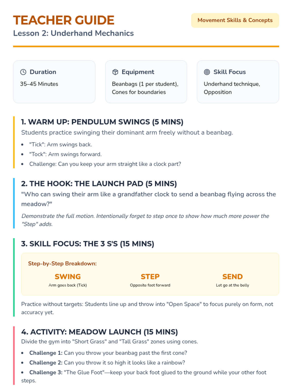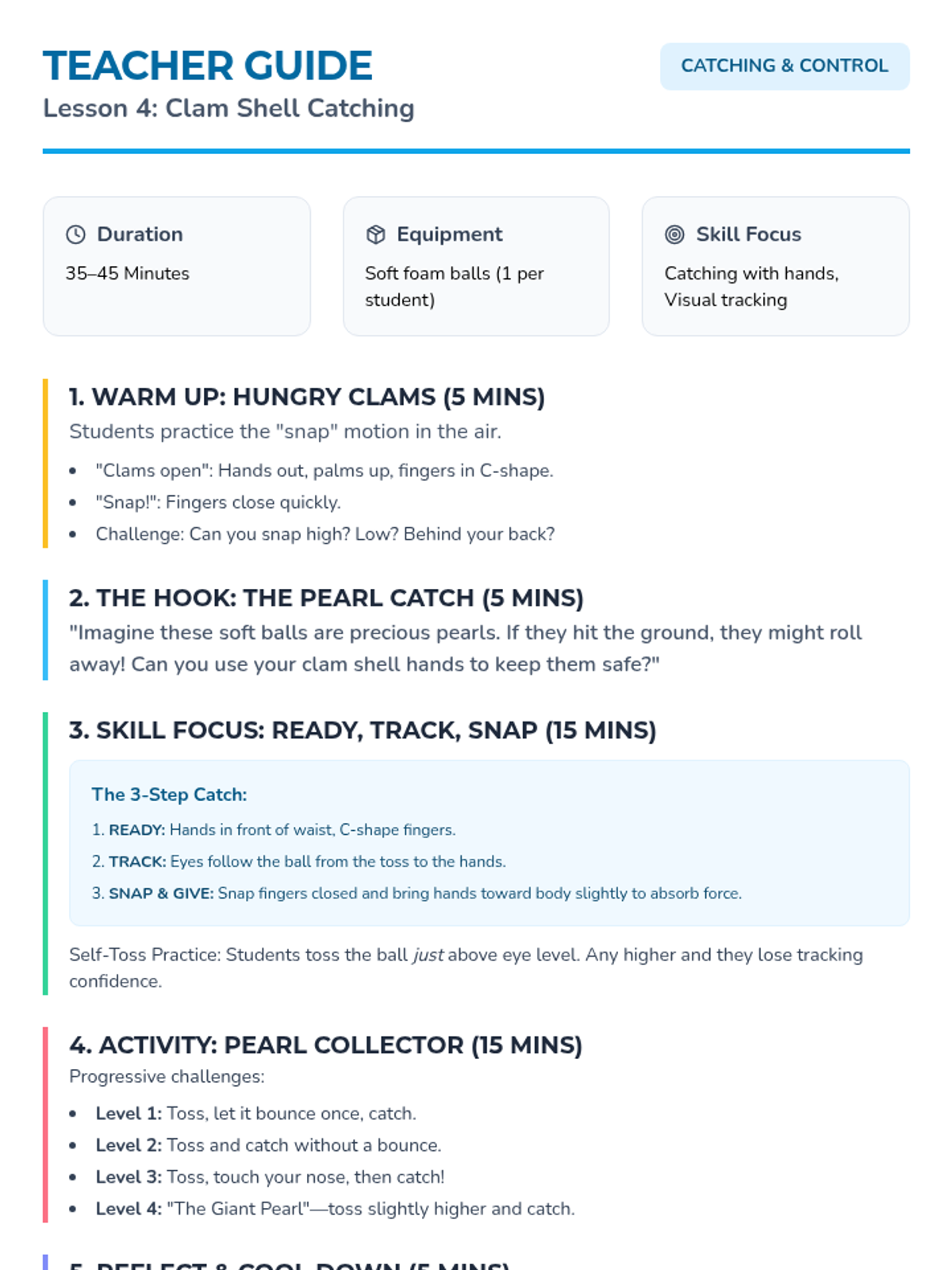 A 5-lesson sequence for Kindergarten students focusing on fundamental manipulative skills, specifically underhand throwing and catching. The sequence progresses from slow-moving visual tracking to complex partner exchanges using a game-based approach.