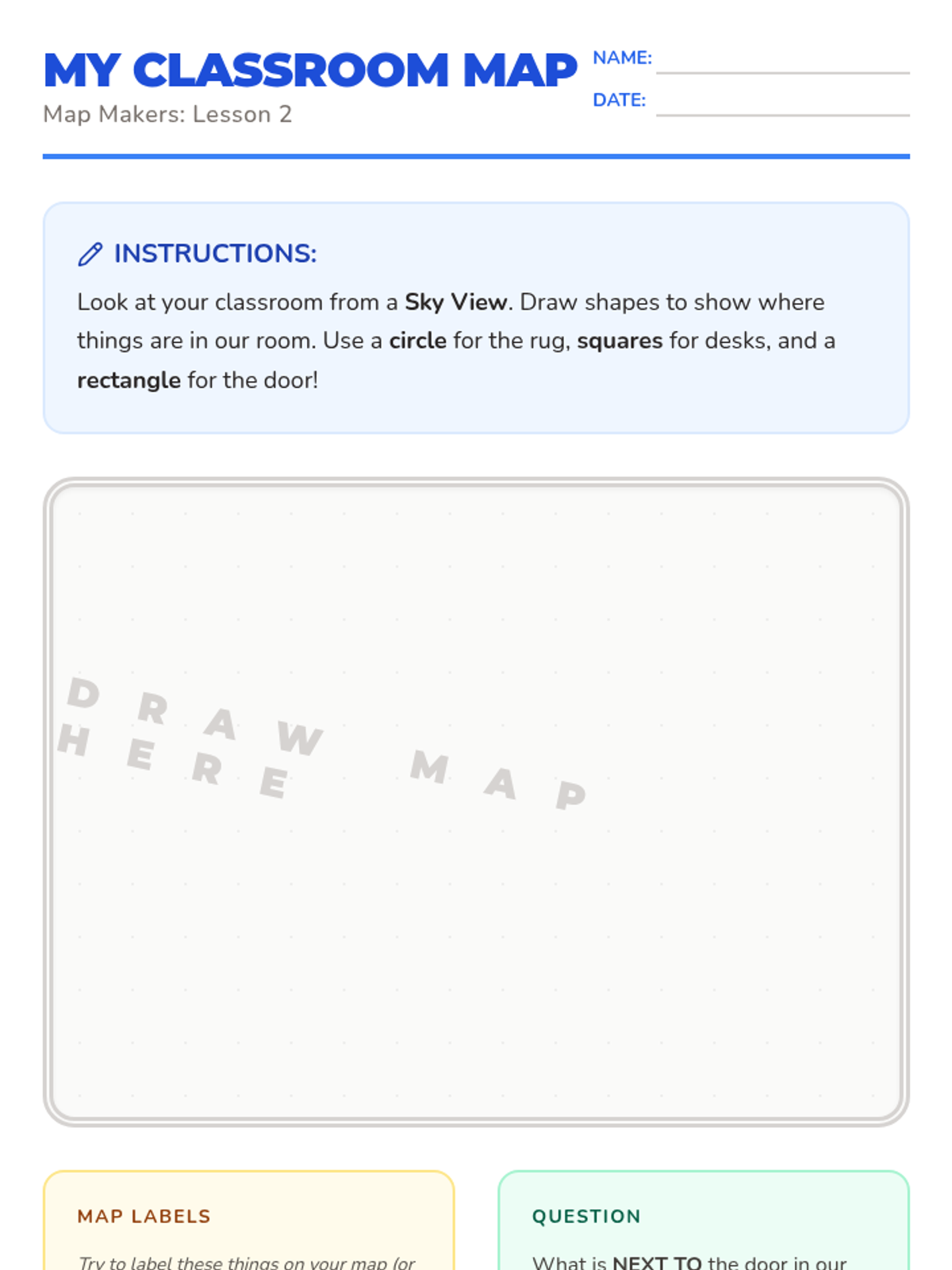 This Kindergarten sequence guides young learners from a simple 'bird's eye view' of classroom objects to creating and navigating neighborhood maps. Students develop spatial reasoning, understand symbolic representation through map keys, and use positional language to describe their world.