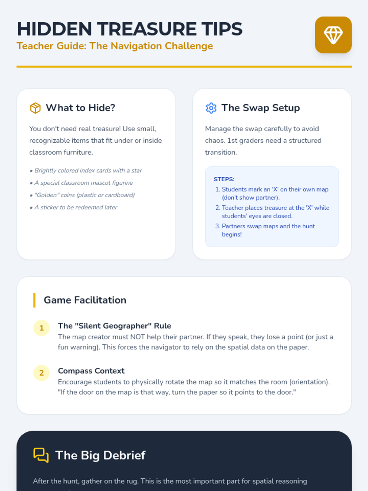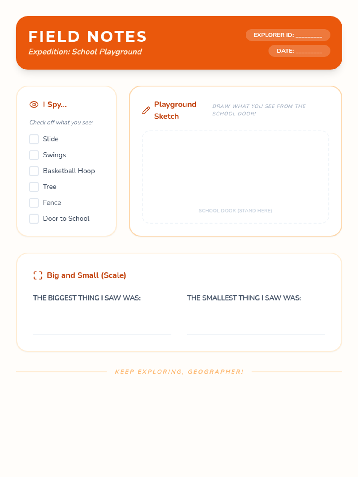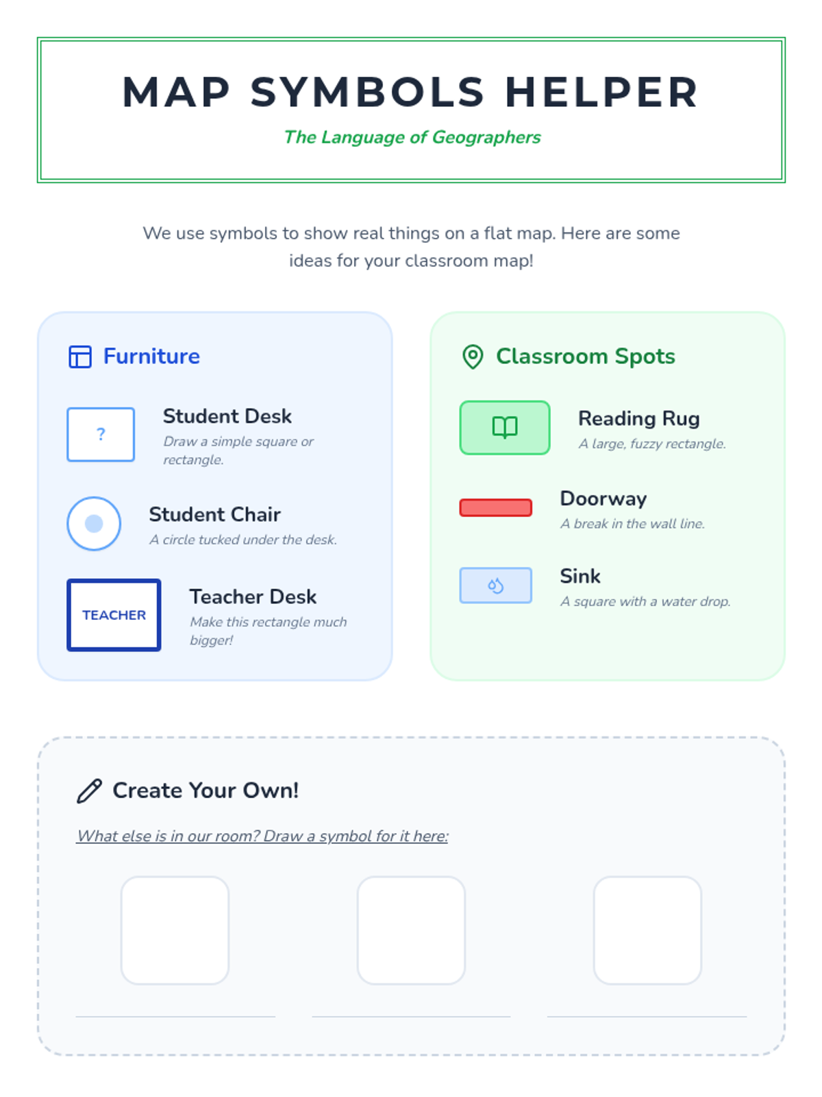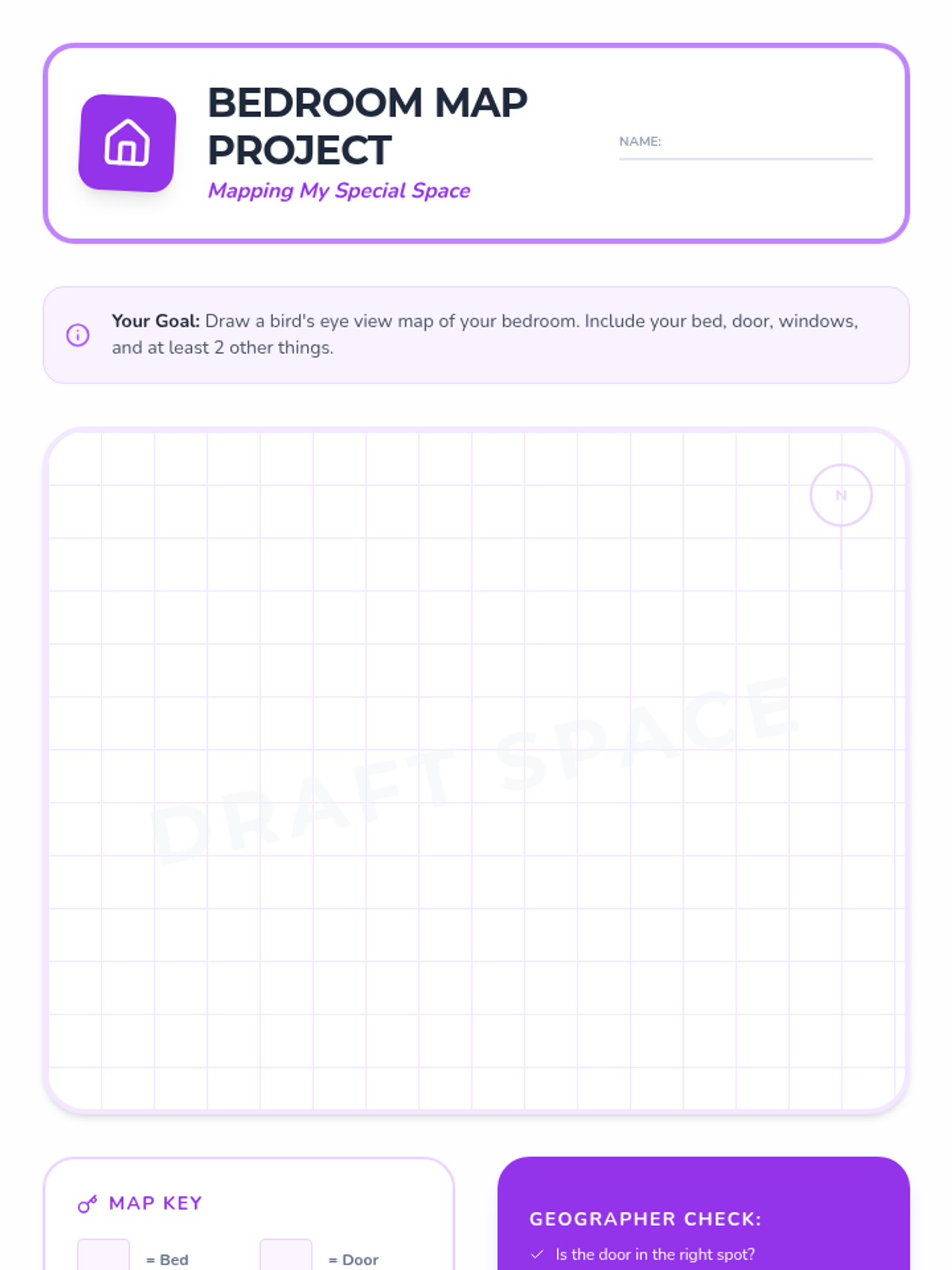 A hands-on project-based unit where 1st graders develop spatial reasoning by creating models and maps of their classroom, playground, and personal spaces. Students progress from 3D modeling to 2D cartography, ending with a navigation challenge to test their map accuracy.