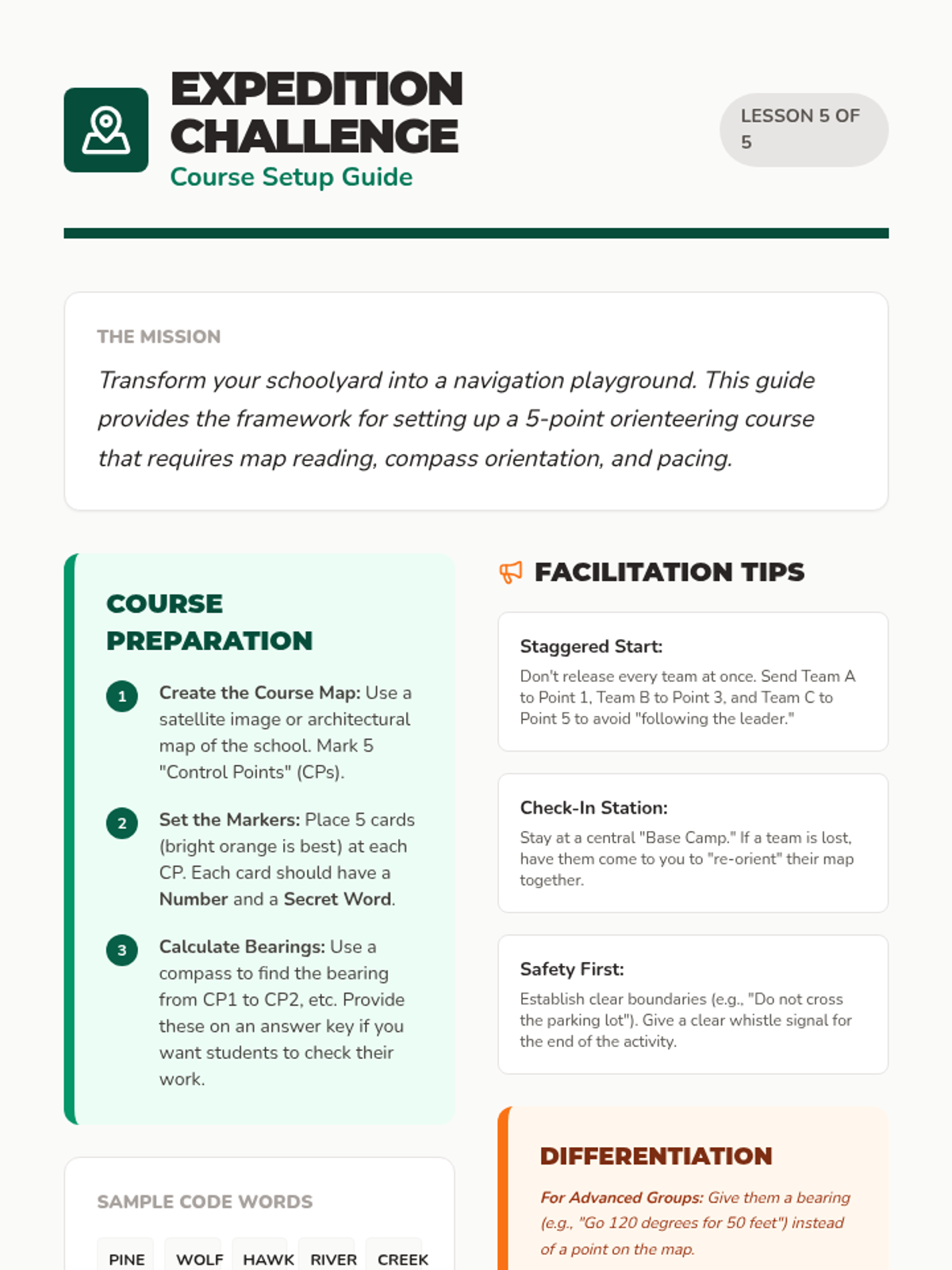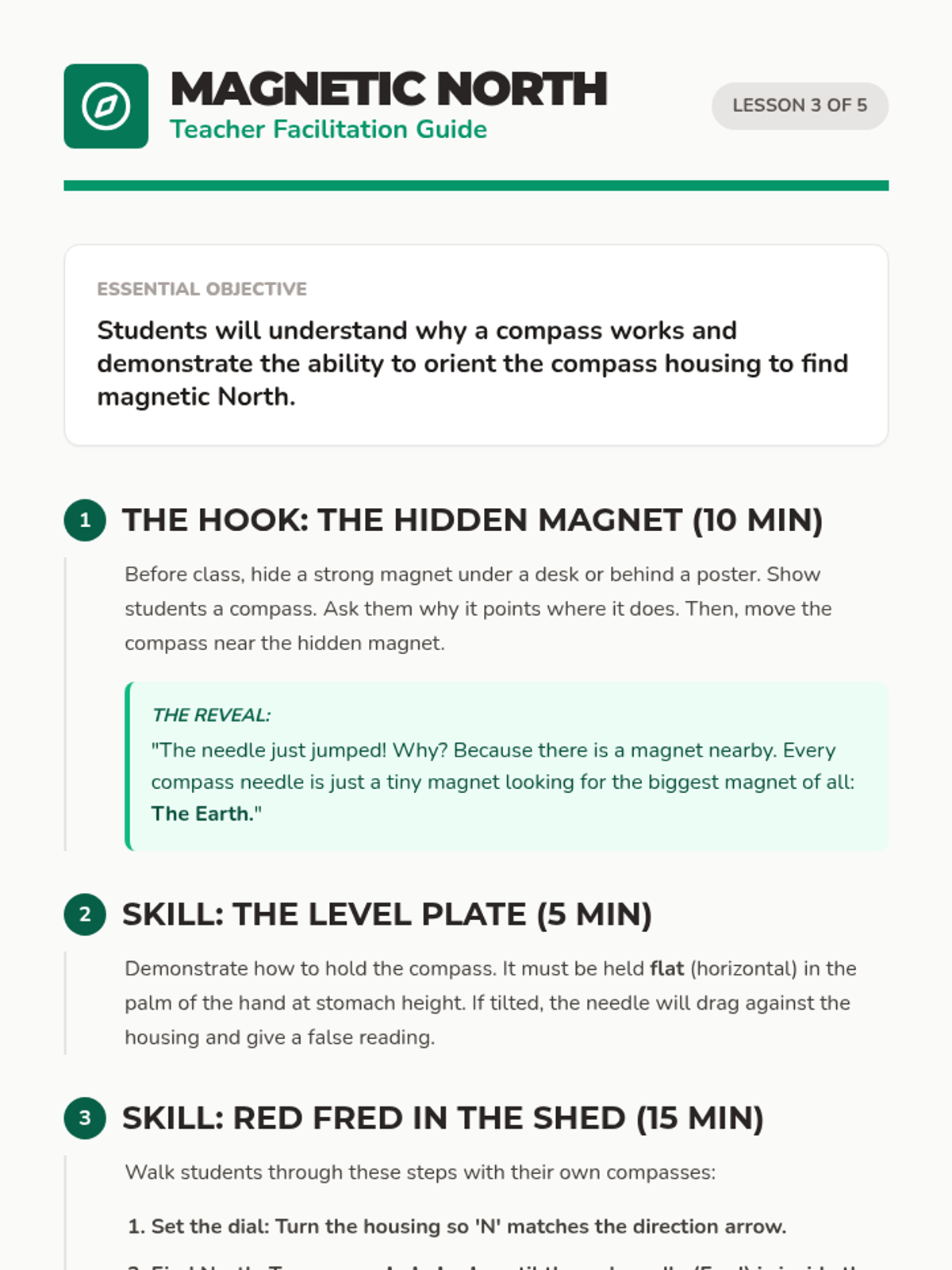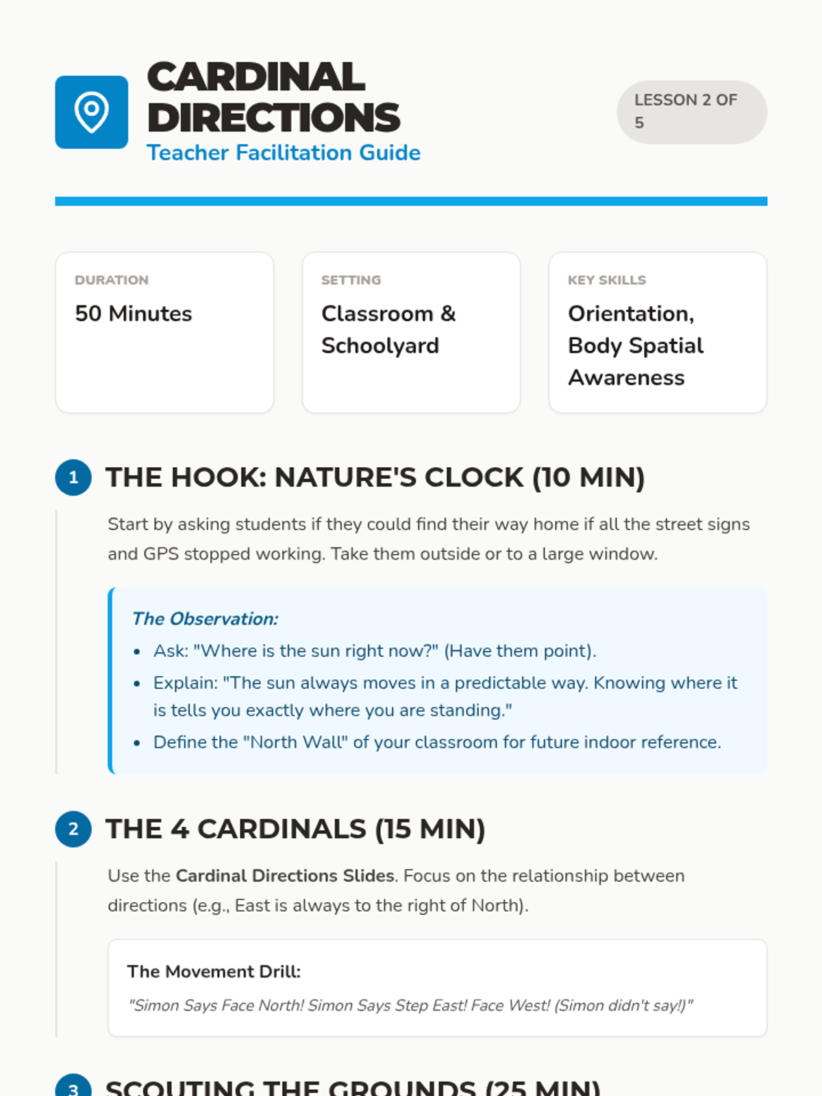 This 4th-grade sequence introduces students to the fundamentals of map reading and compass navigation through a series of hands-on lessons, culminating in a schoolyard orienteering challenge. Students progress from decoding abstract symbols to mastering physical tools like the magnetic compass and calculating their own pace count.