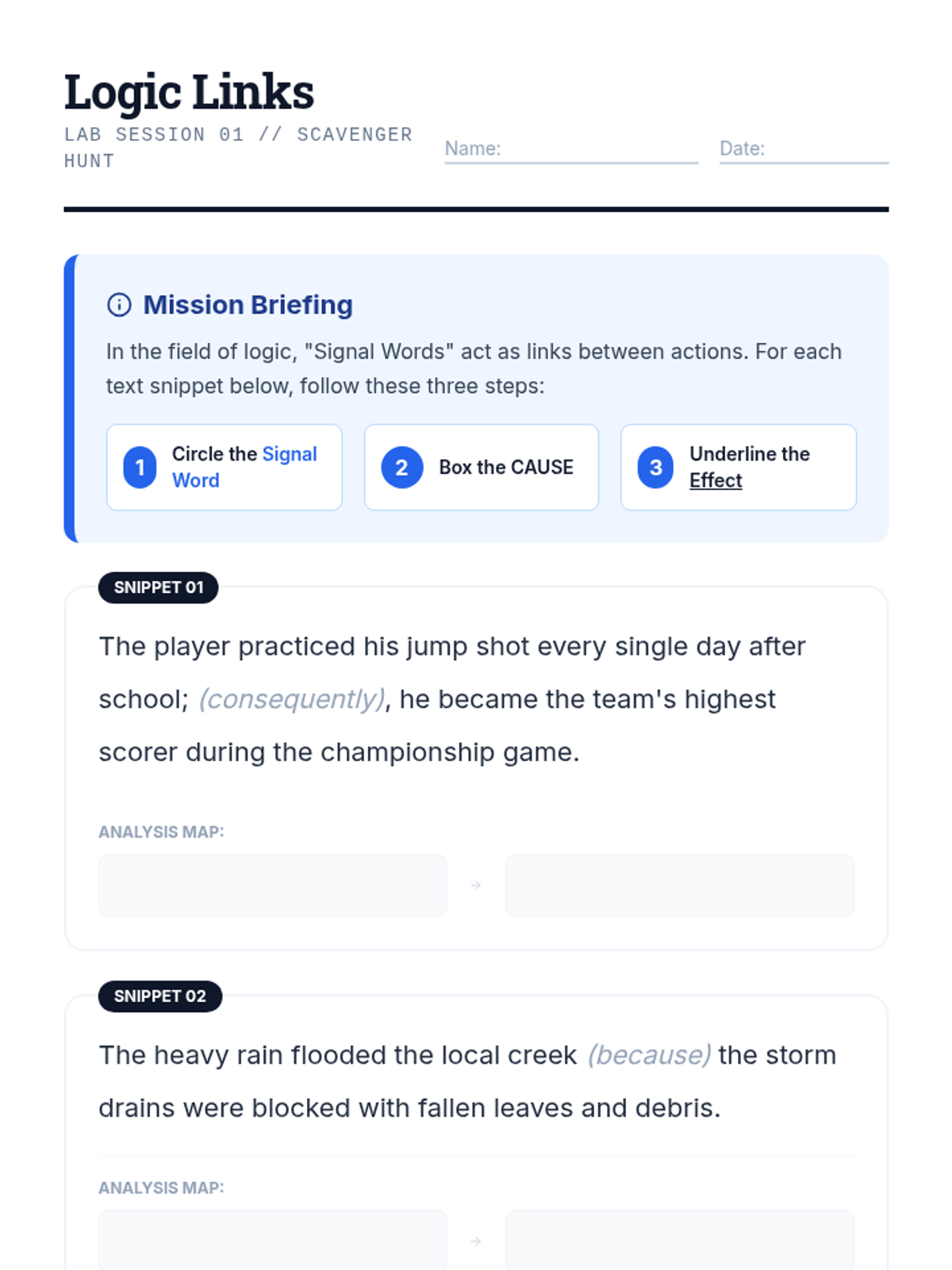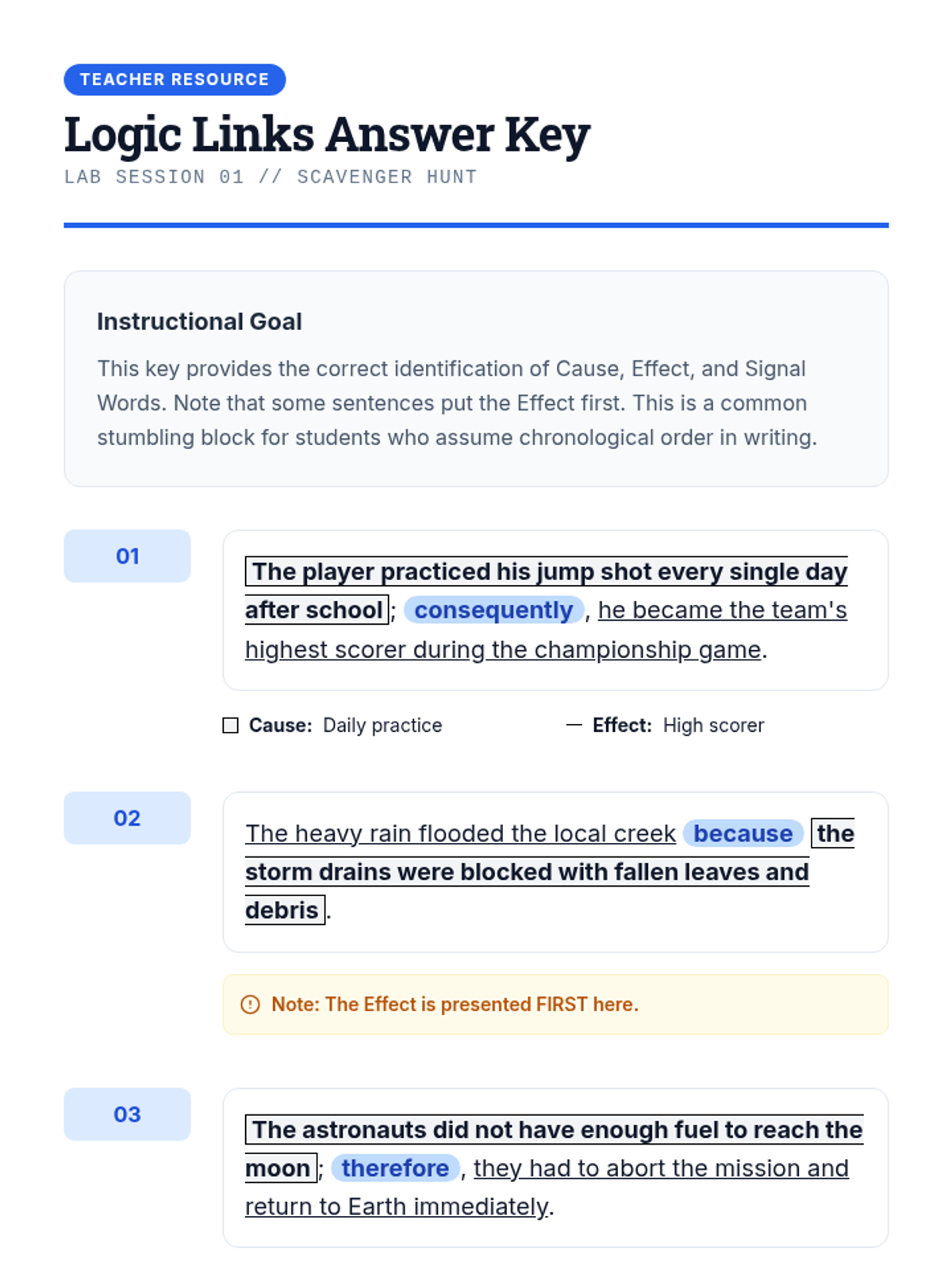 A comprehensive unit for ninth-grade students needing academic support to master cause-and-effect text structures. Students progress from identifying simple signal words to using complex visual tools like Multi-Flow maps and Fishbone diagrams to analyze informational texts.