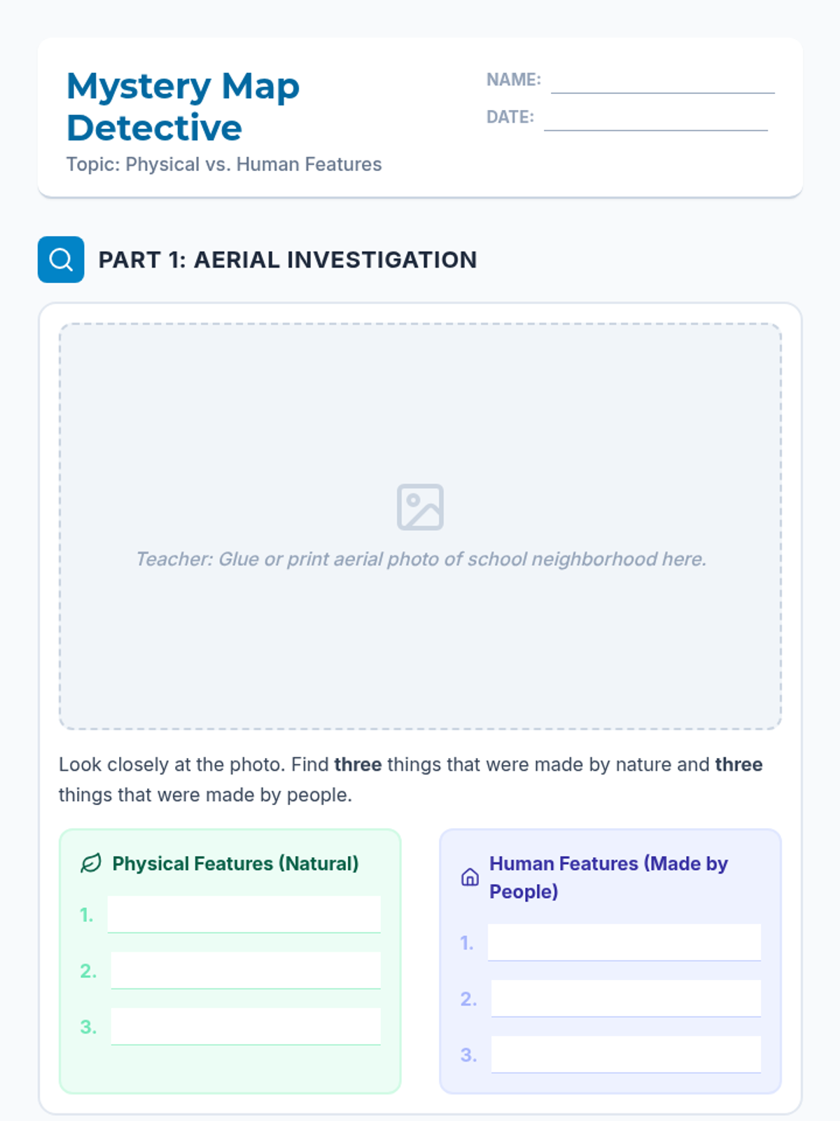 A geography and community unit where students explore their surroundings, learn map skills, and understand the difference between physical and human characteristics in their local area.