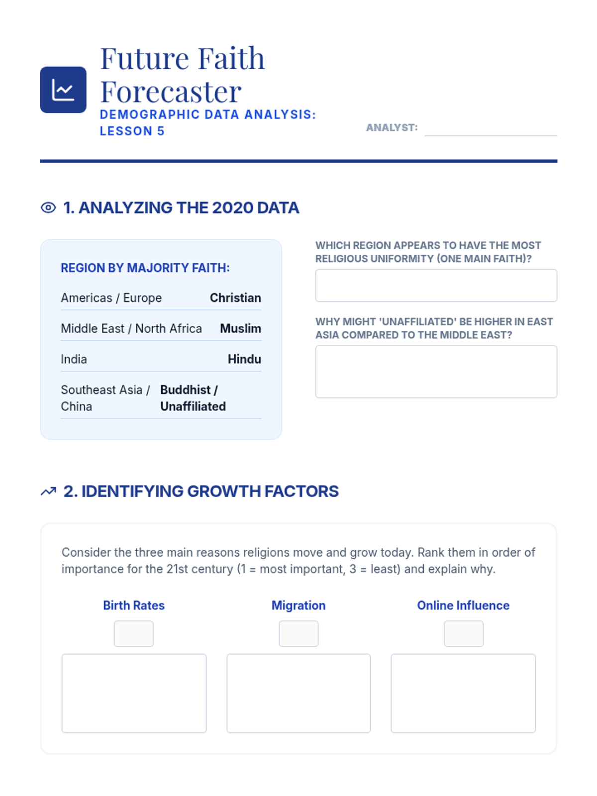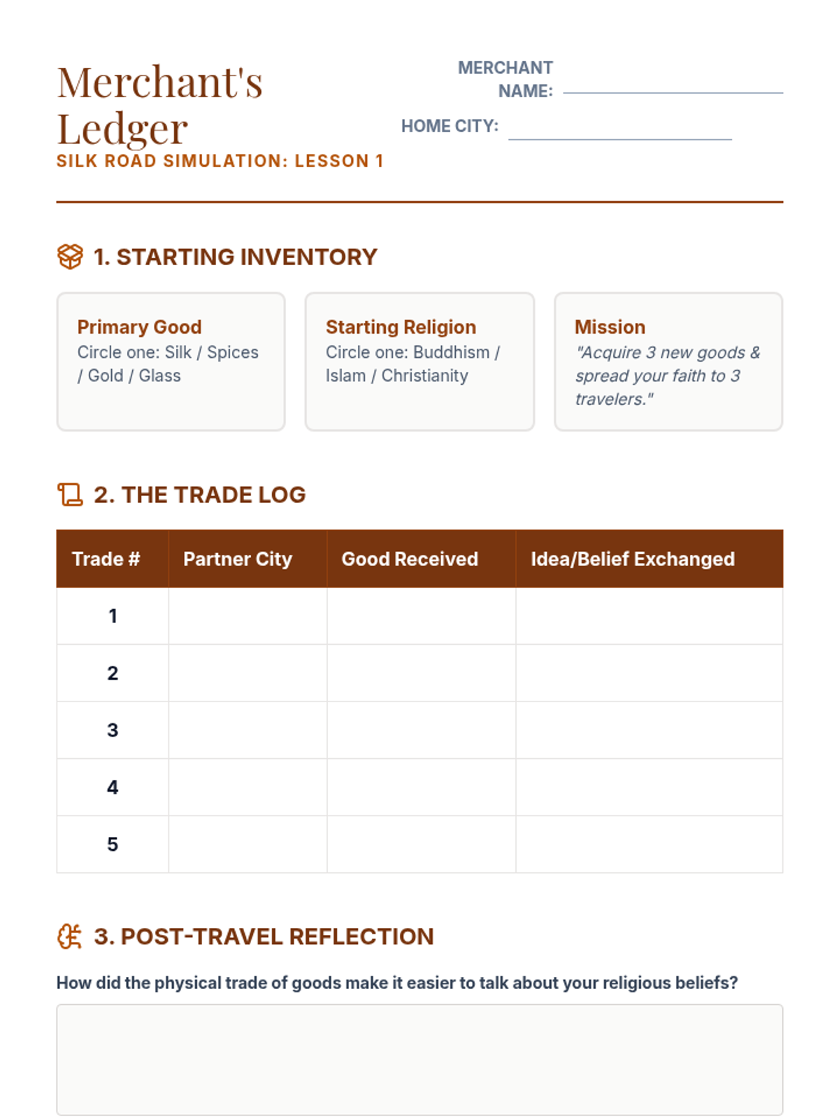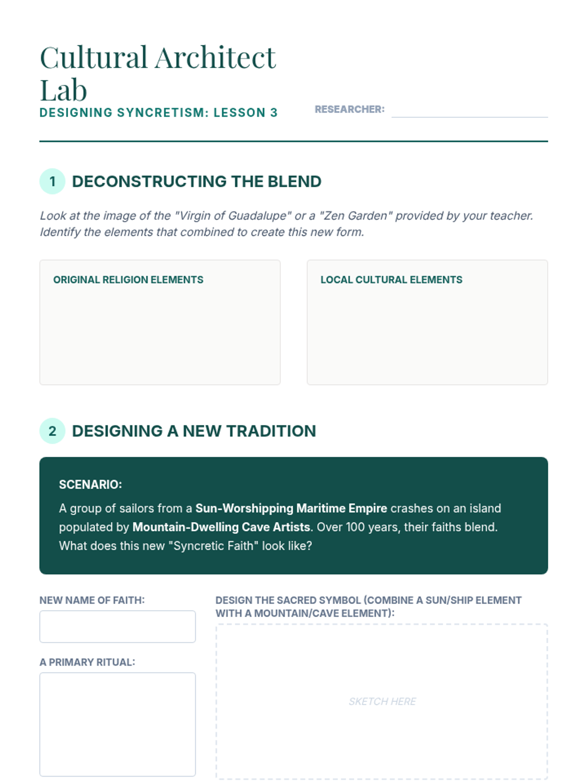 A 5-lesson unit for 8th grade Social Studies exploring how world religions spread and transformed through trade, conquest, and cultural interaction. Students use simulations, case studies, and data analysis to understand religious diffusion and syncretism.