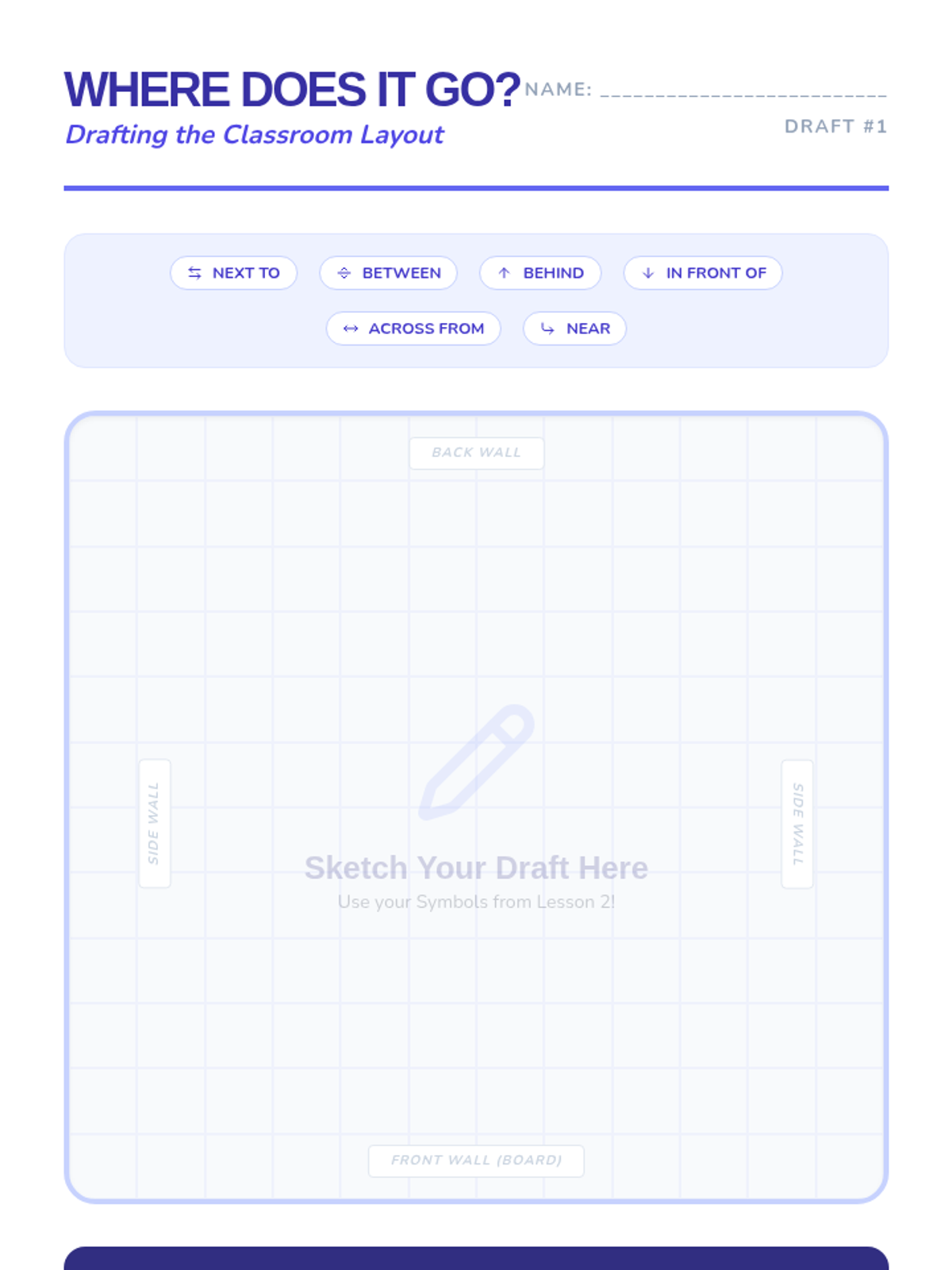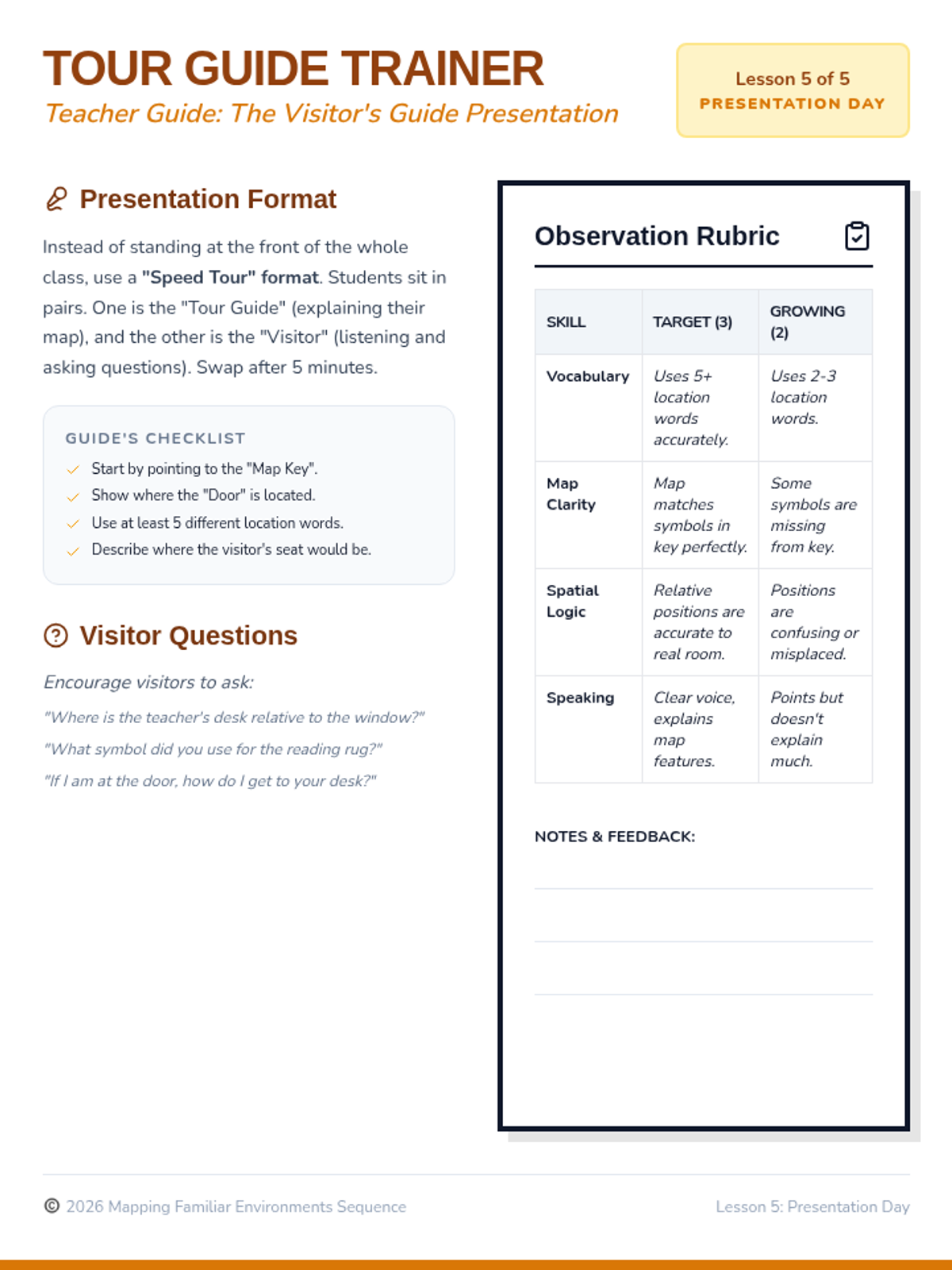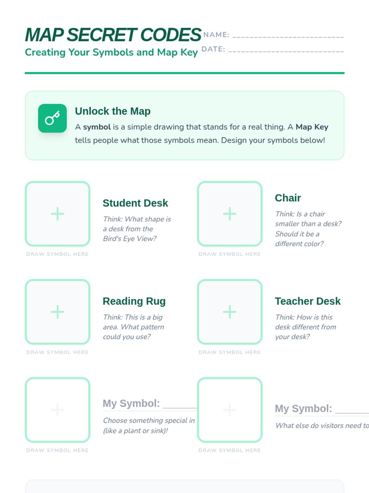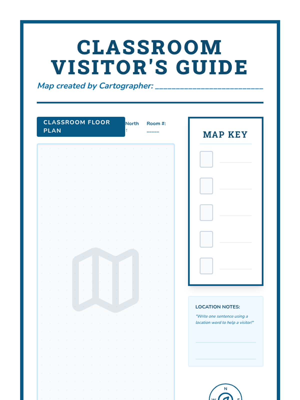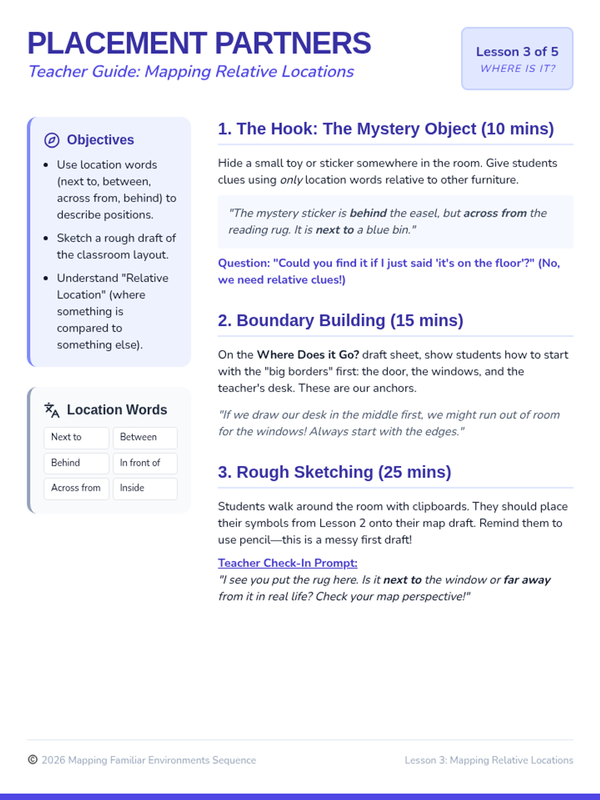 Students explore spatial perspective, symbol creation, and relative location to transform their classroom into a detailed 2D map. The unit culminates in a verbal presentation where students use location words to guide visitors through their mapped environment.