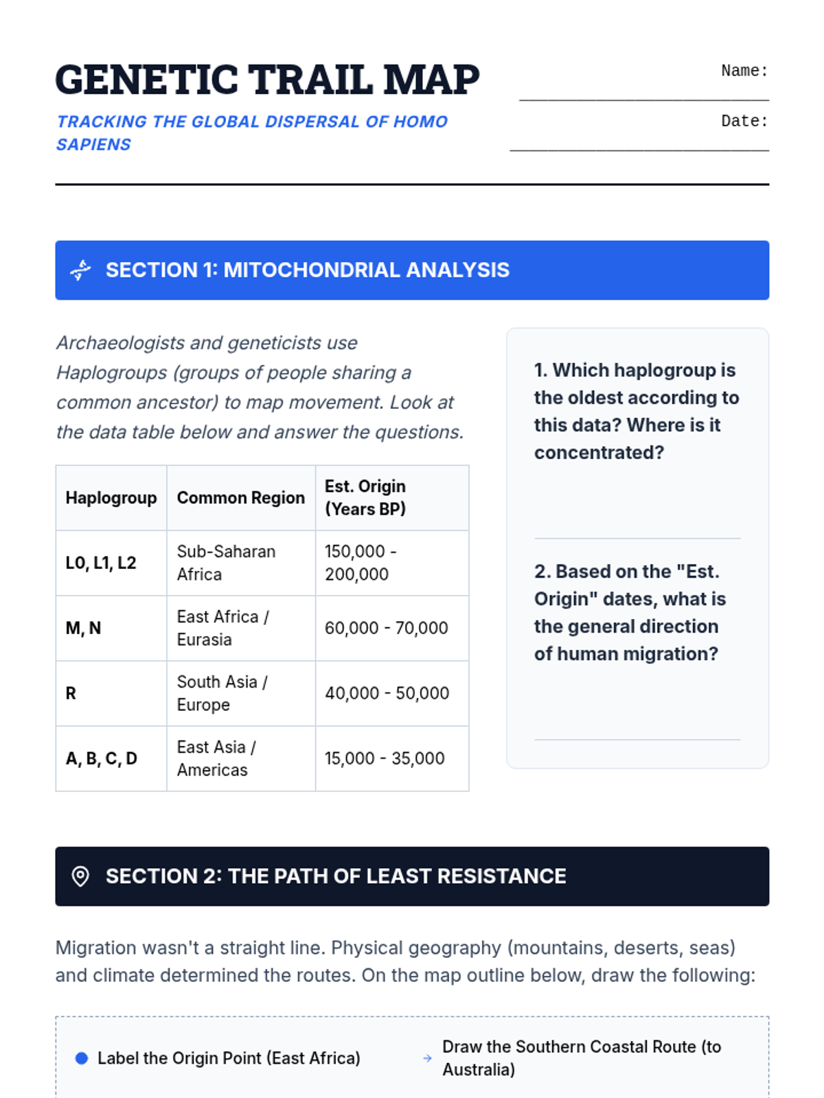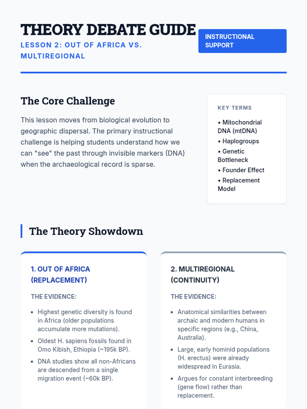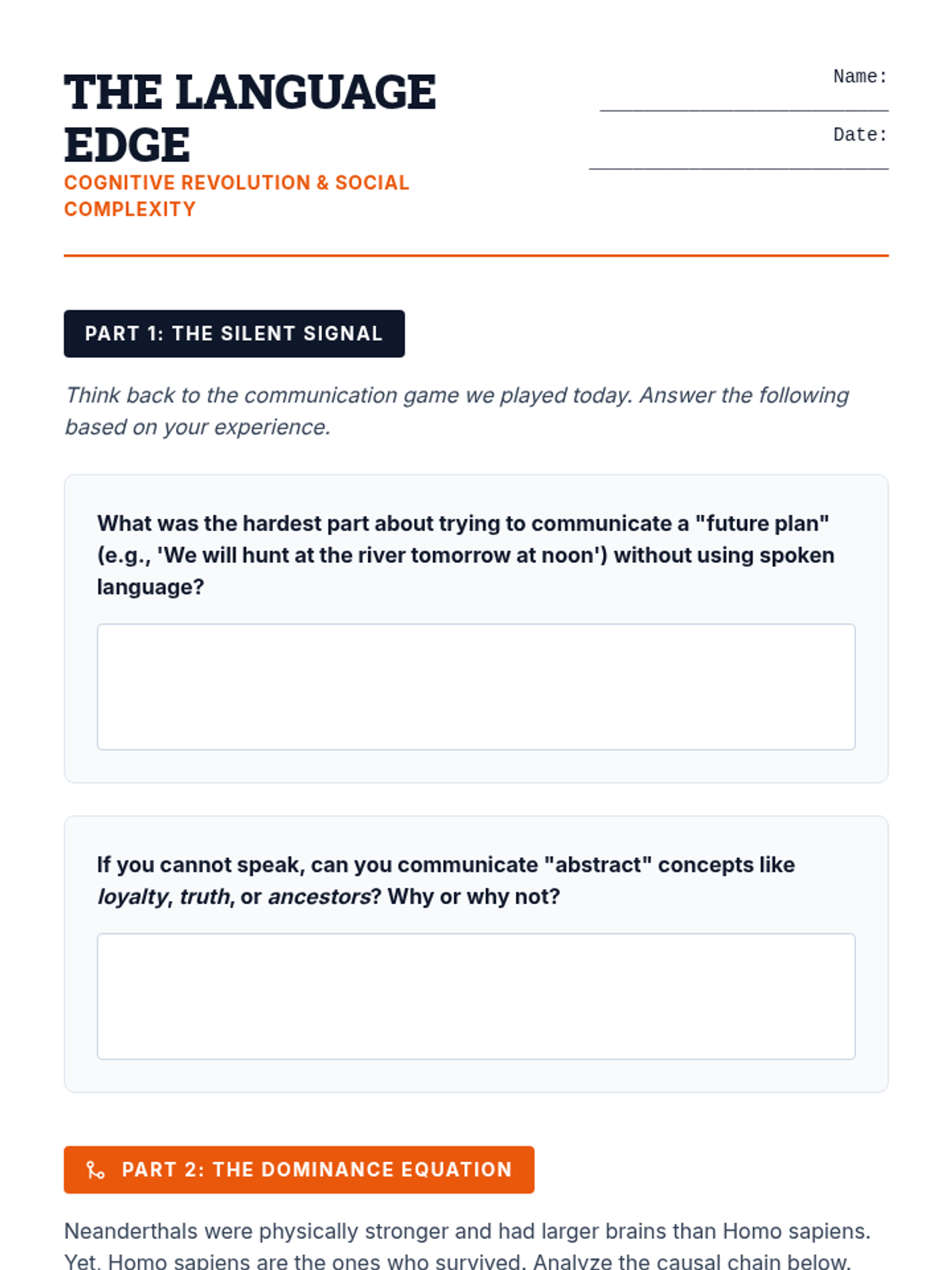 A comprehensive 10th-grade sequence tracing human biological evolution and global migration, emphasizing the impact of environmental pressures and technological innovation from the early hominids to the cognitive revolution.