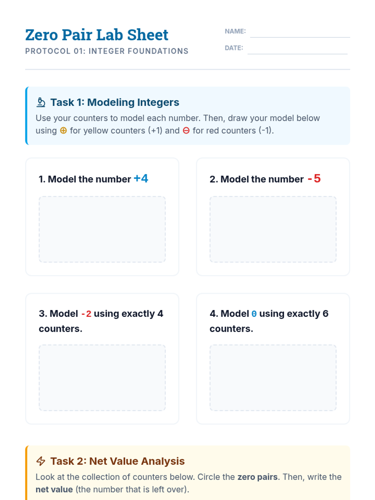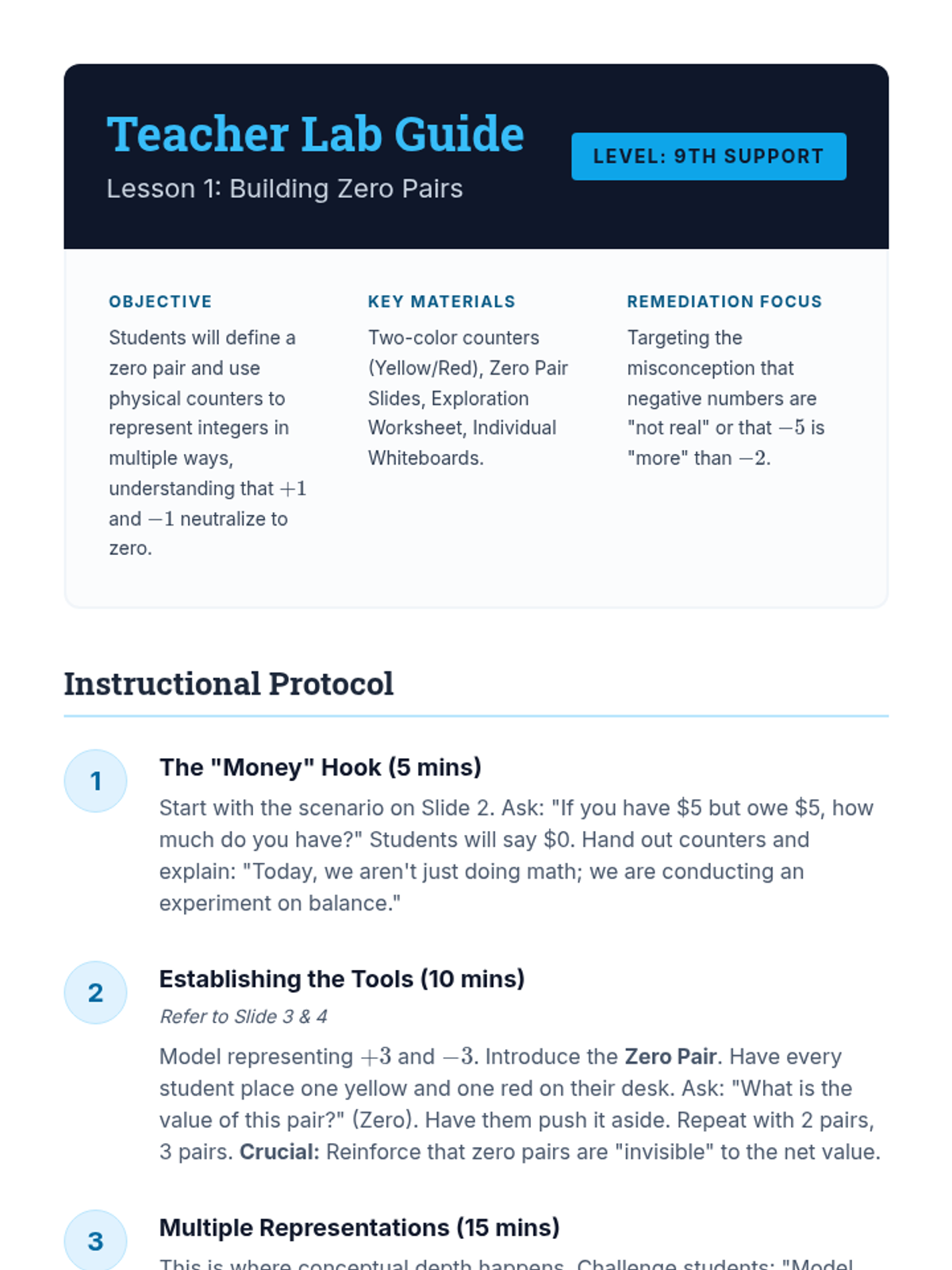 A comprehensive sequence designed to remediate integer operation deficits for 9th-grade students using concrete manipulatives, representational models, and abstract rule derivation. Students move from physical two-color counters to number line vectors, ultimately mastering integer fluency through conceptual understanding.