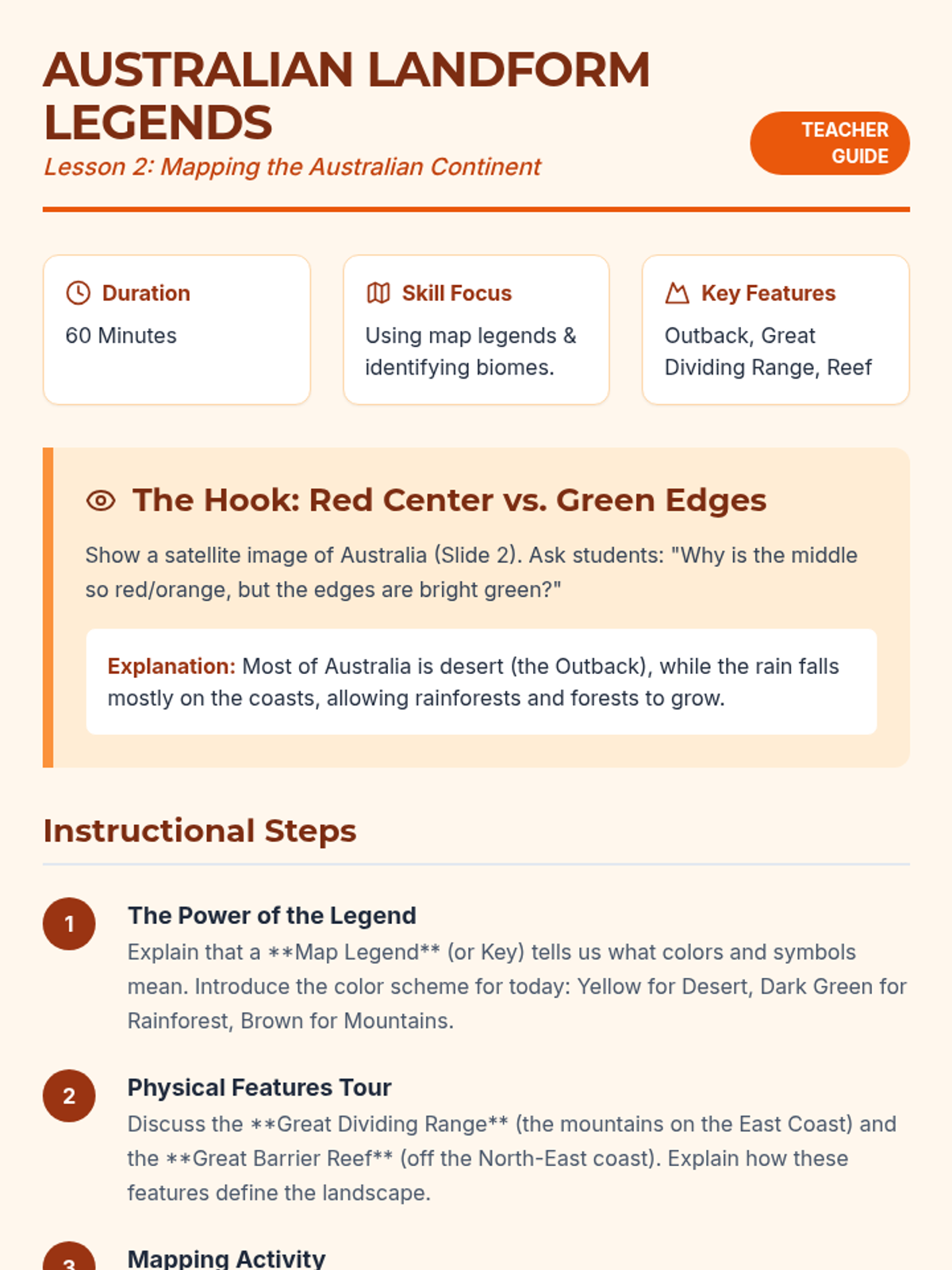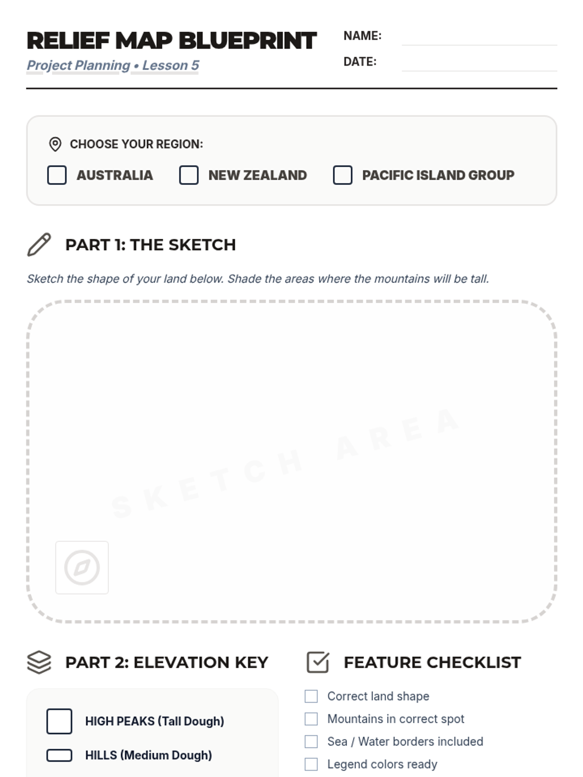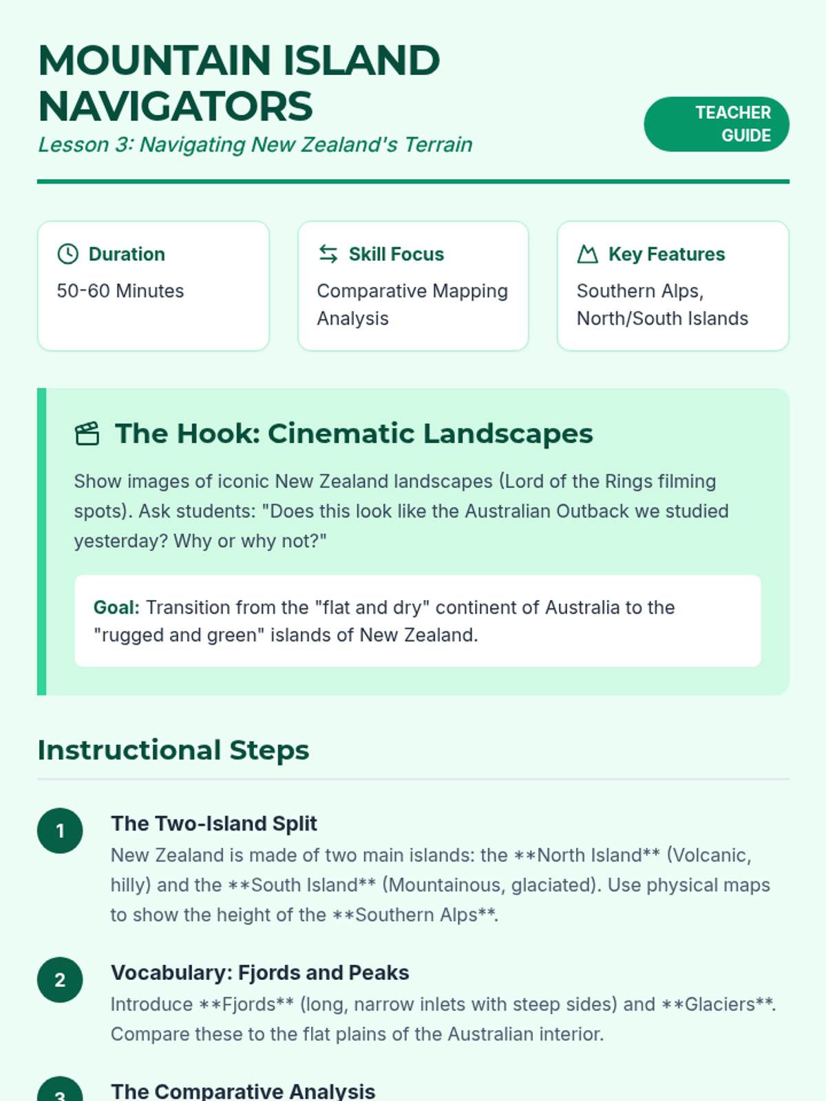 A comprehensive 5-lesson sequence for 3rd graders focused on the physical geography of Australia, New Zealand, and the Pacific Islands. Students develop cartography skills, spatial awareness, and an understanding of diverse Oceanic landforms through hands-on mapping projects and comparative analysis.