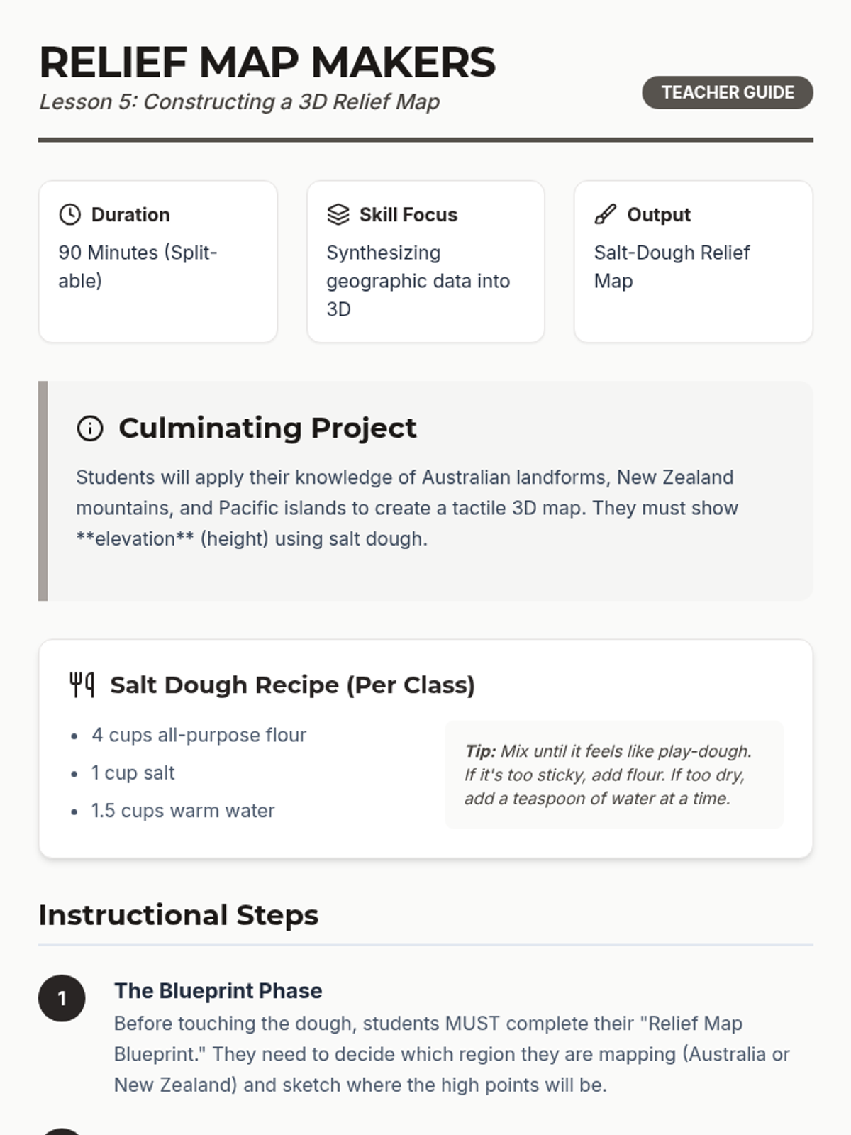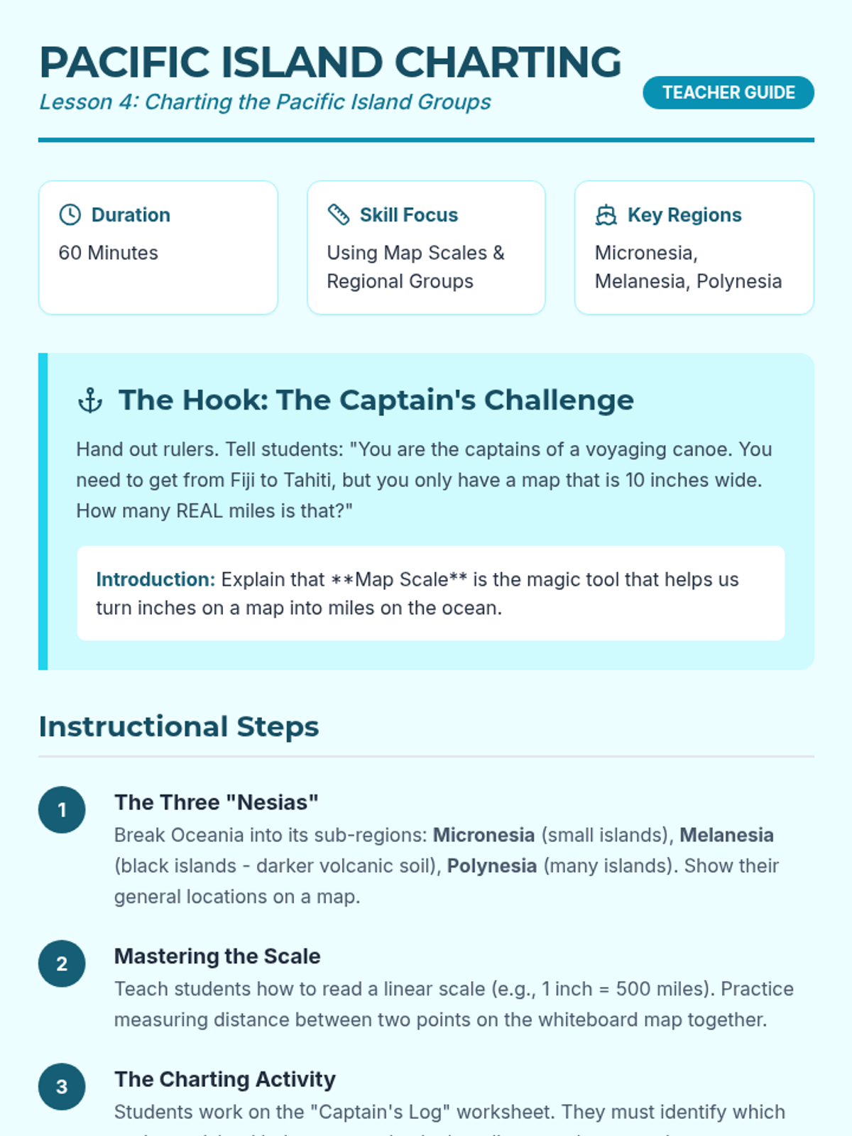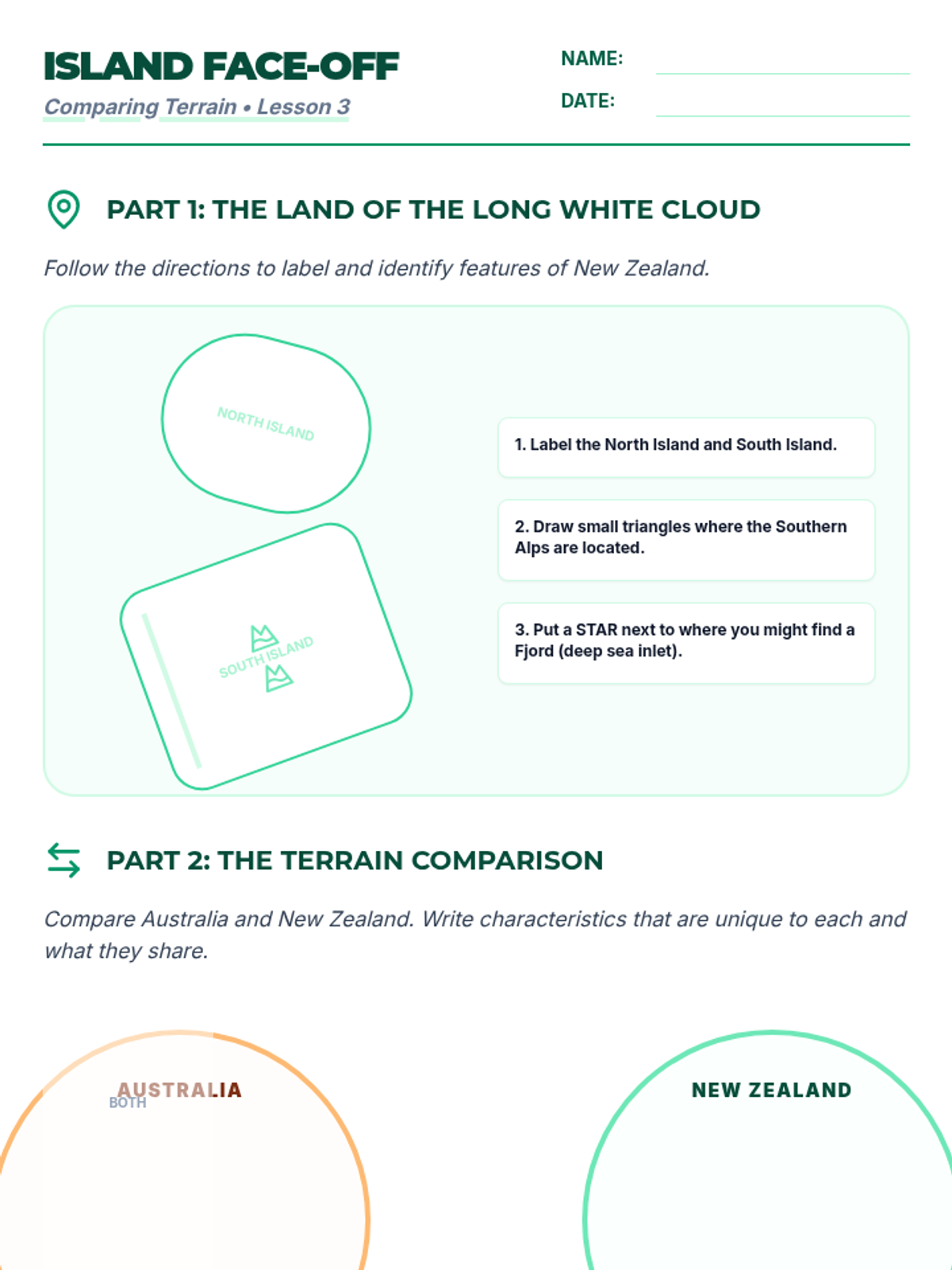 A comprehensive 5-lesson sequence for 3rd graders focused on the physical geography of Australia, New Zealand, and the Pacific Islands. Students develop cartography skills, spatial awareness, and an understanding of diverse Oceanic landforms through hands-on mapping projects and comparative analysis.