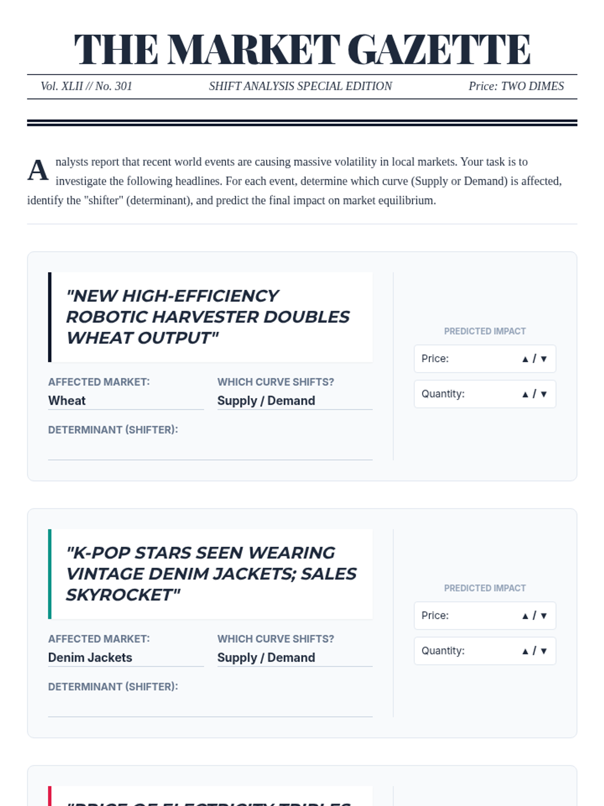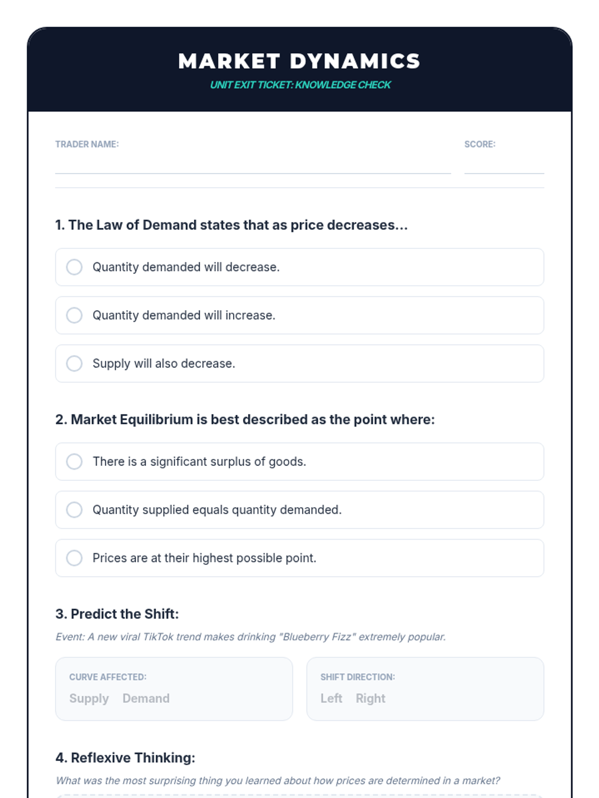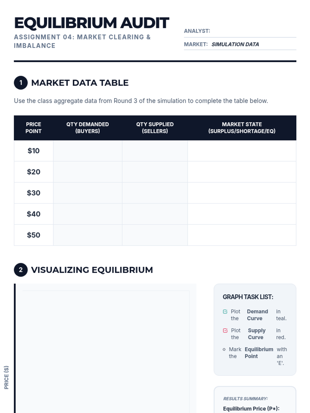 This sequence immerses students in the mechanics of the market economy through active simulation and data analysis. Students begin by defining key terms before participating in a multi-round market simulation where they act as buyers and sellers to discover how equilibrium prices naturally emerge. Following the activity, students translate their behavioral data into supply and demand graphs to visualize market forces. The unit concludes with an analysis of external factors that shift these curves, allowing students to predict how real-world events impact prices and availability.