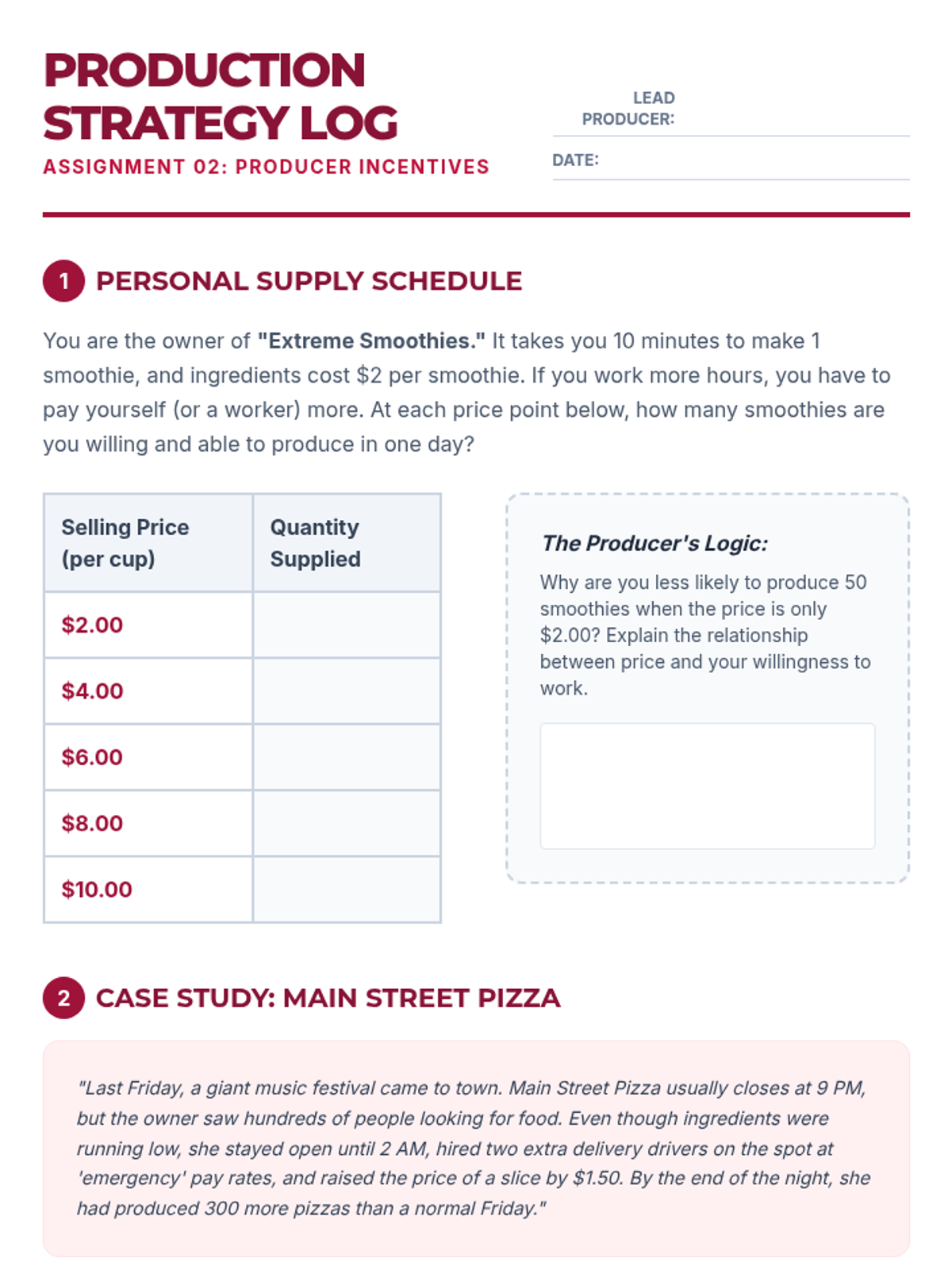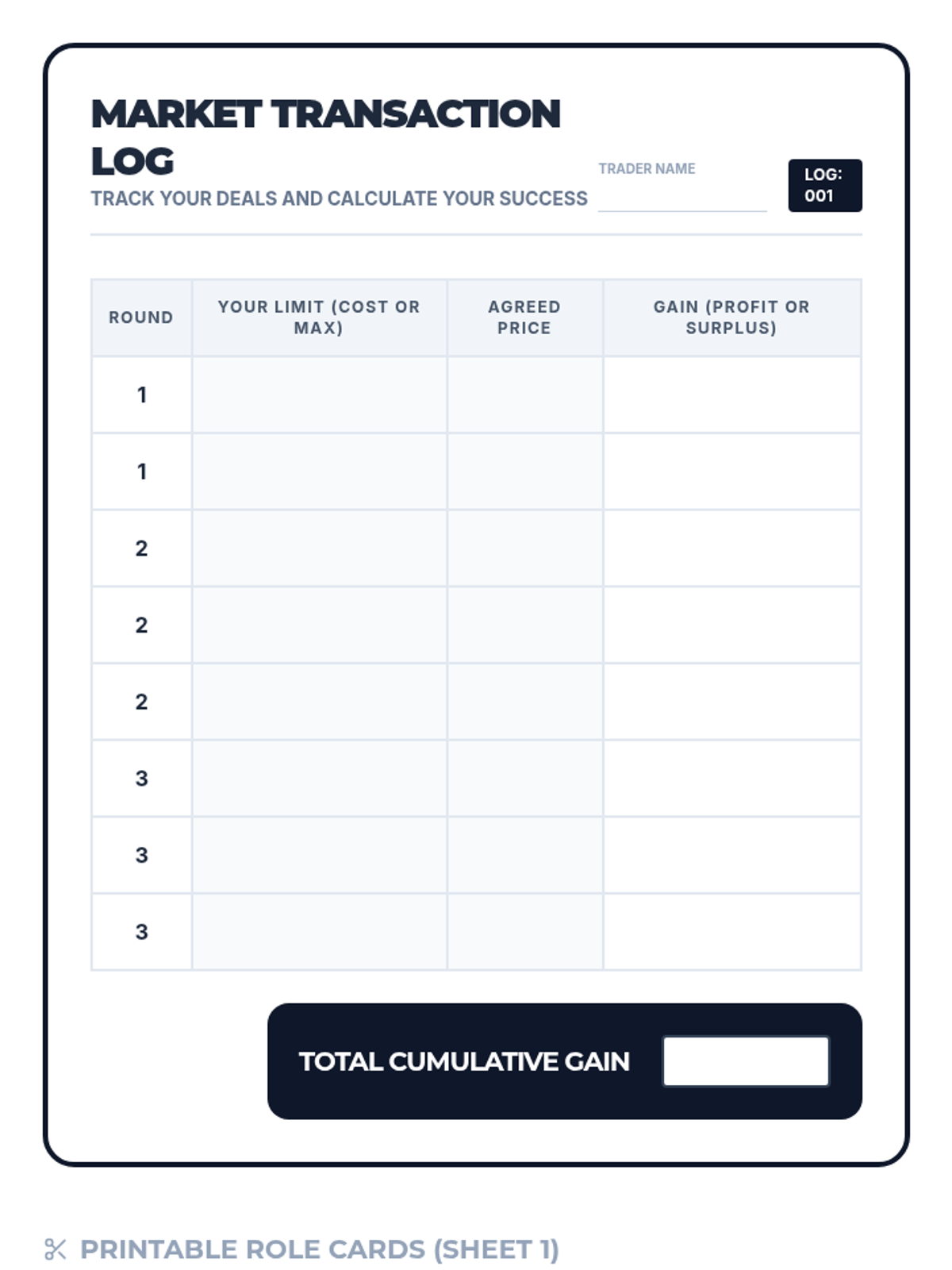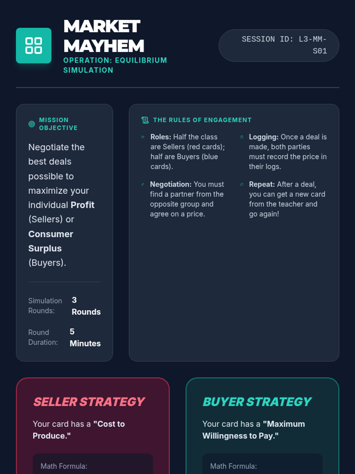 This sequence immerses students in the mechanics of the market economy through active simulation and data analysis. Students begin by defining key terms before participating in a multi-round market simulation where they act as buyers and sellers to discover how equilibrium prices naturally emerge. Following the activity, students translate their behavioral data into supply and demand graphs to visualize market forces. The unit concludes with an analysis of external factors that shift these curves, allowing students to predict how real-world events impact prices and availability.