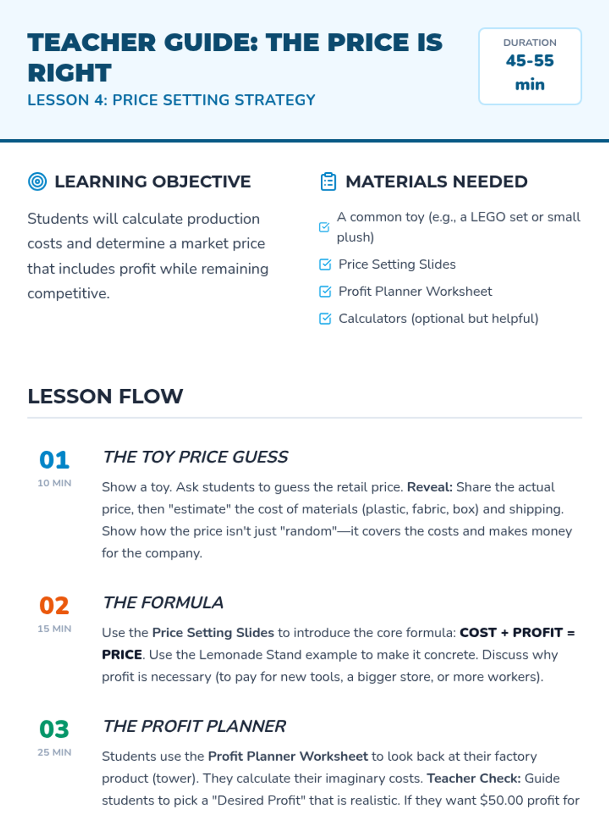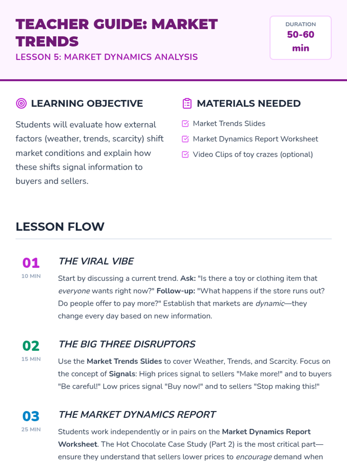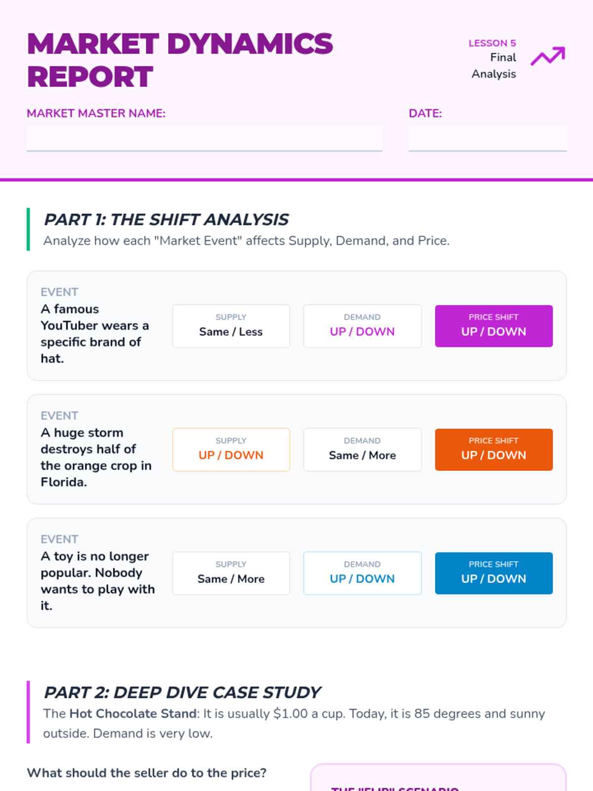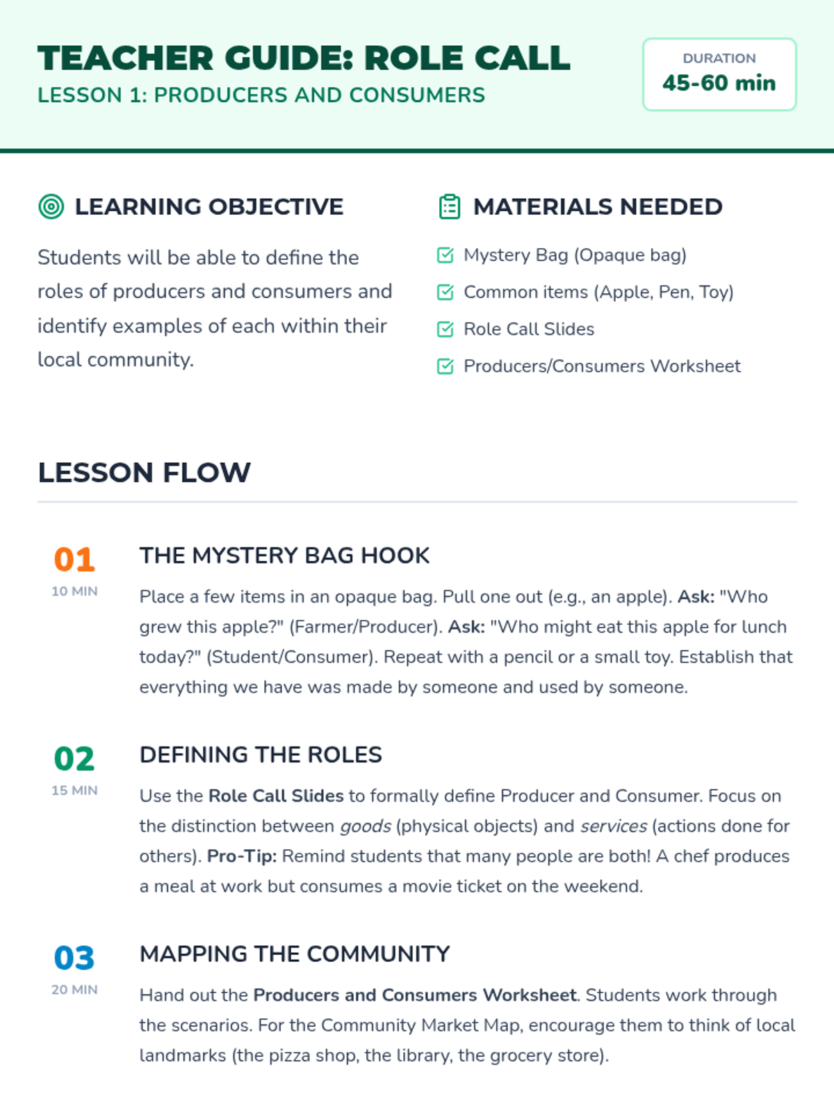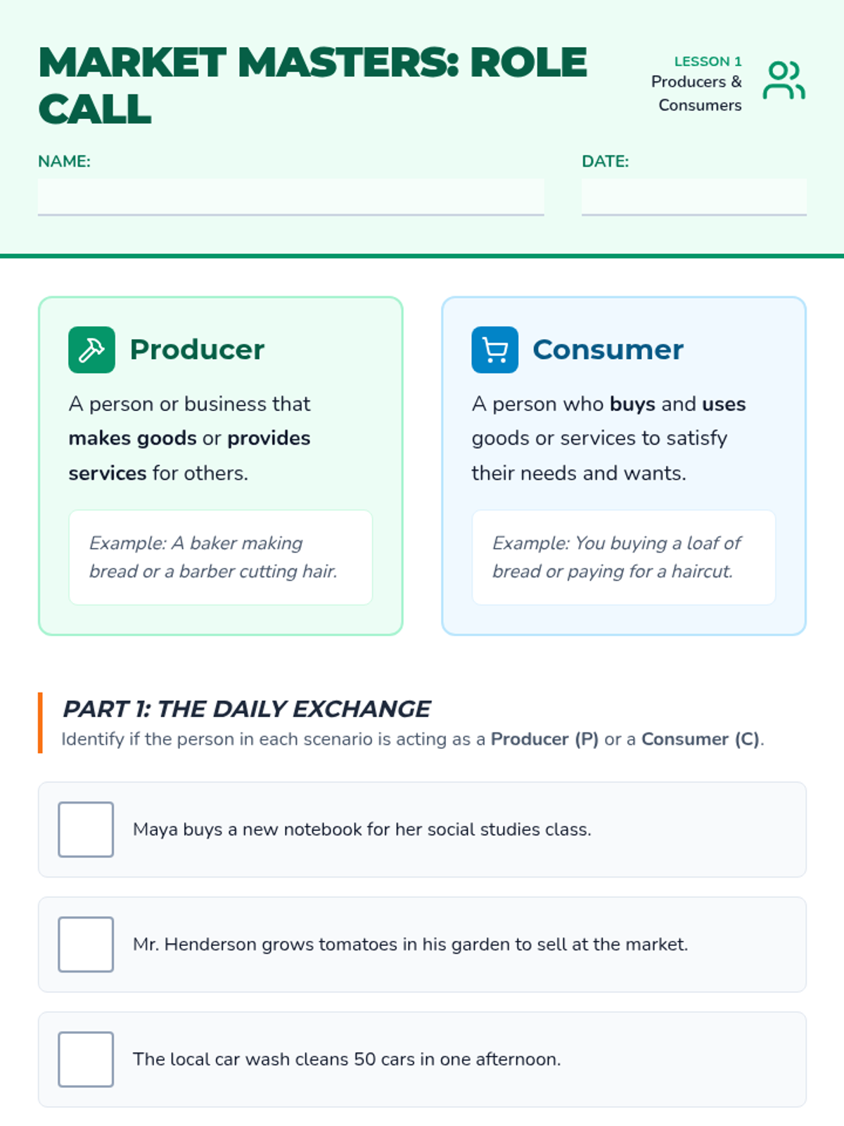 A comprehensive 3rd-grade sequence exploring the fundamentals of economics, from personal roles as producers and consumers to the complex interactions of supply, demand, and market pricing. students engage in hands-on simulations and analysis to understand how goods are valued and prices are set.