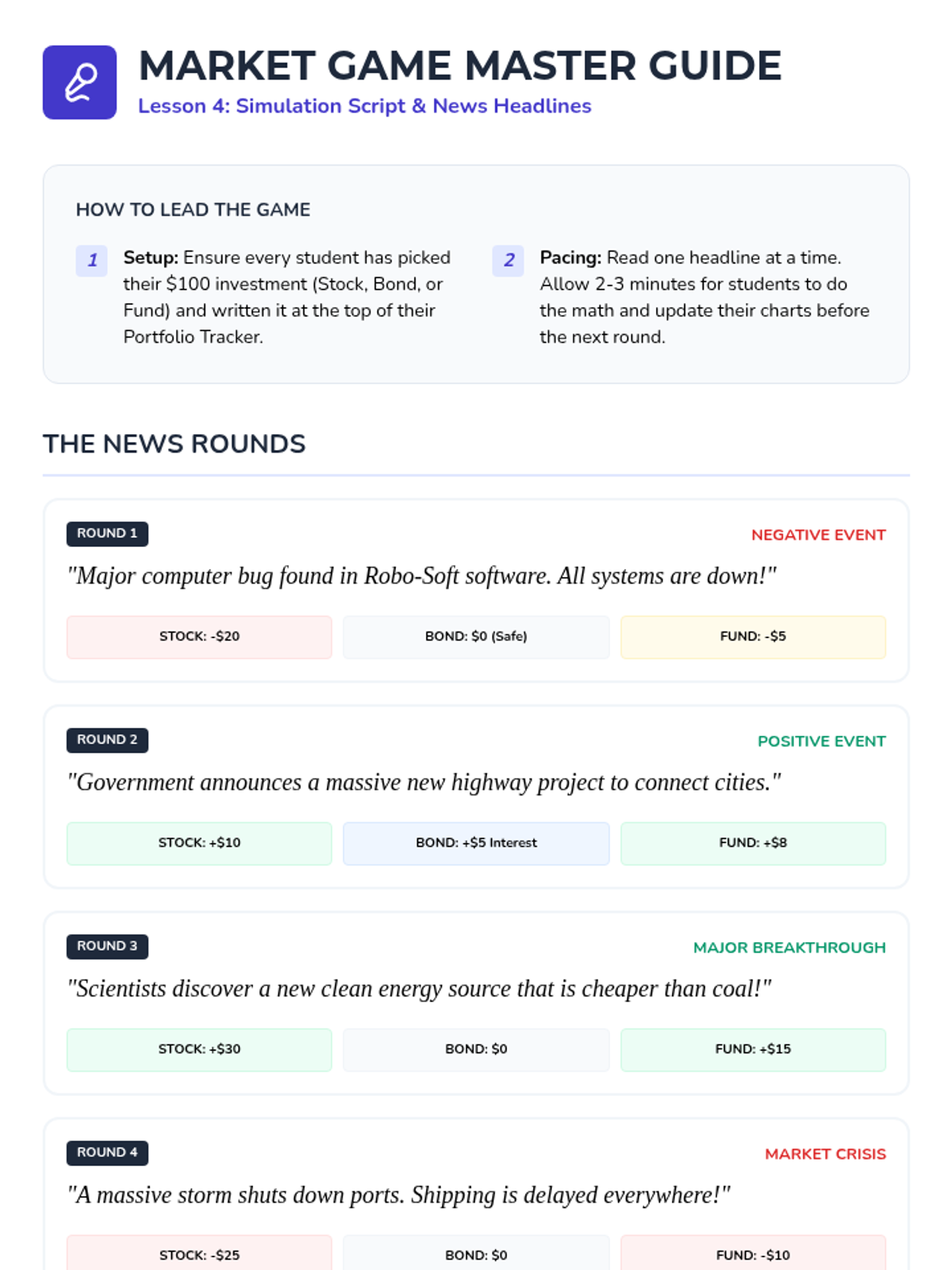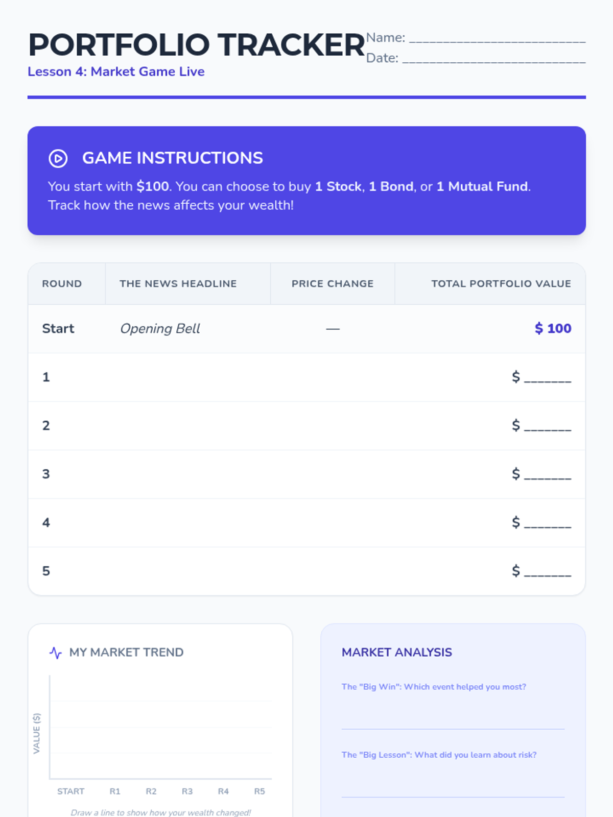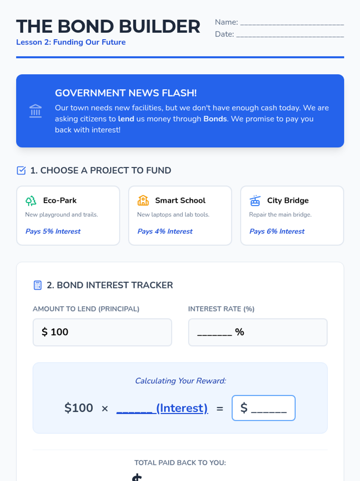 Students explore the world of investing by distinguishing between stocks (ownership), bonds (loans), and mutual funds (pooling). Through simulations, market games, and analogies, 5th graders learn how capital is raised and how markets fluctuate based on real-world events.
