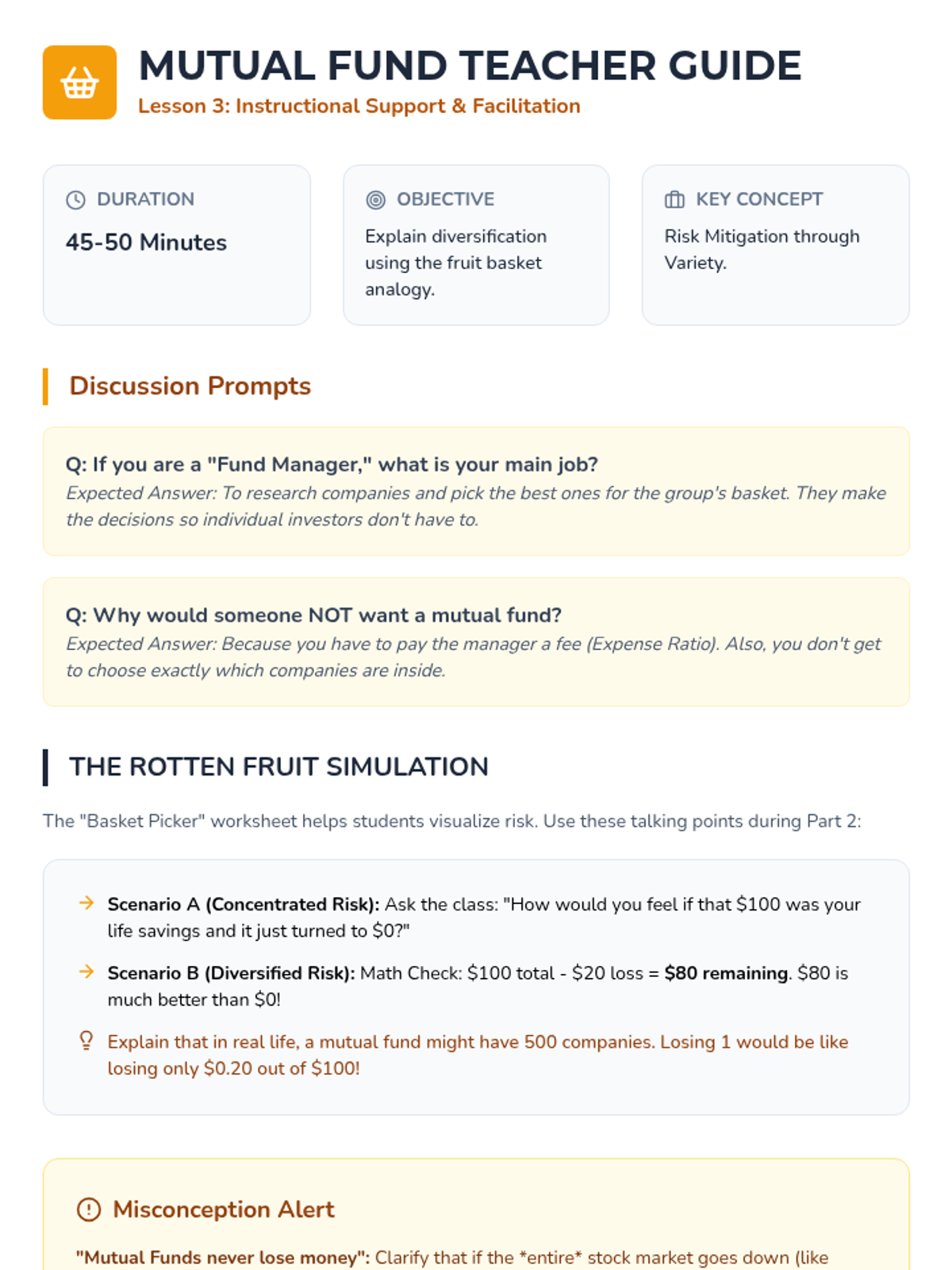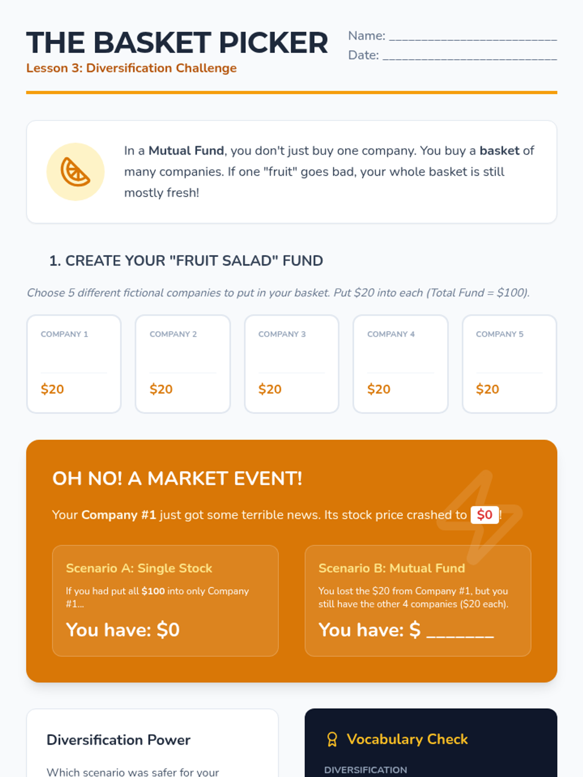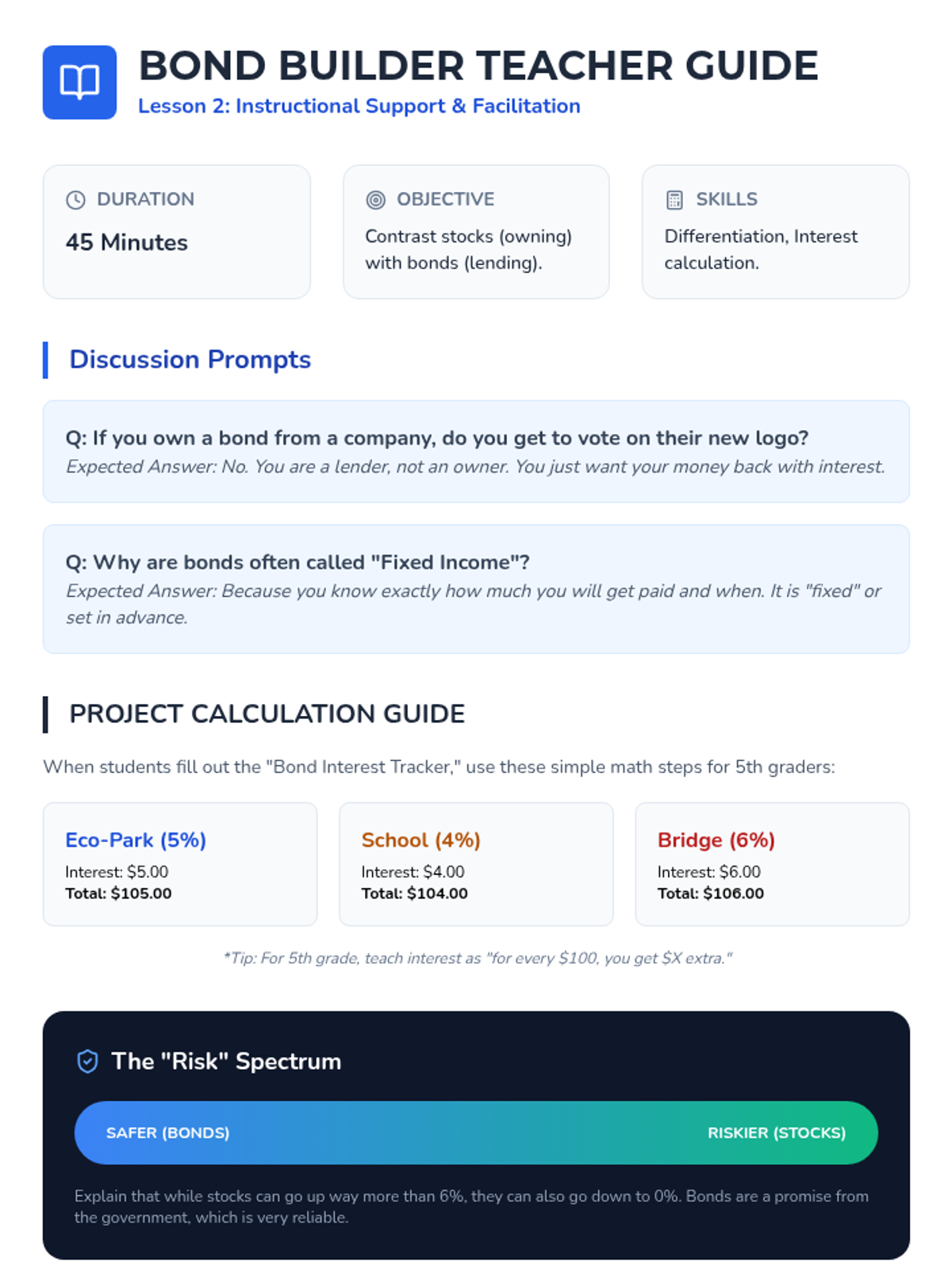 Students explore the world of investing by distinguishing between stocks (ownership), bonds (loans), and mutual funds (pooling). Through simulations, market games, and analogies, 5th graders learn how capital is raised and how markets fluctuate based on real-world events.
