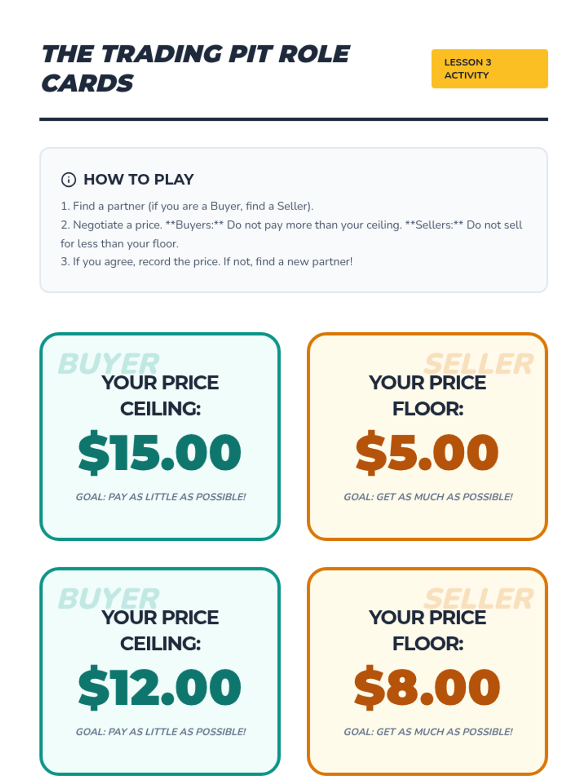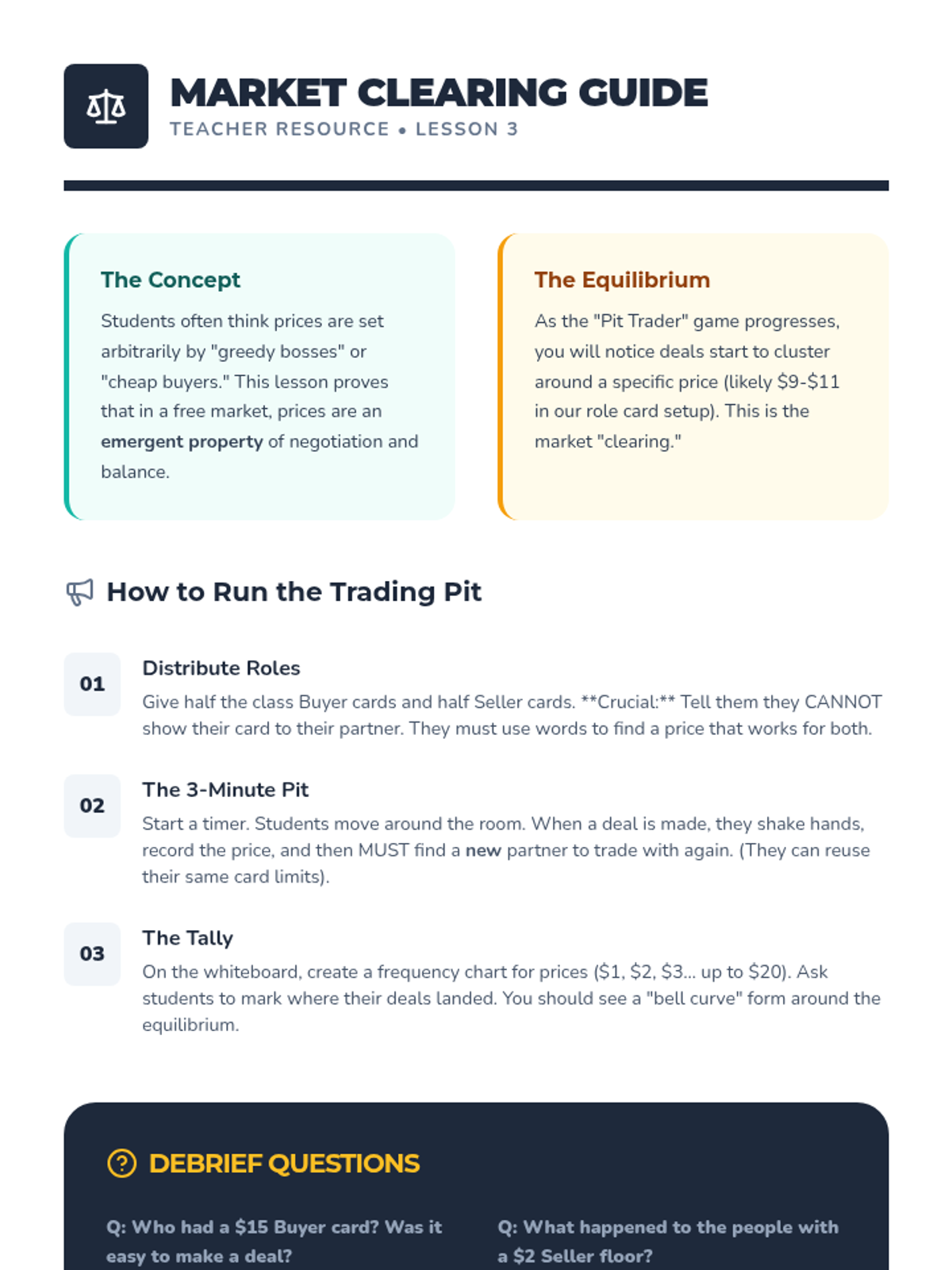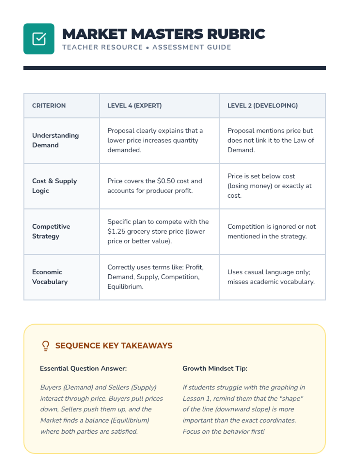 A comprehensive 5-lesson sequence for 5th-grade students exploring the fundamentals of market economics, specifically the interaction between supply, demand, competition, and price determination through simulations and workshops.