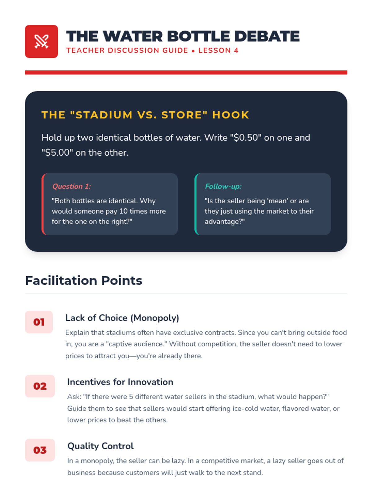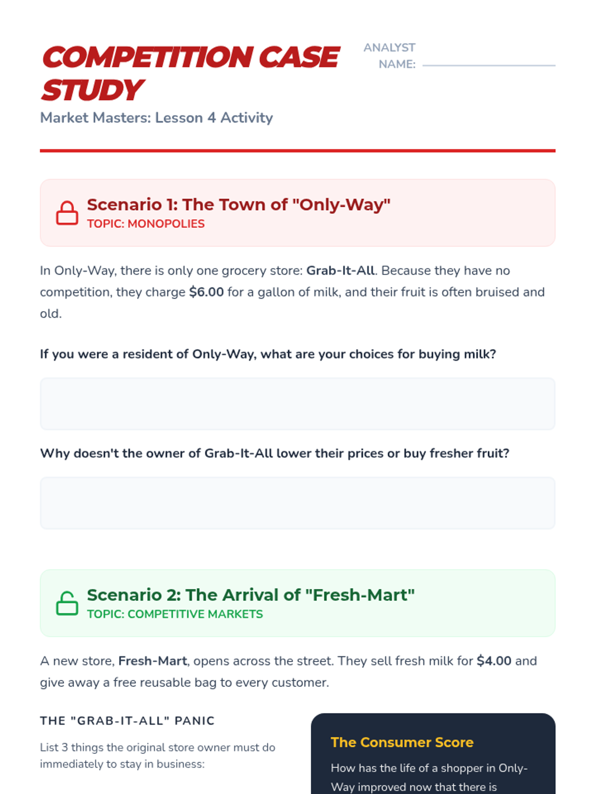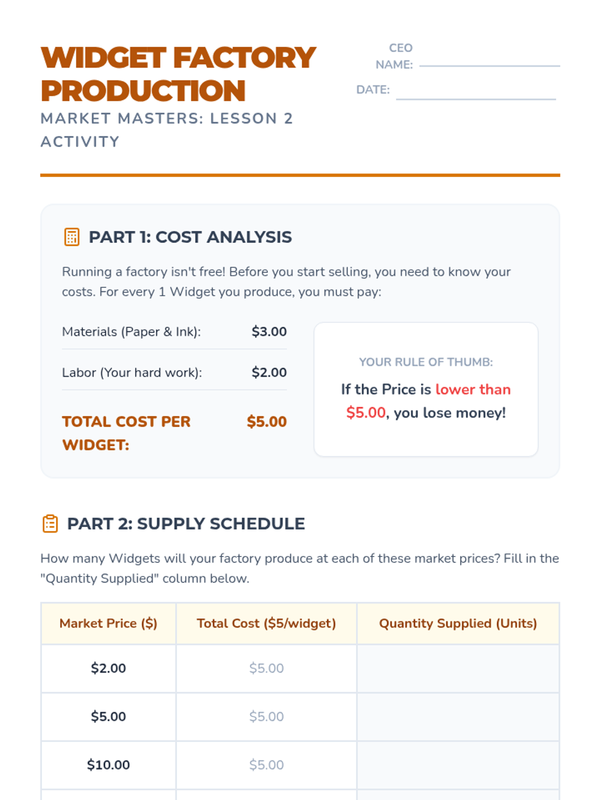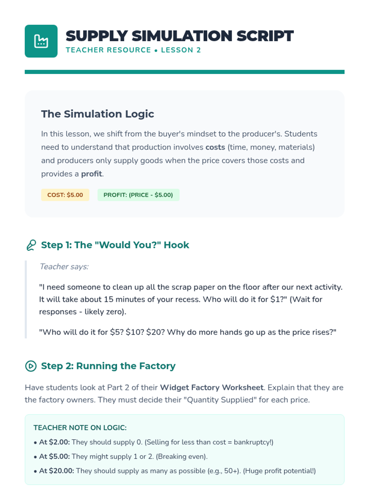 A comprehensive 5-lesson sequence for 5th-grade students exploring the fundamentals of market economics, specifically the interaction between supply, demand, competition, and price determination through simulations and workshops.