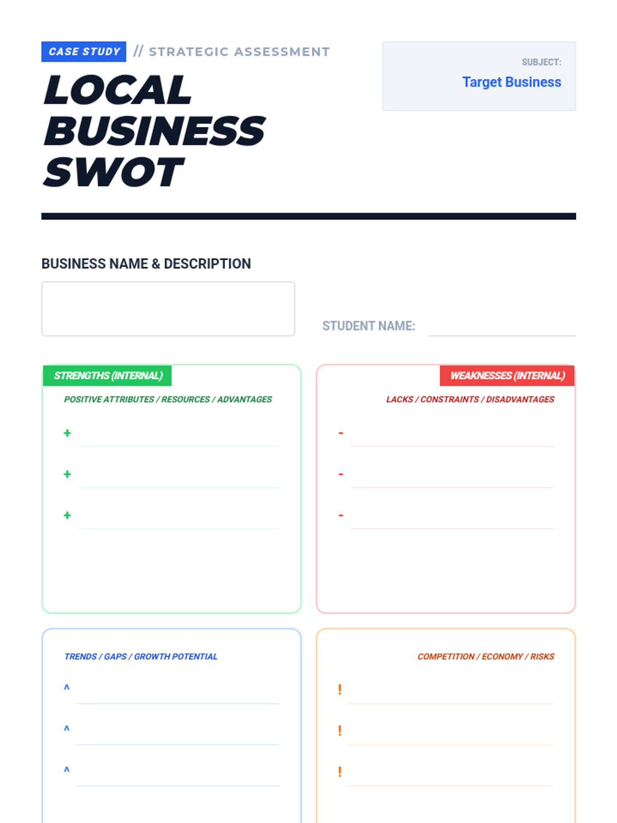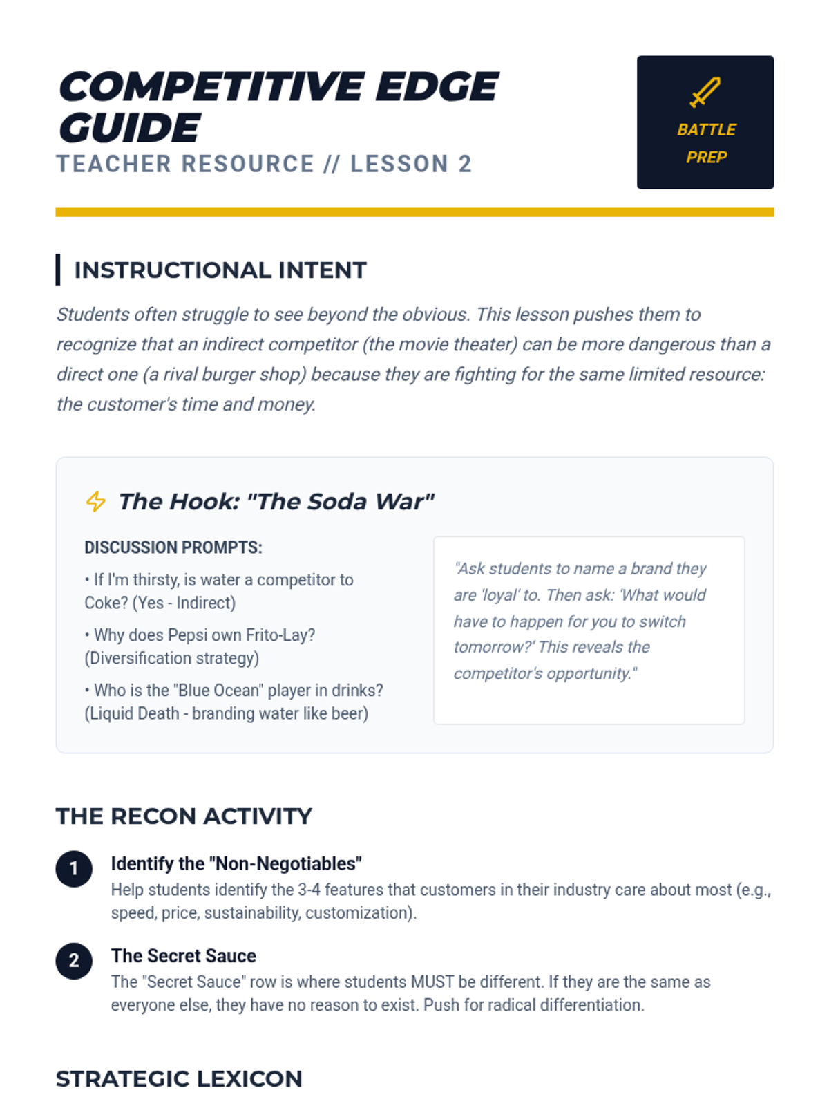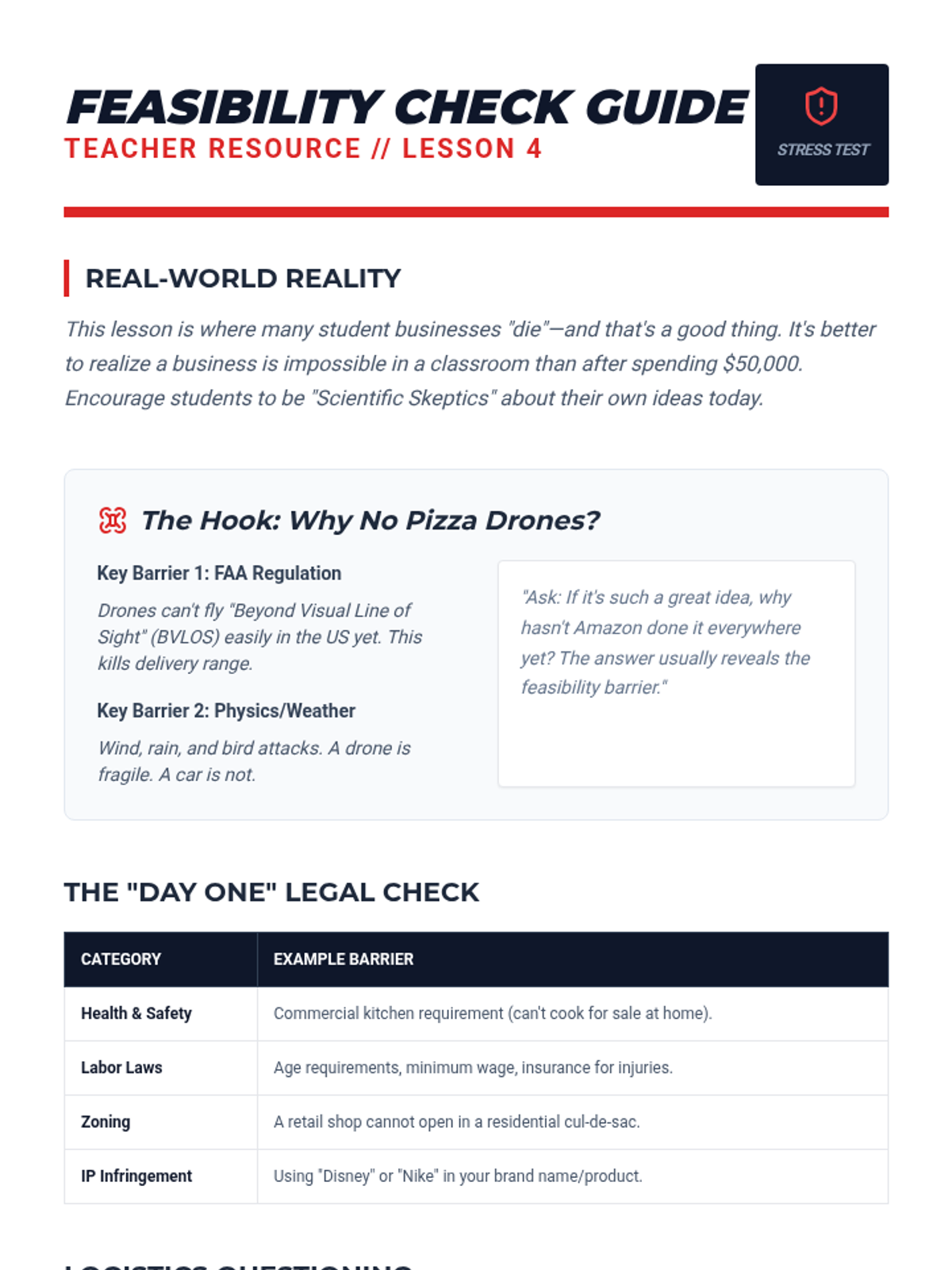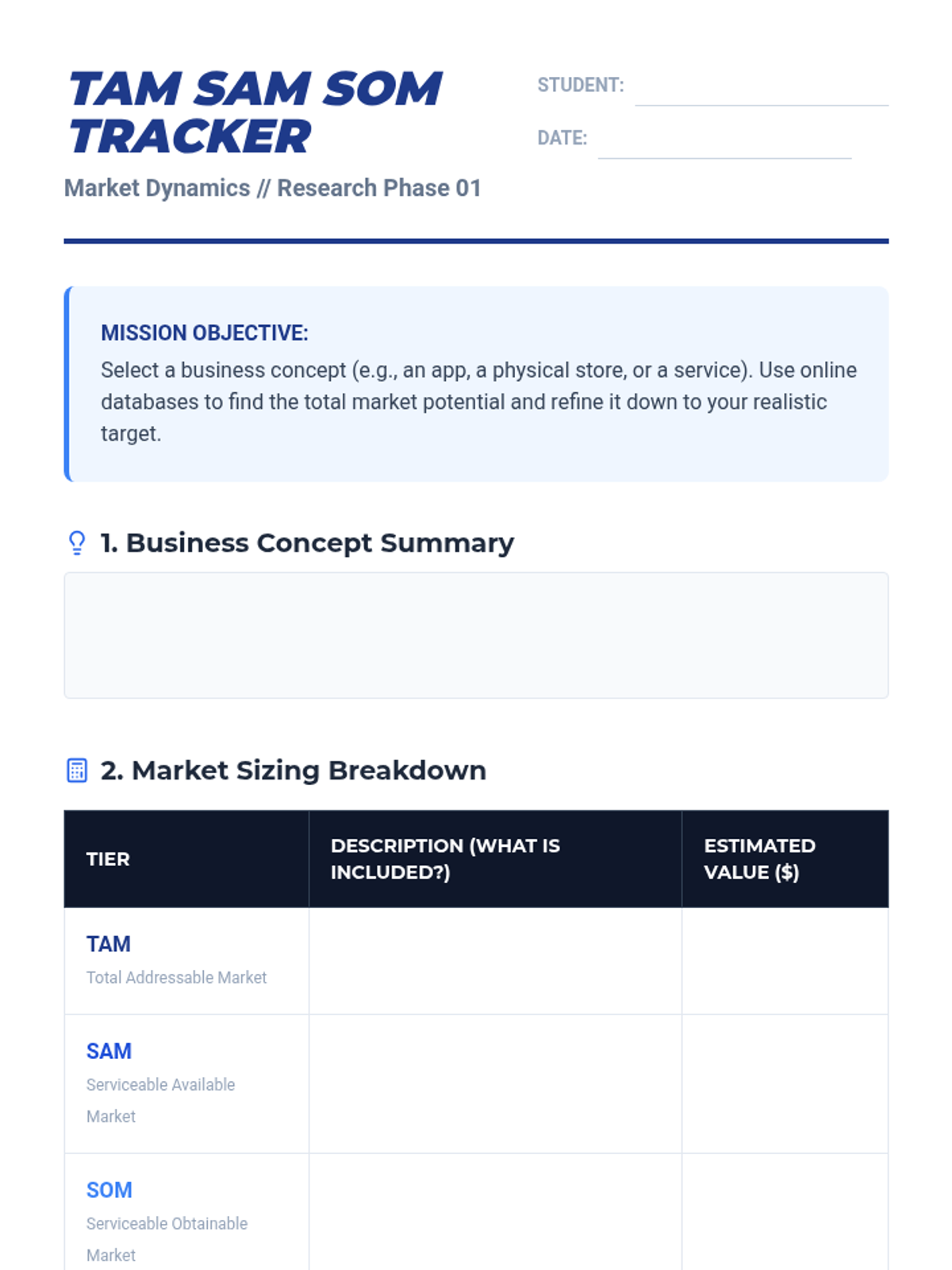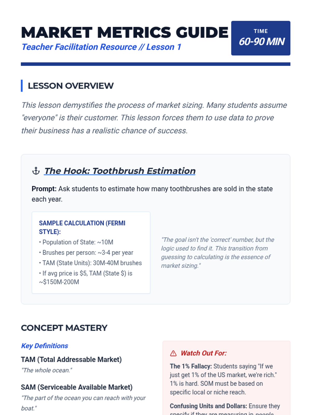 A comprehensive sequence for 10th-grade students focusing on market feasibility and competitive analysis. Students progress from learning market sizing (TAM/SAM/SOM) to conducting competitive research, performing SWOT analyses, and evaluating operational risks, culminating in a formal feasibility report.