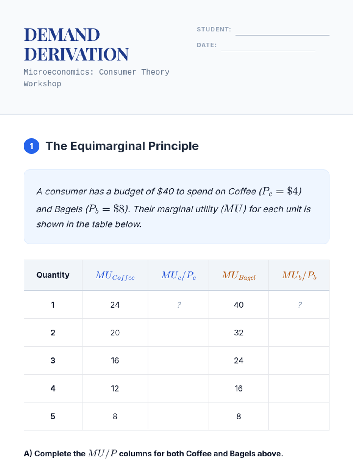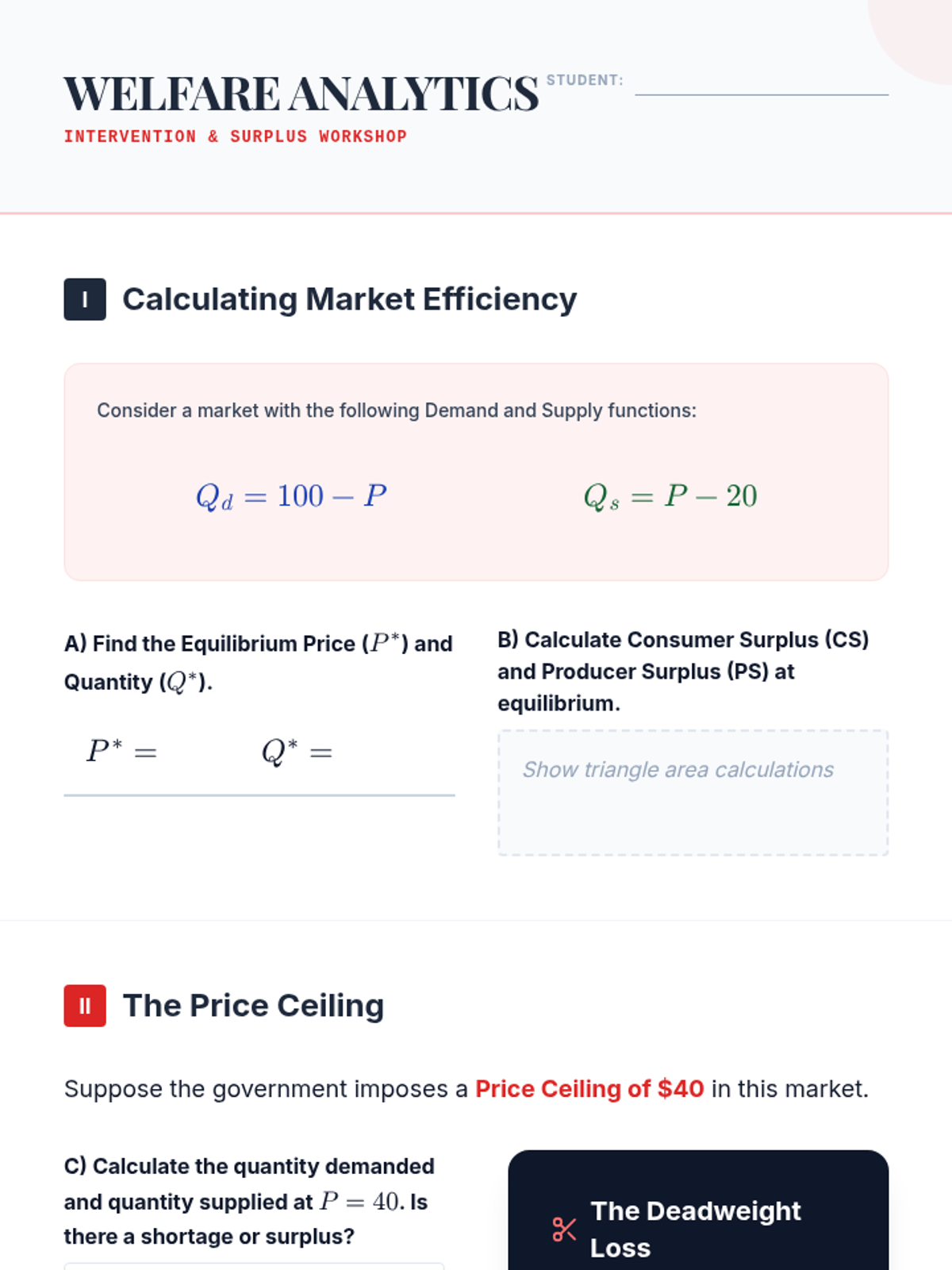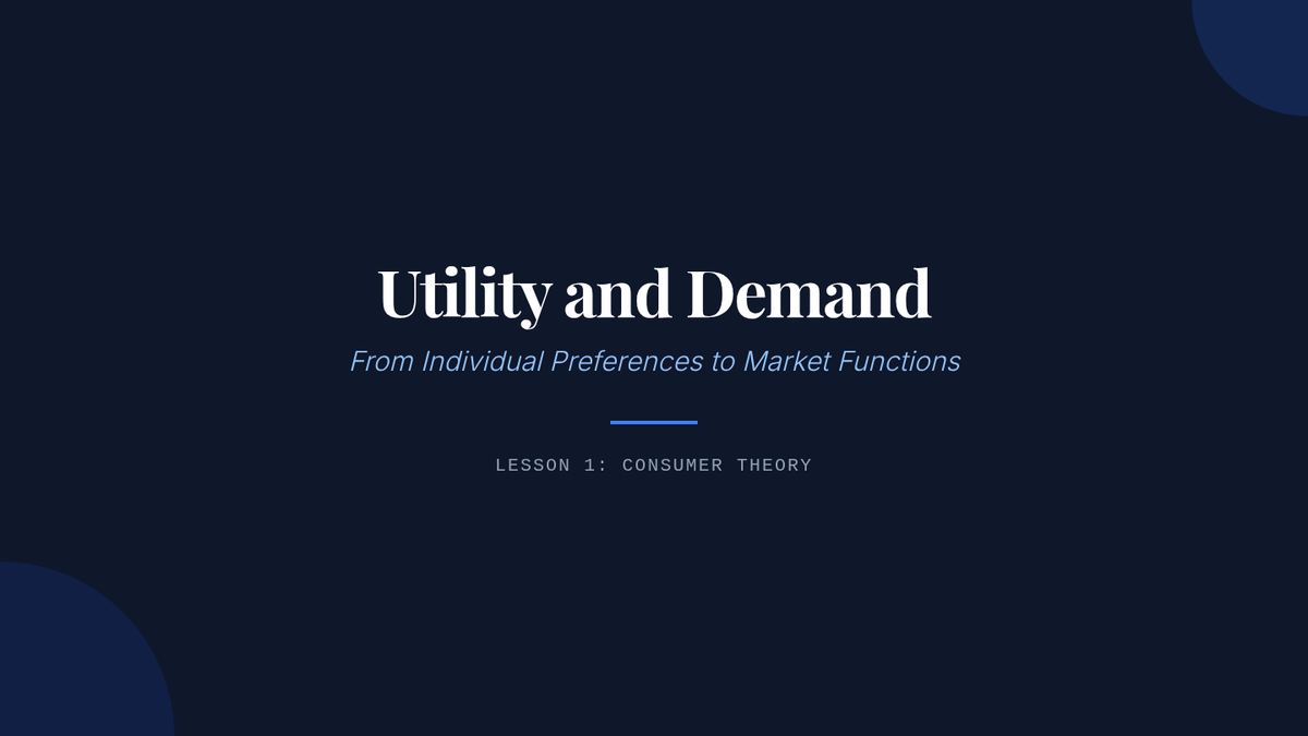 This sequence provides a rigorous undergraduate-level exploration of microeconomic principles, focusing on the mathematical derivation of demand and supply, the emergence of market equilibrium, and the welfare implications of various economic policies. Students will move from individual consumer and firm behavior to aggregate market dynamics and intervention analysis.