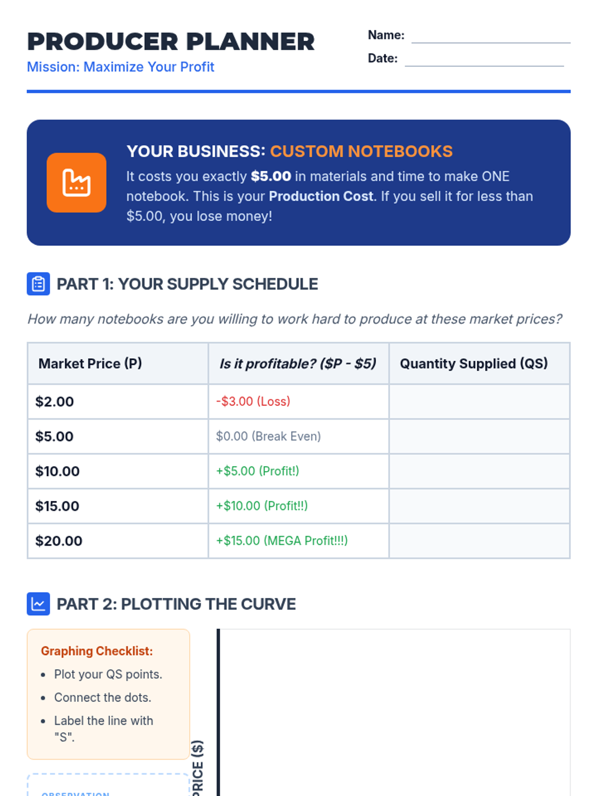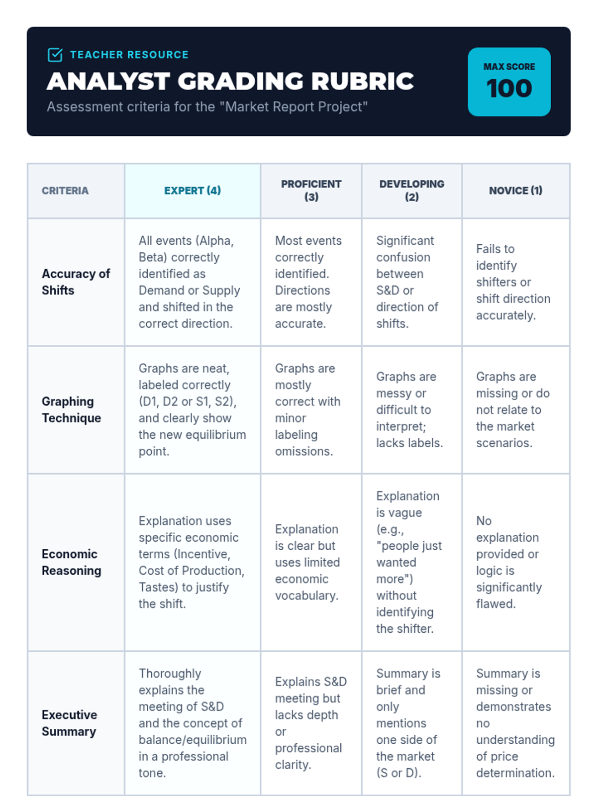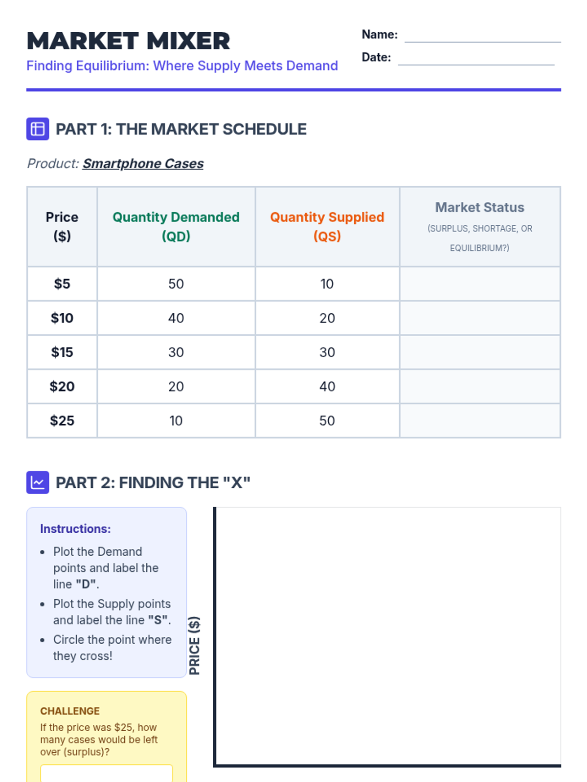 A 5-lesson unit for 6th-grade students exploring the fundamental laws of supply and demand. Students move from individual perspectives of buyers and sellers to understanding market equilibrium and the impact of external shifters through simulations, graphing activities, and real-world case studies.