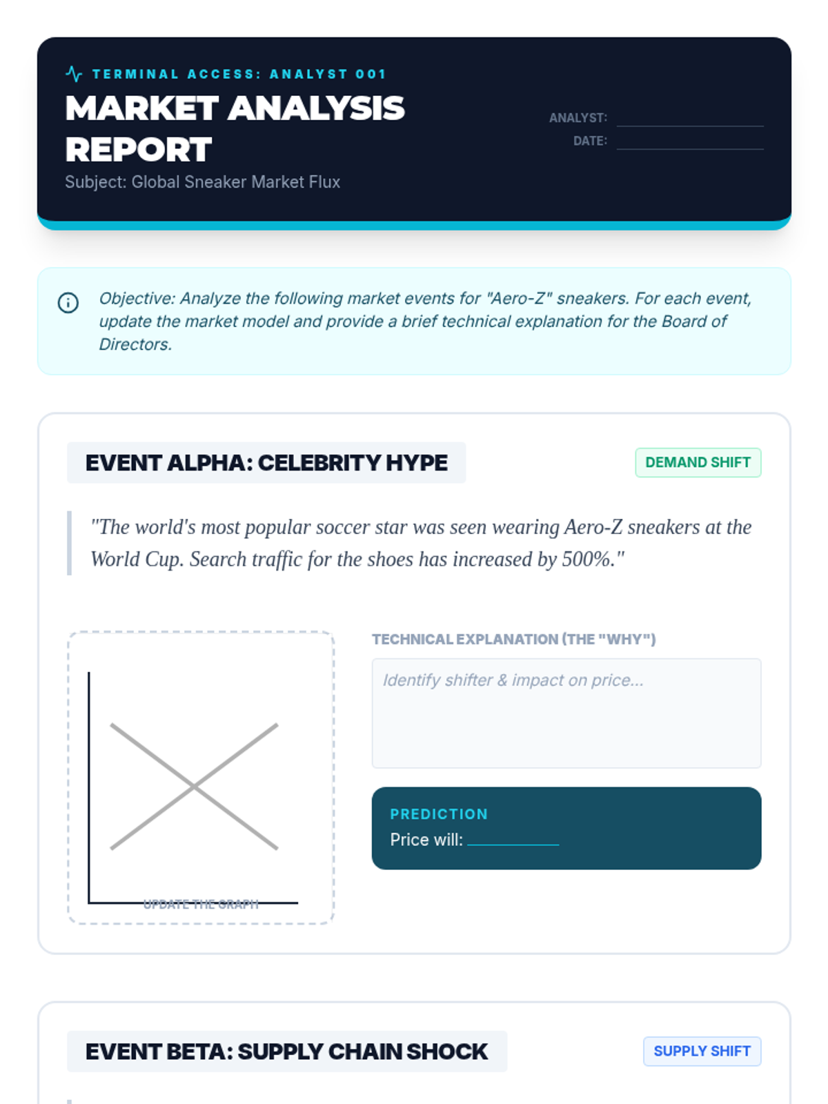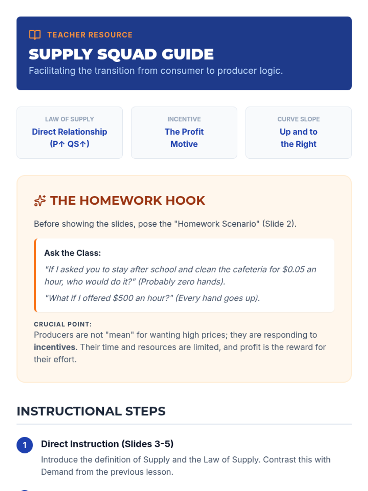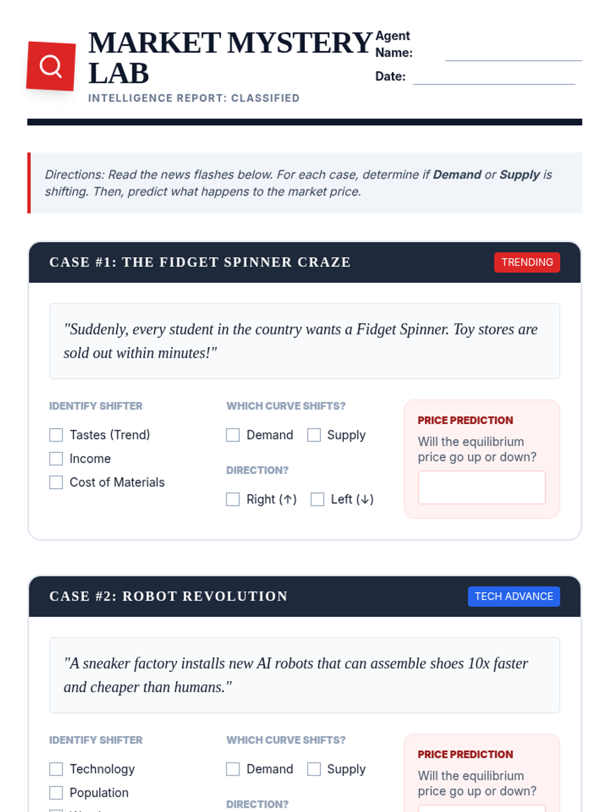 A 5-lesson unit for 6th-grade students exploring the fundamental laws of supply and demand. Students move from individual perspectives of buyers and sellers to understanding market equilibrium and the impact of external shifters through simulations, graphing activities, and real-world case studies.