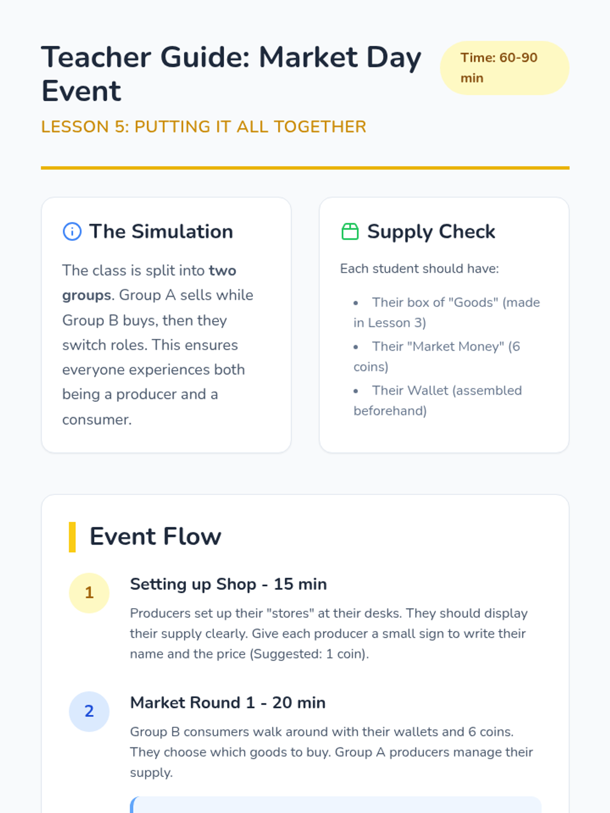 This 1st Grade sequence introduces the fundamentals of economics by exploring how money is earned through work, the difference between goods and services, and the importance of saving for the future. Students engage in classroom simulations and goal-setting to make abstract financial concepts concrete and actionable.
