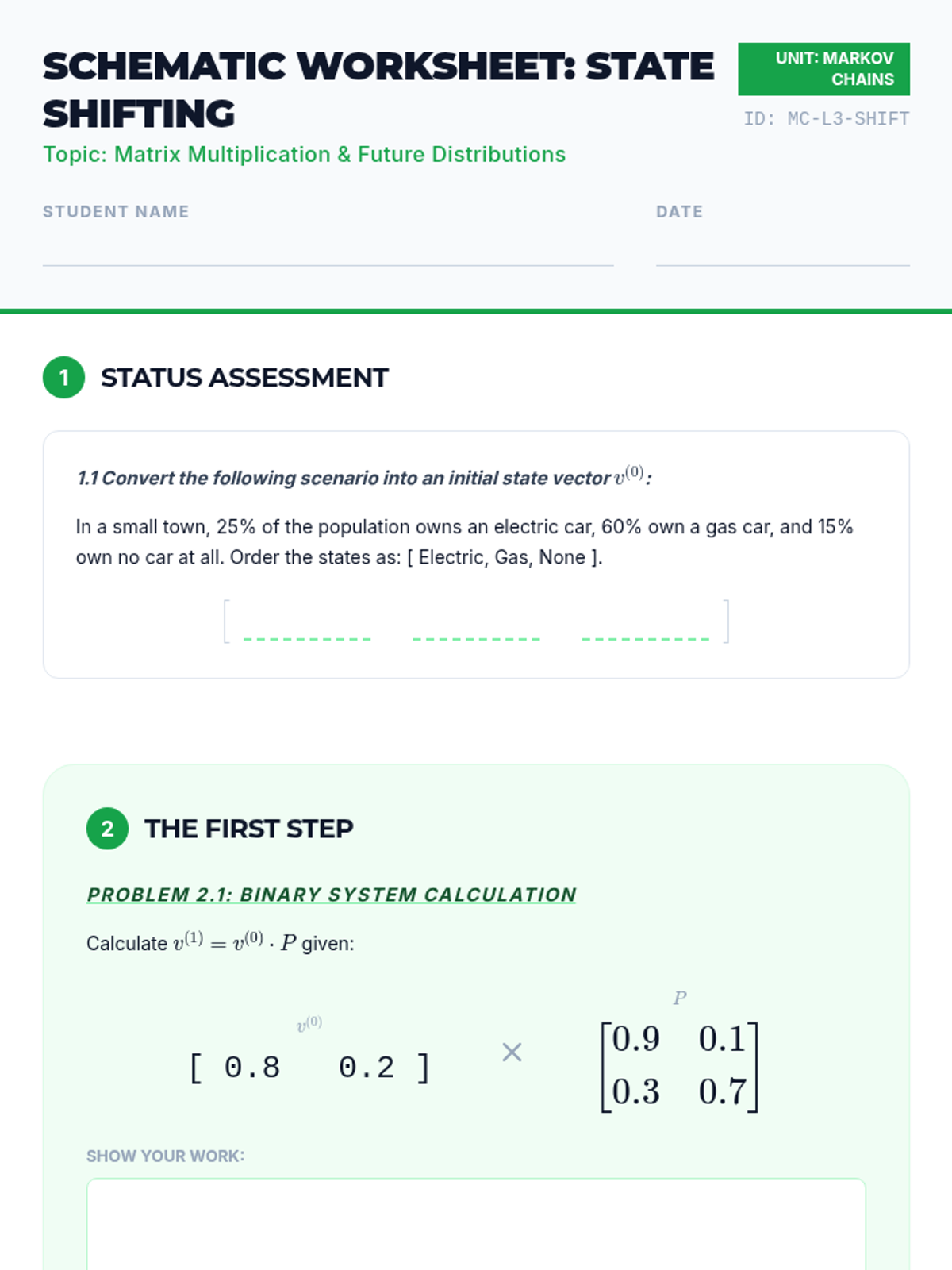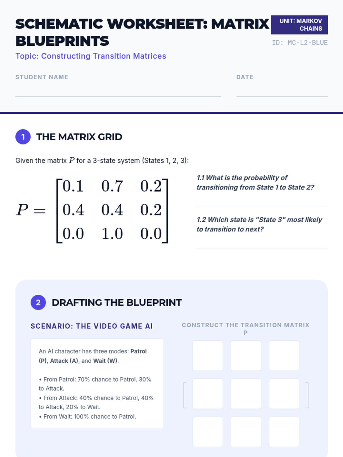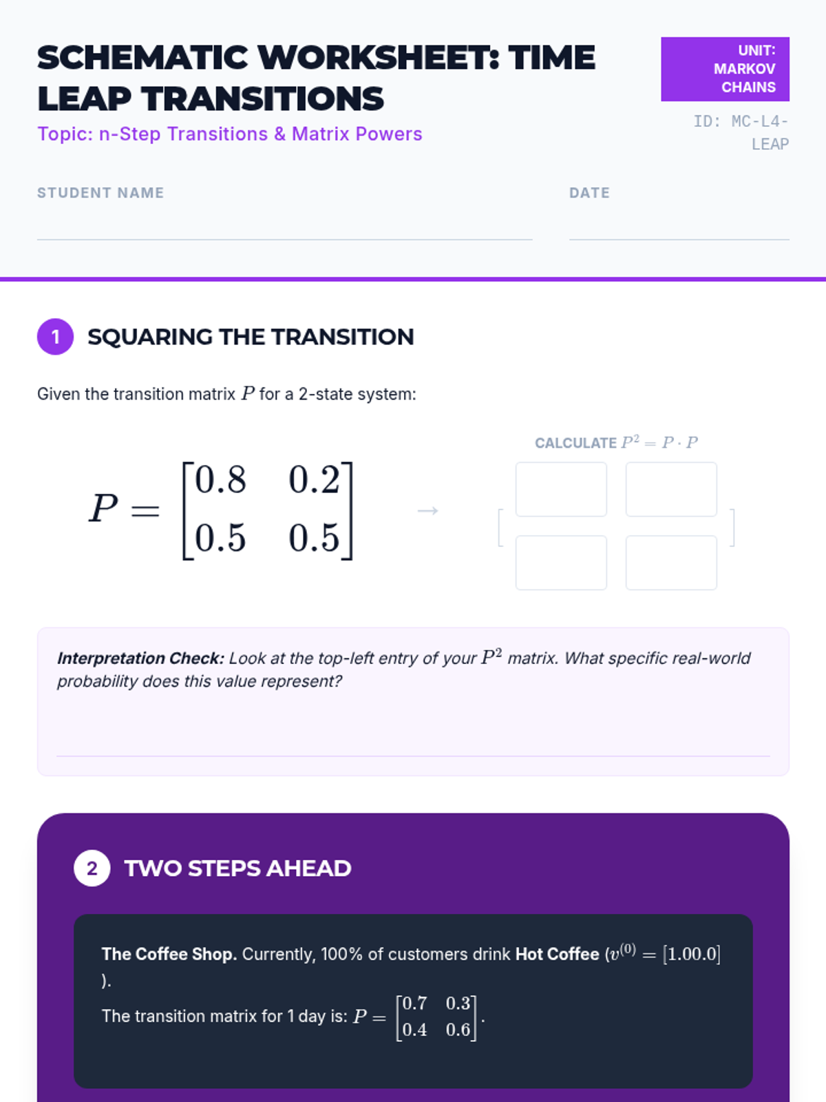 A comprehensive sequence for 12th-grade students on discrete-time Markov chains, covering state diagrams, transition matrices, and n-step probability calculations using matrix algebra.