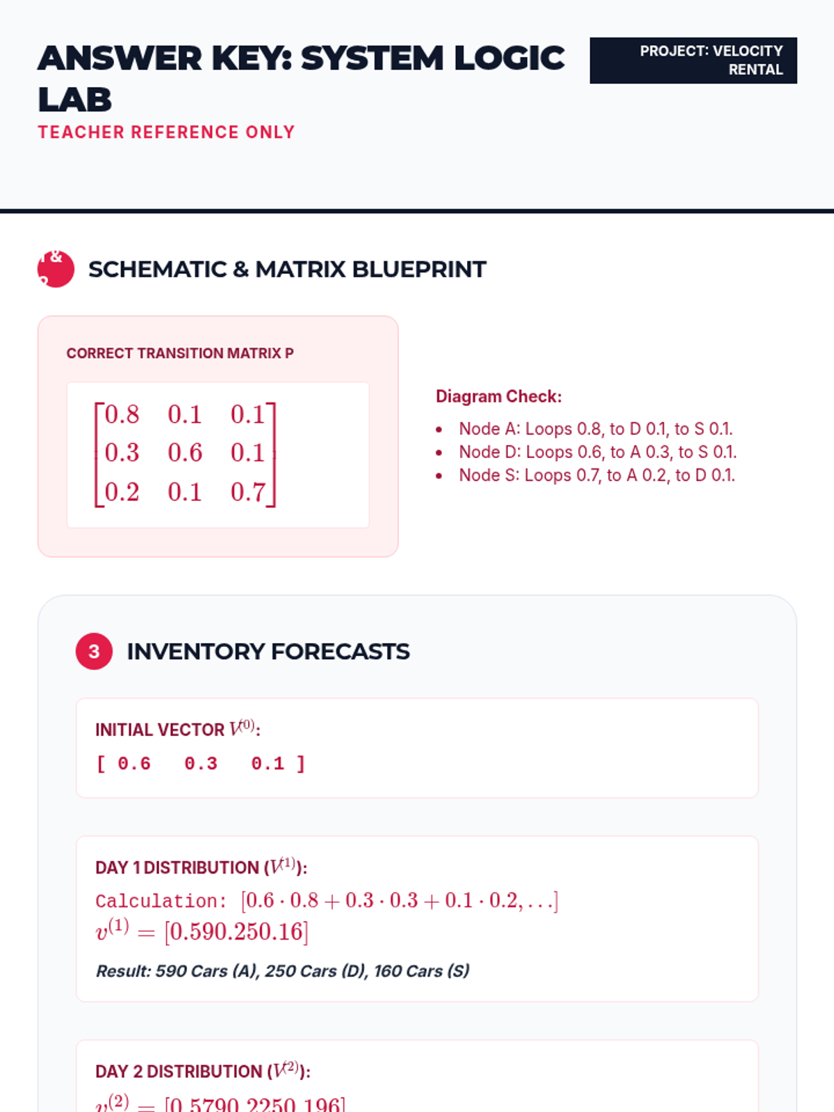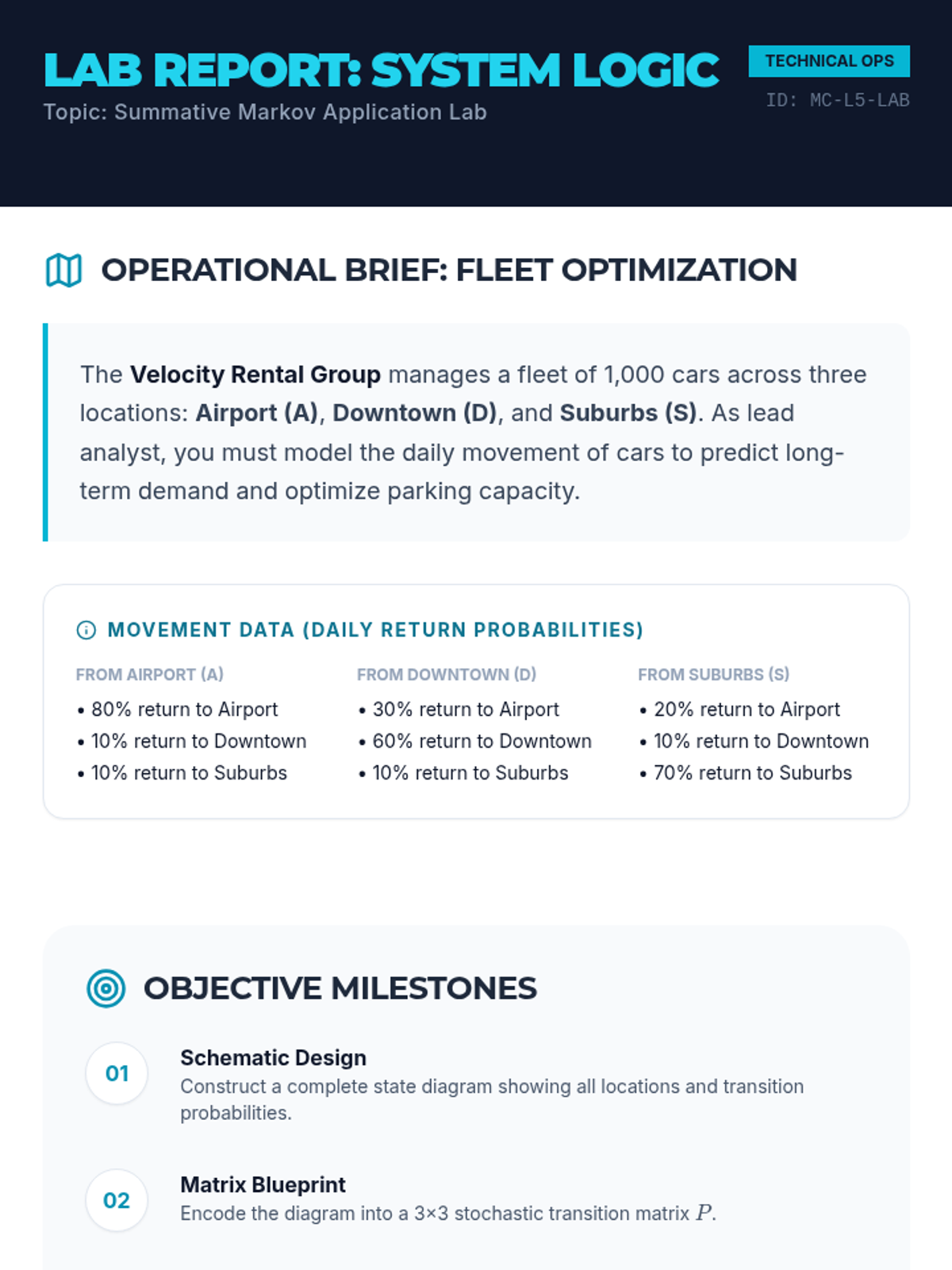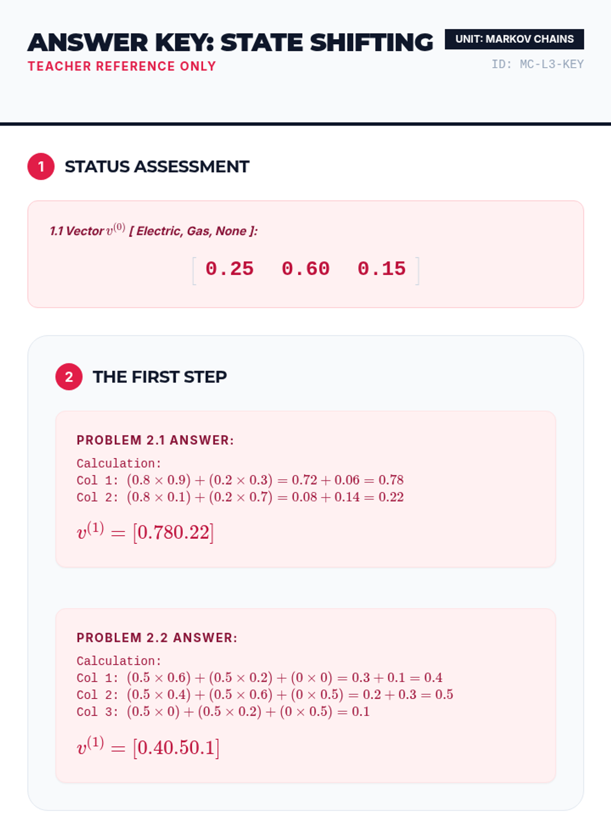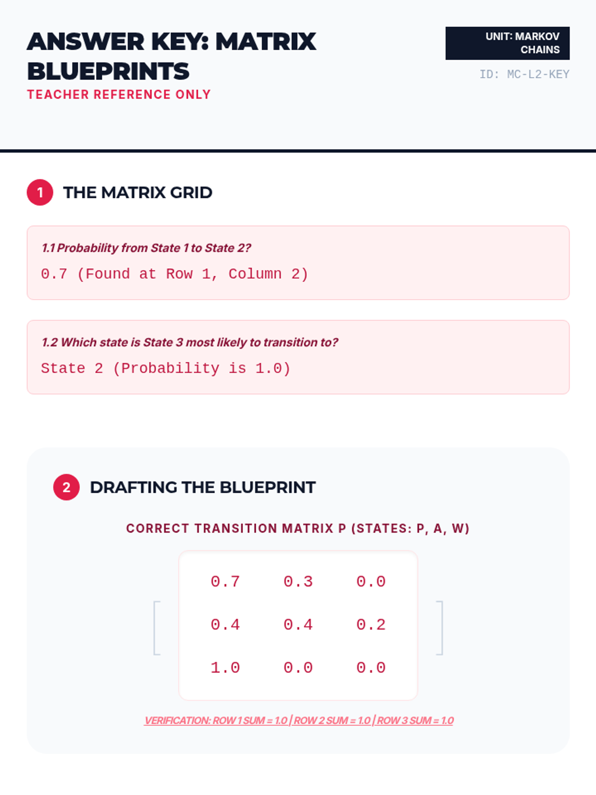 A comprehensive sequence for 12th-grade students on discrete-time Markov chains, covering state diagrams, transition matrices, and n-step probability calculations using matrix algebra.