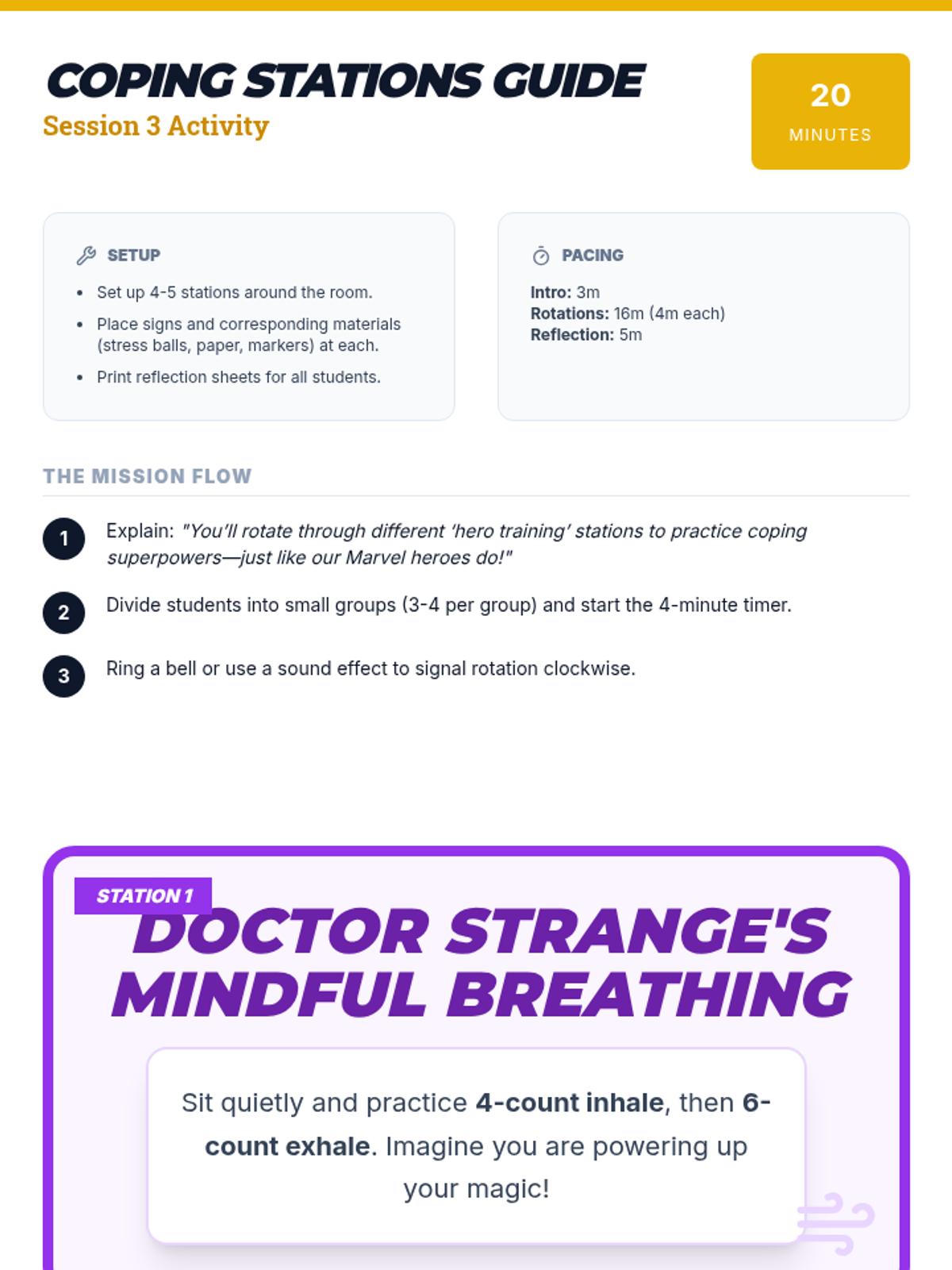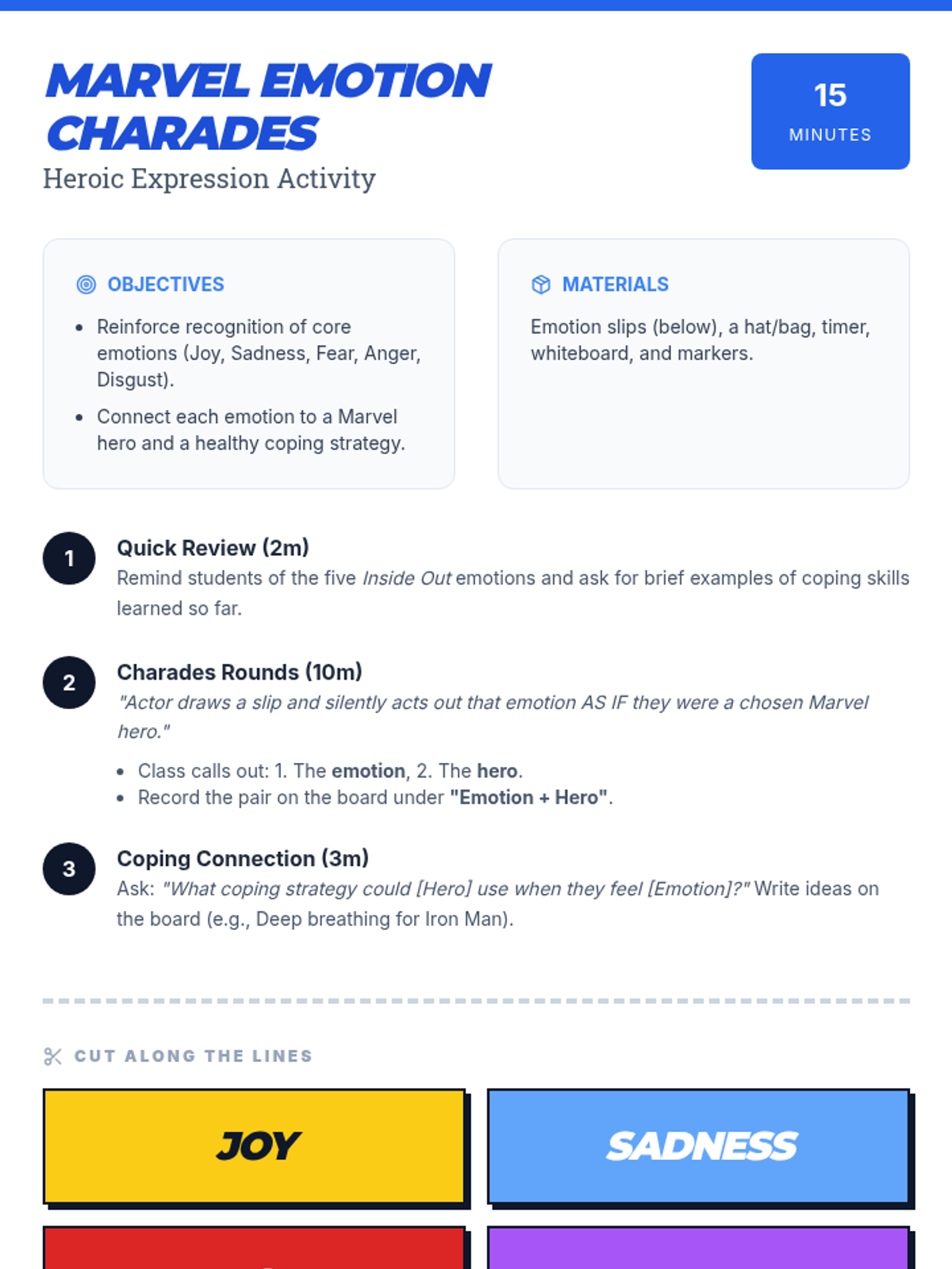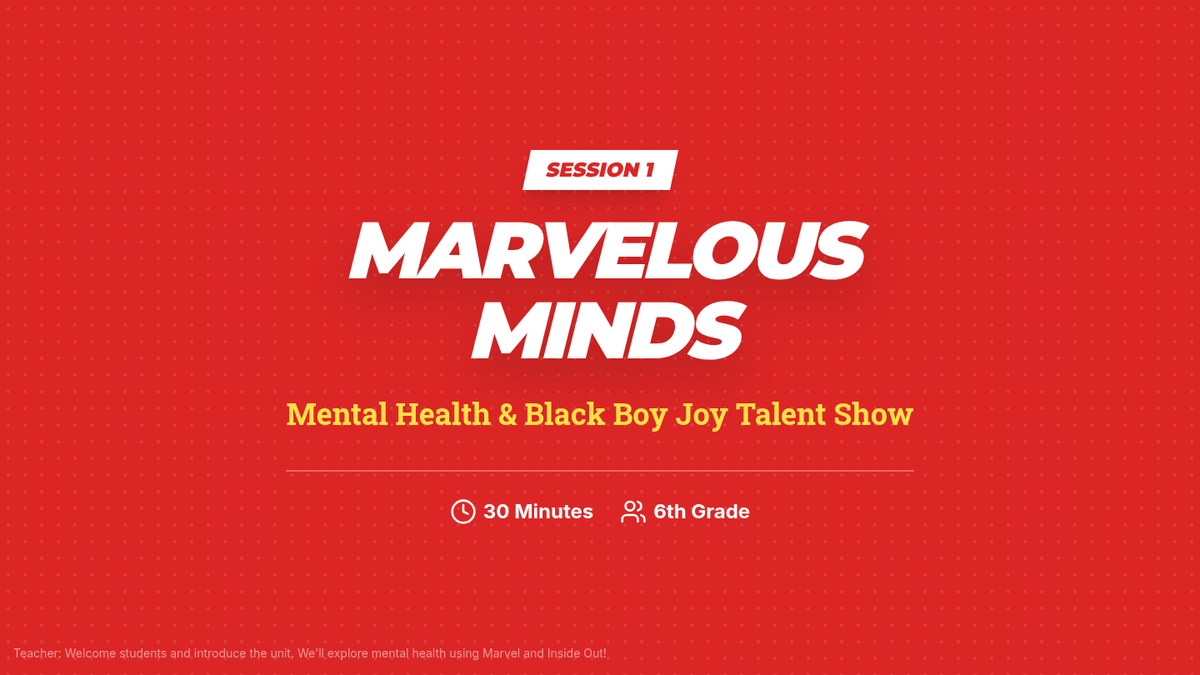 A 4-session mental health unit for 6th graders that uses Marvel heroes and Inside Out to explore emotions, strengths, and coping strategies. The unit culminates in a Black Boy Joy talent showcase during Mental Health Awareness Month.